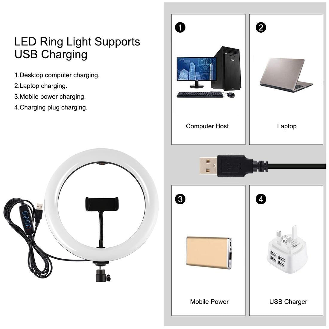 • Portable LED ring light with adjustable tripod stand and 360-degree rotating ball head for versatile use