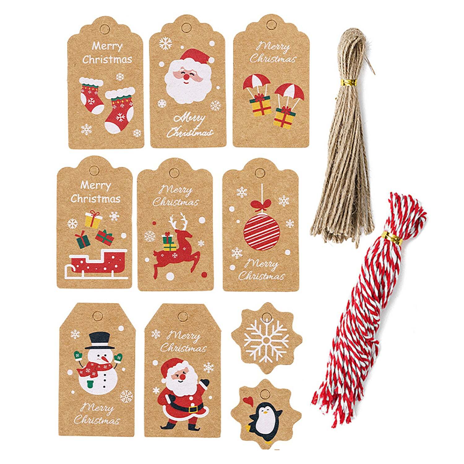 Easy Attachment: The tags come with pre-punched holes for easy attachment. You can use the included 50 pieces of jute twine and 50 pieces of red and white cotton string, each measuring 25CM long, to tie the tags securely to your presents.
