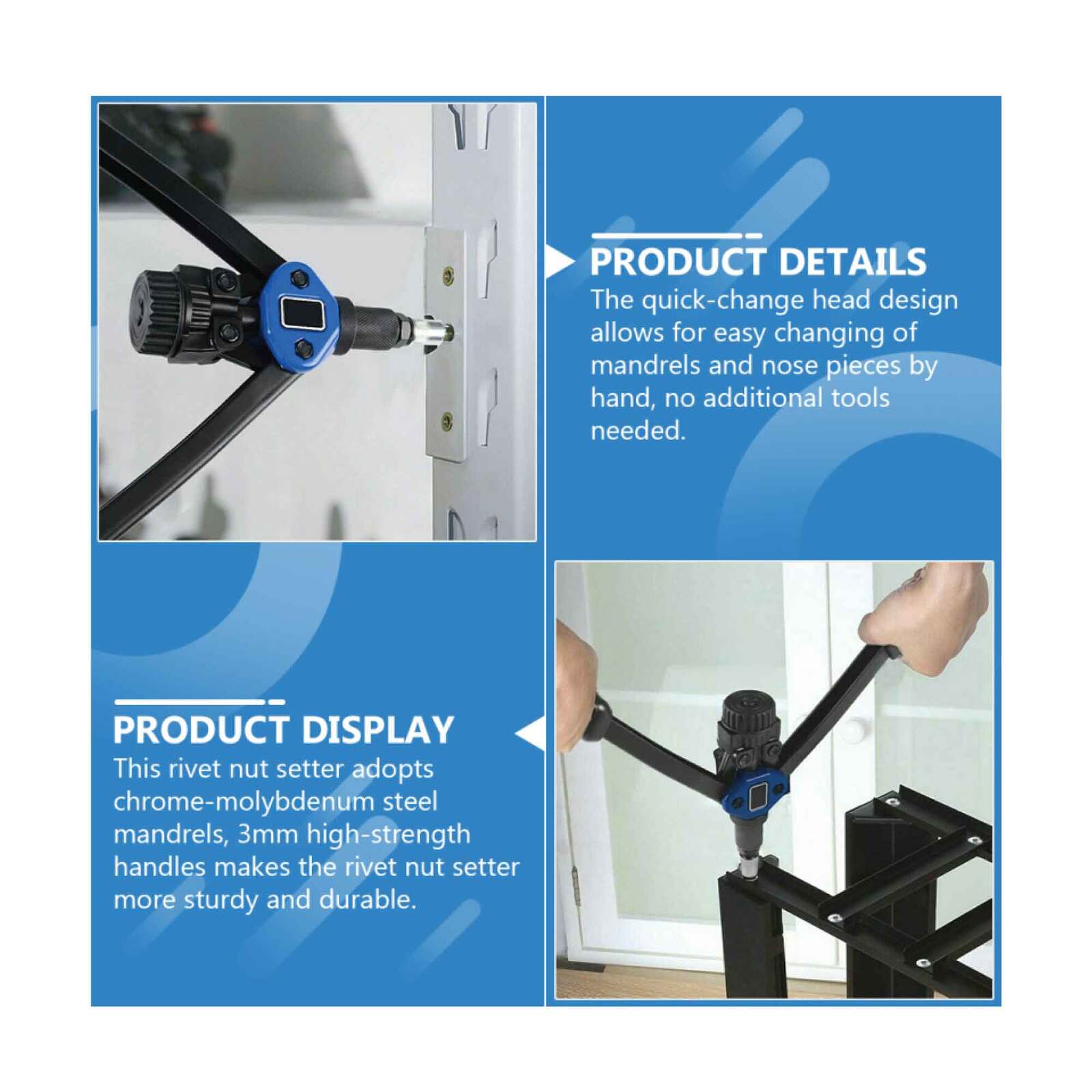 - Advanced Material: This rivet nut gun adopts chrome-molybdenum steel mandrels, 3mm high-strength handles makes the rivet nut gun more sturdy and durable