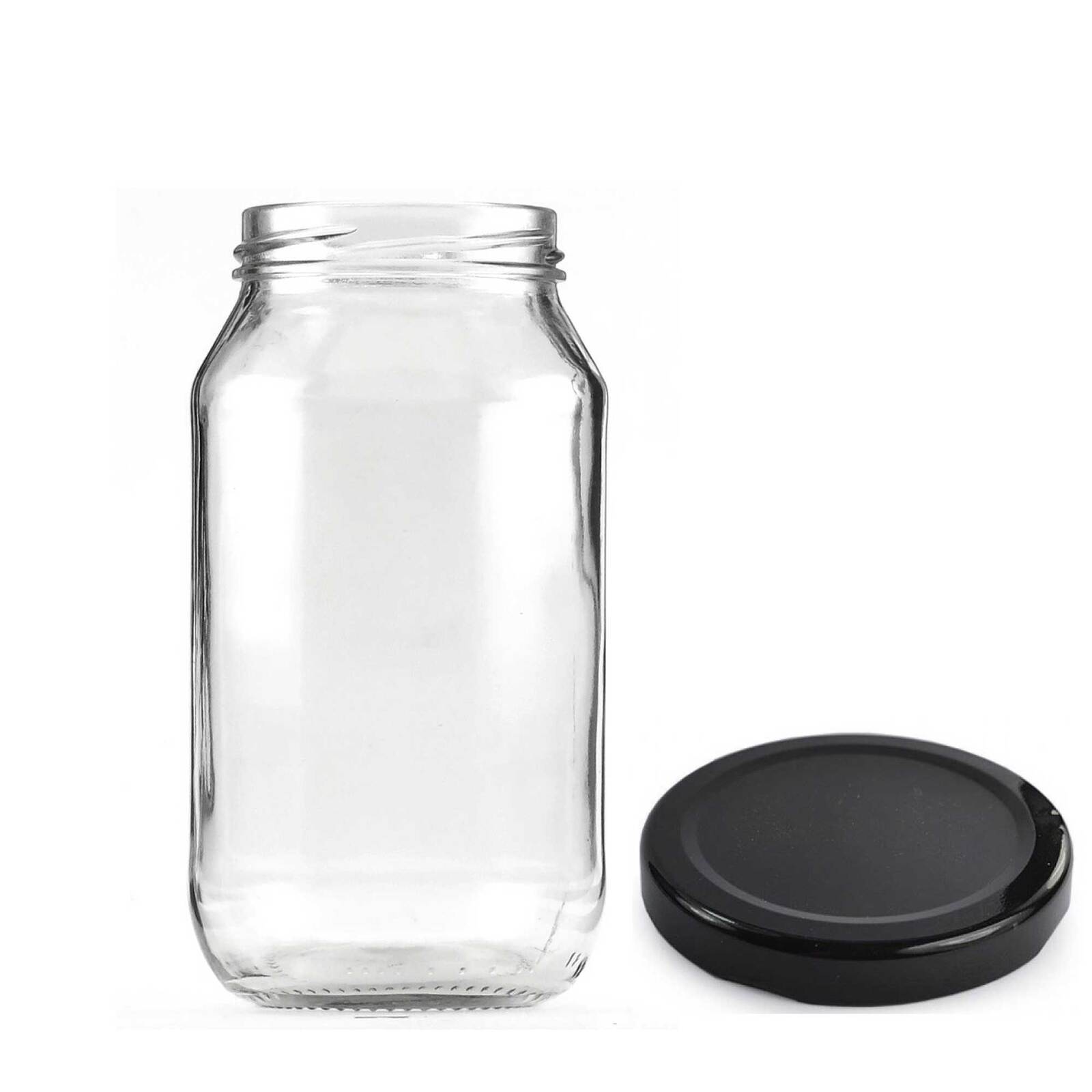 Empty 500ml Round Flint Glass Jars with black metal twist finish lids. Commonly used for food products, preserving, packaging, wedding favours or vases due to their wide neck finish. The closure has a puff compound for high acid resistance and can be used for cold or hot fill, either hand or machine applied.