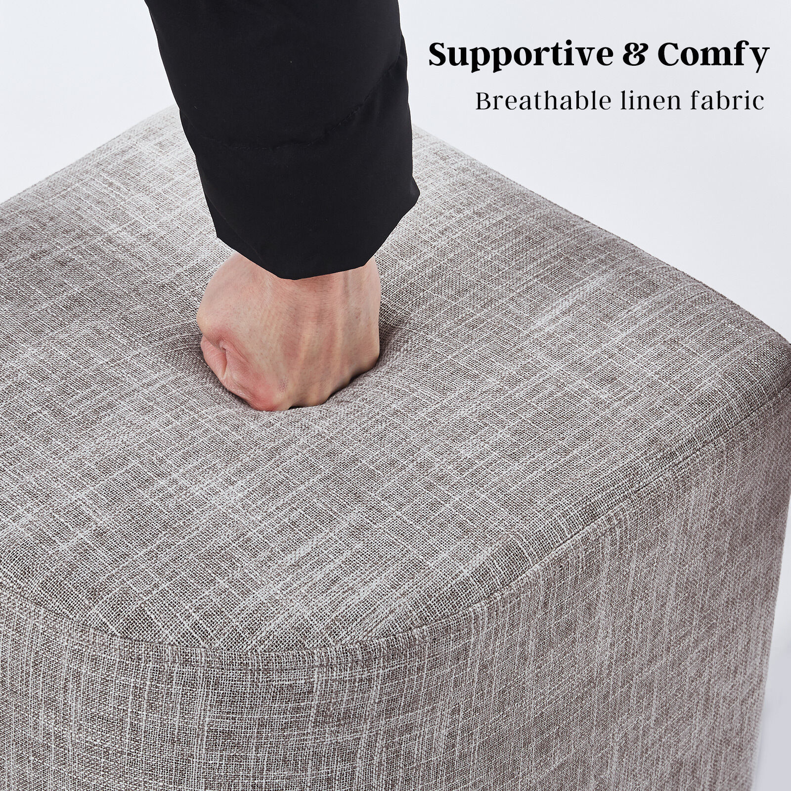 Crafted with breathable linen fabric, this ottoman ensures comfort and durability, allowing you to relax in style. Its modular design allows you to put two ottomans together for extended seating or table space.