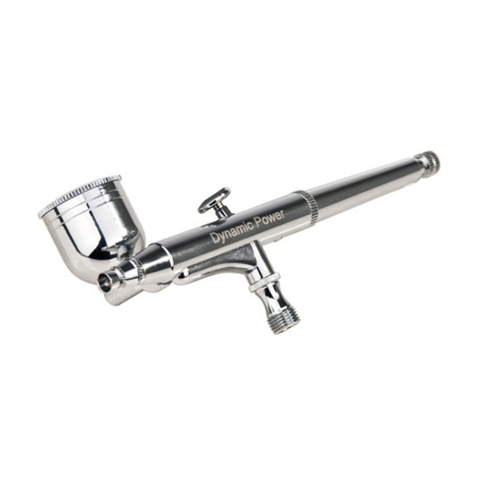 Dynamic Power Dual Action Gravity feed airbrush designed for quick changes of custom mixed colours. The trigger controls both air and colour (down for air, back for colour). This allows the artist to change the width of the line, the range of value and the opacity of paint without stopping their hand motion. Perfect for general purpose art and craft projects as well as cosmetics, fingernail art, model railroad detailing, R/C car bodies, and automotive airbrushing.