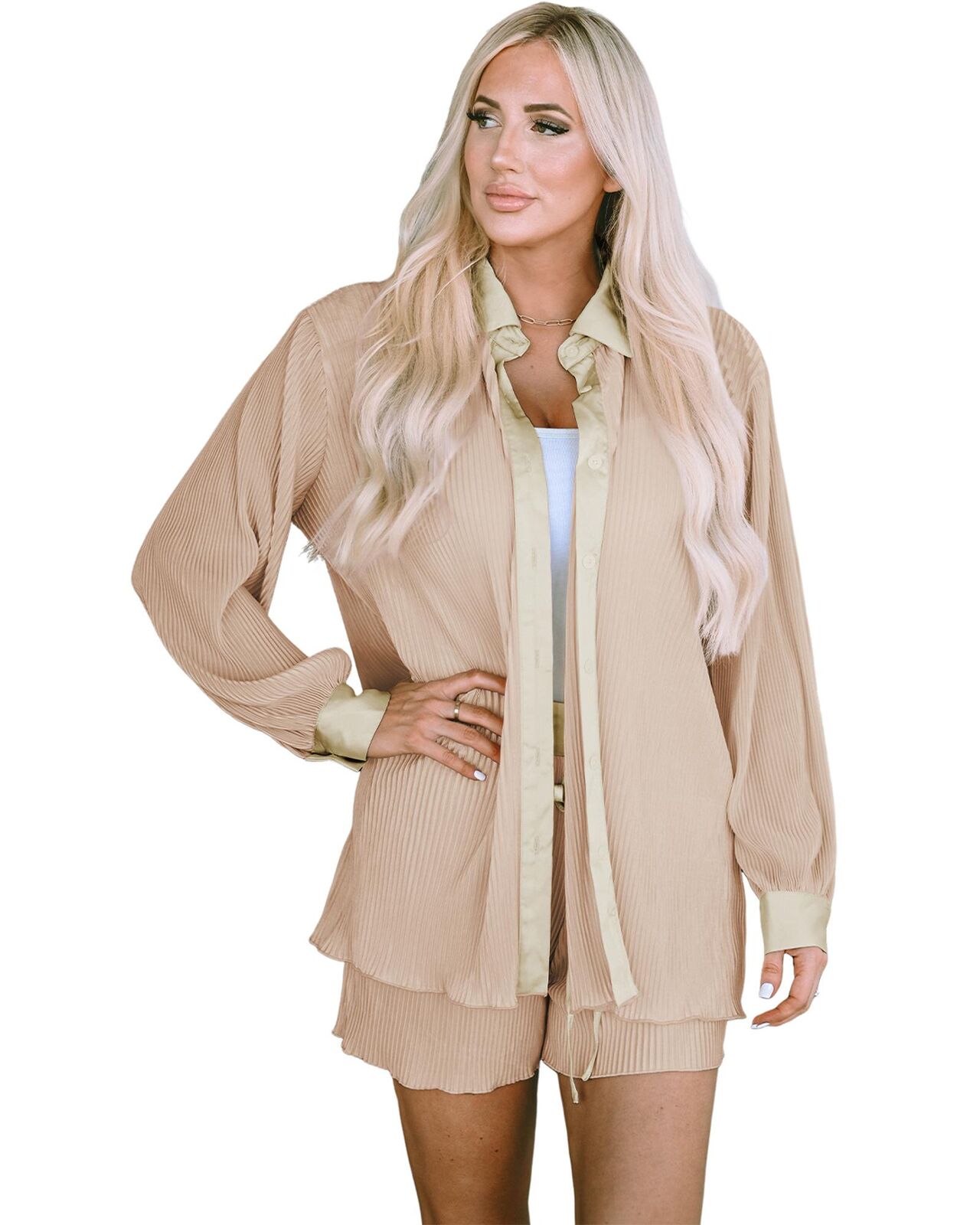 • Pleated details on the shirt and shorts