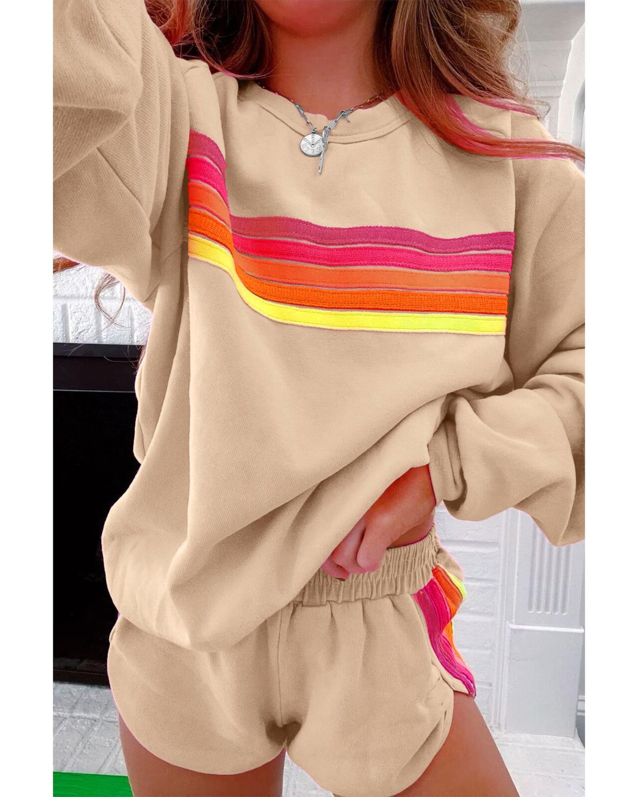 • Coordinating shorts creating a cohesive look