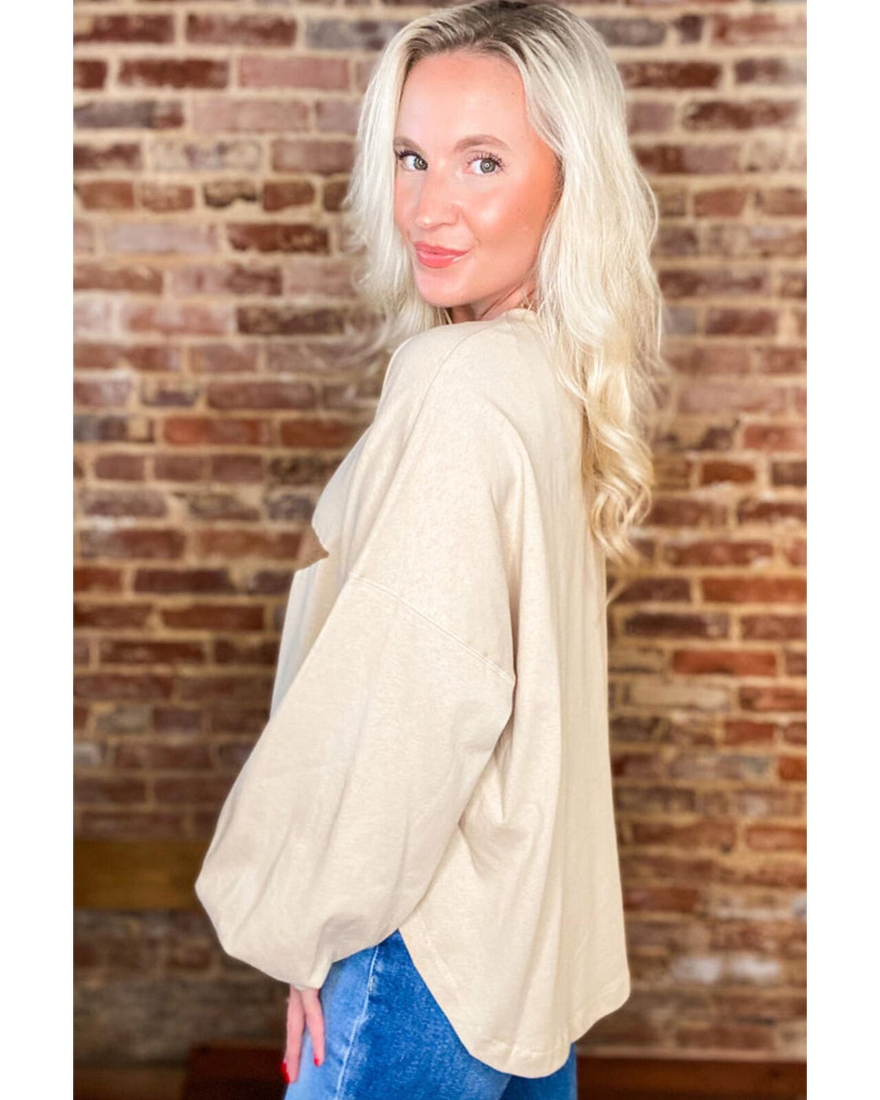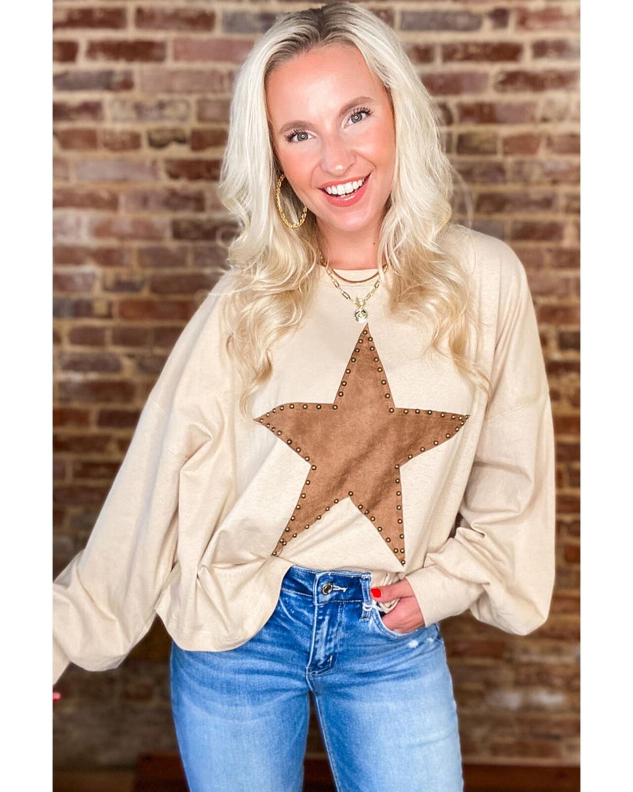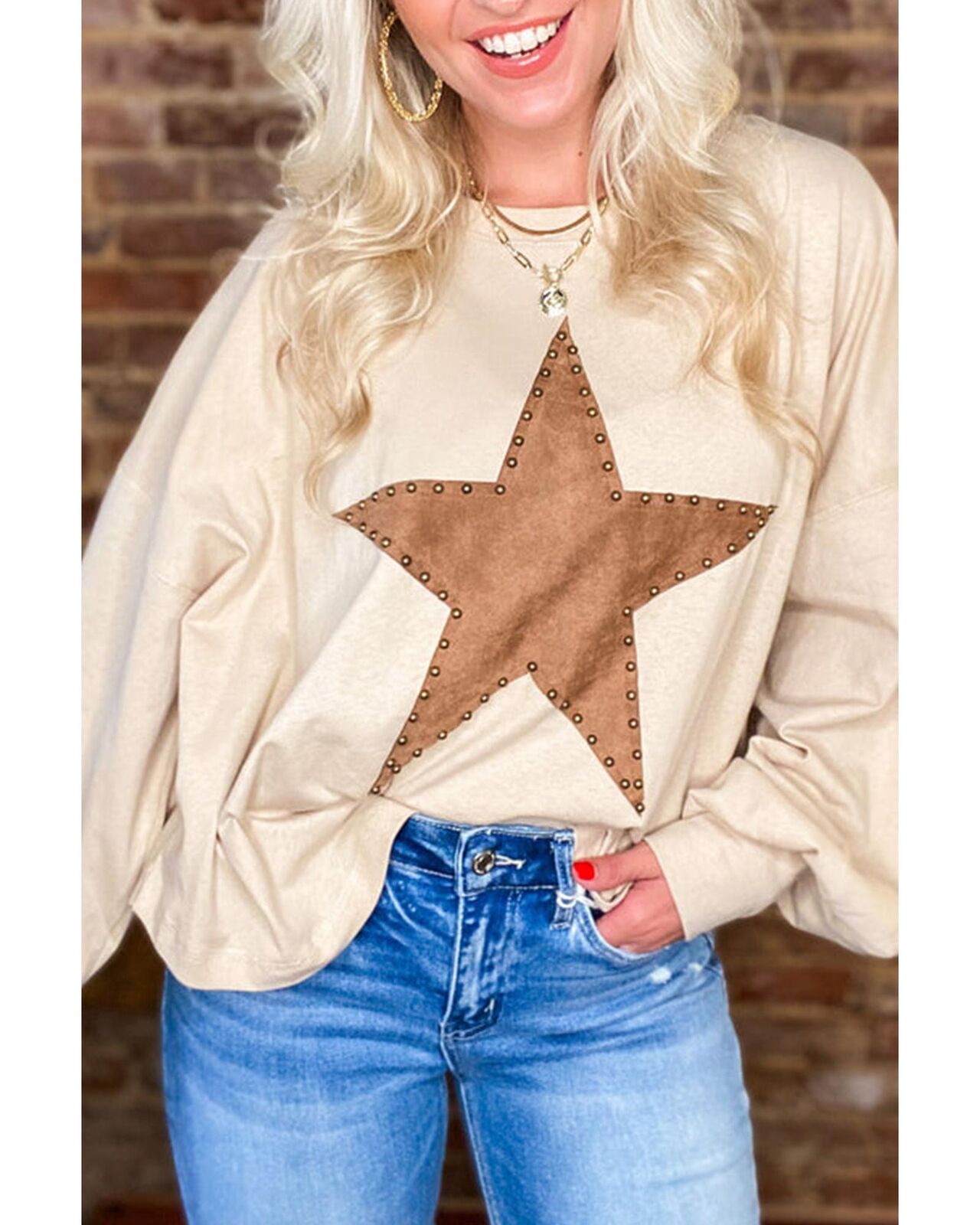 • Apricot Studded Star Graphic Oversized Long Sleeve Top