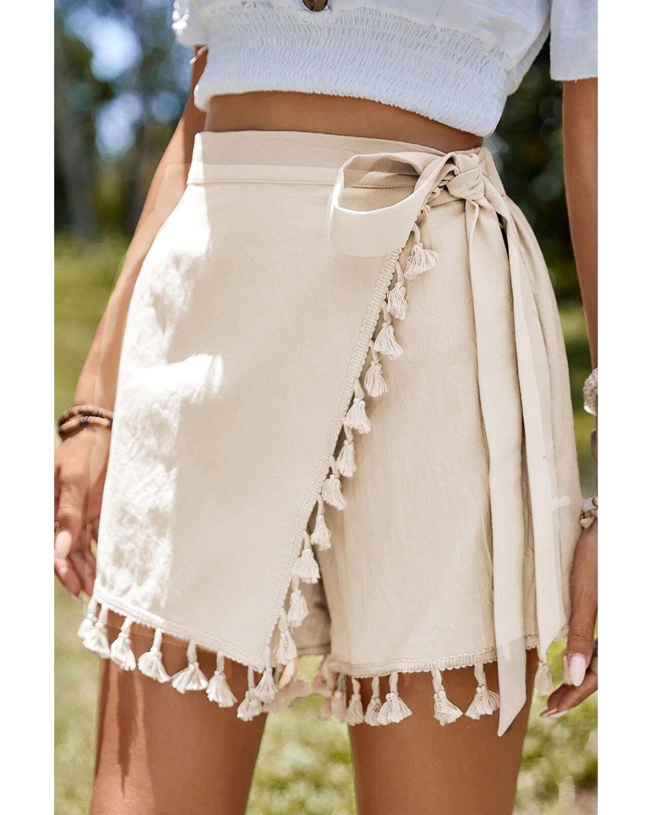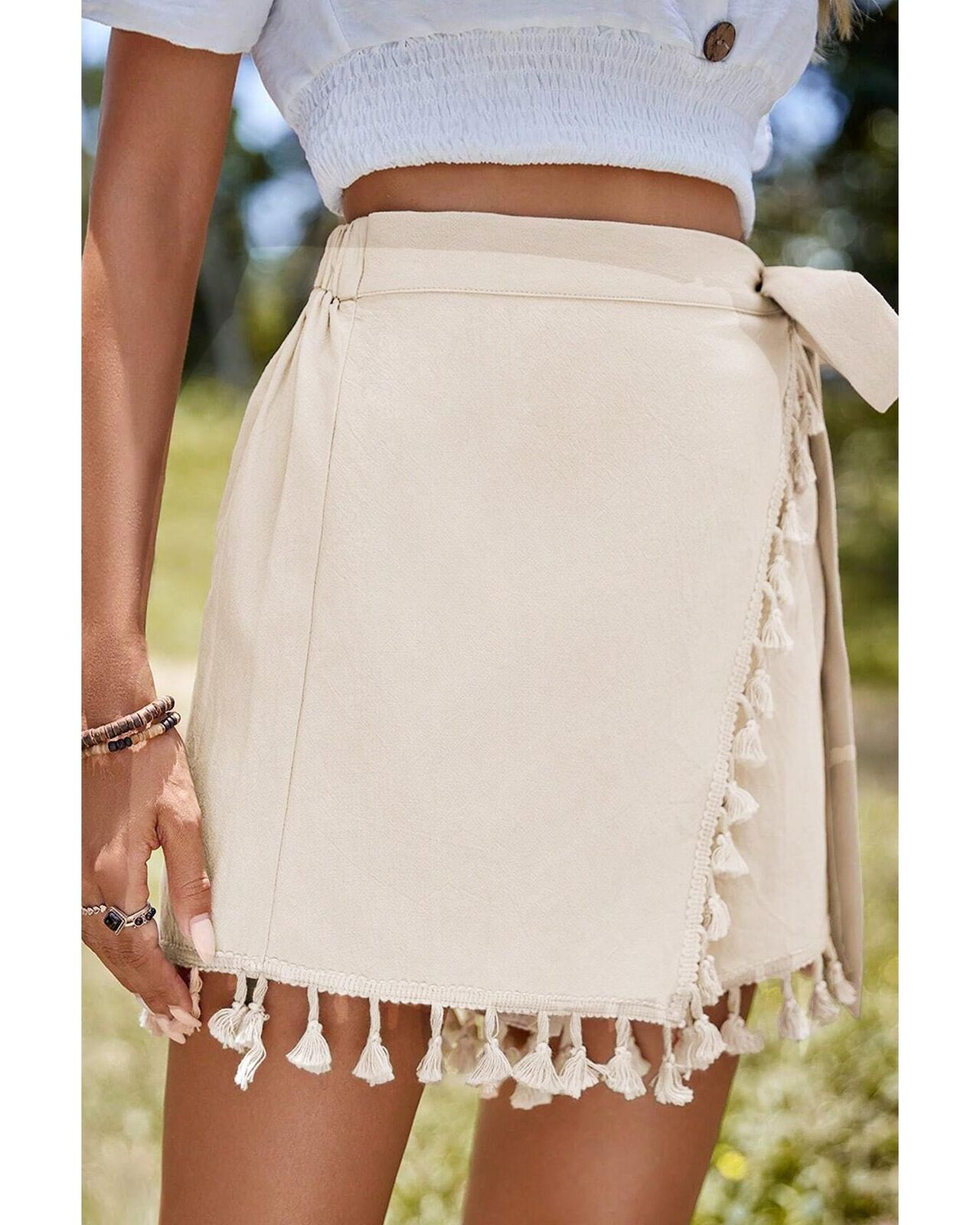 • Apricot Tassel Trim Wrap Knot Side Bohemian Style Mini Skort