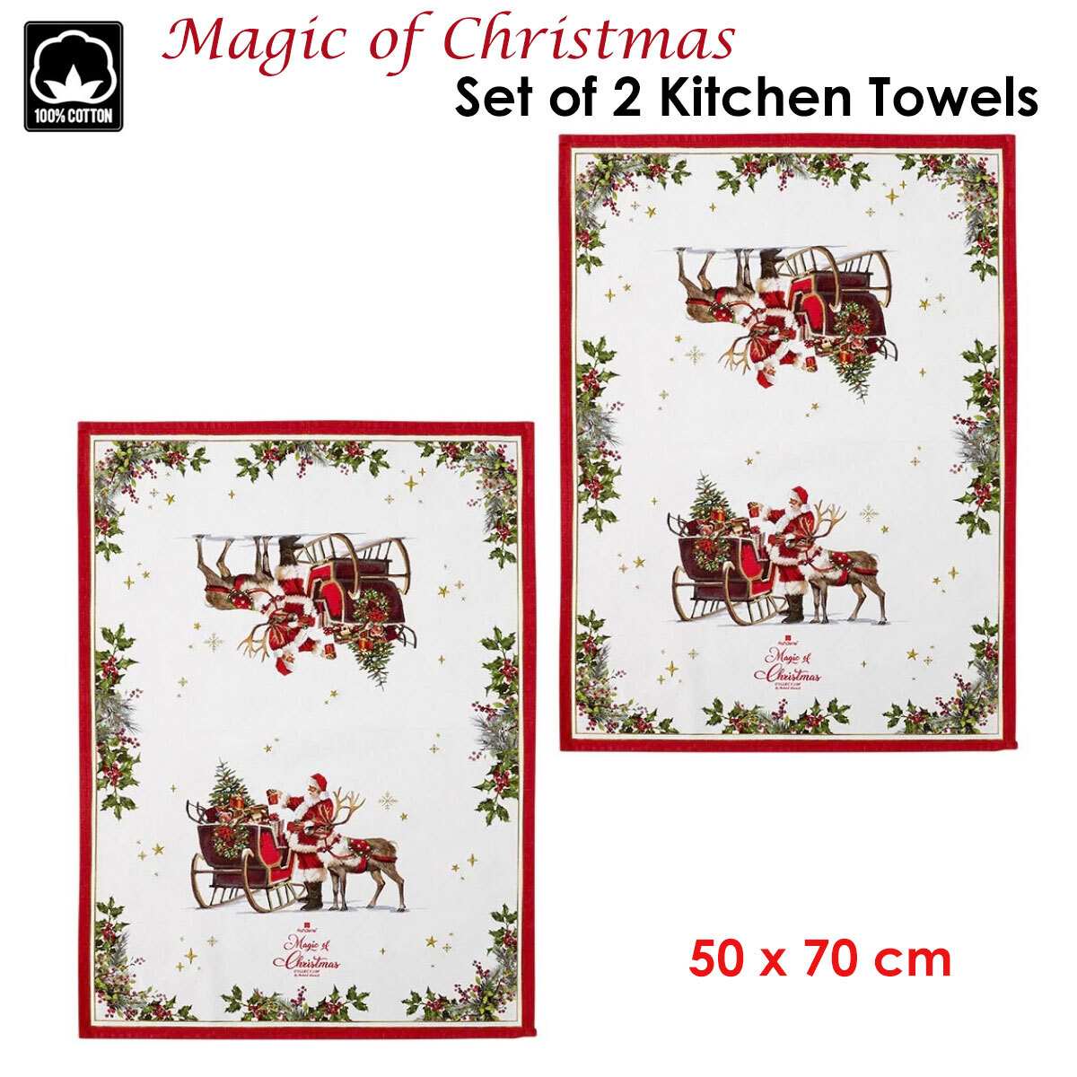 Add a jolly style and festive flair to your kitchen decor this holiday season with this Magic of Christmas by Richard Macneil Set of 2 Cotton Kitchen Towels 50 x 70 cm by Ashdene. It features Santa Claus filling up his sleigh with gifts and a reindeer on this side watching. It comes in energetic colour tones of taupe, white, red, brown, green, yellow, and black that will add an instant Christmas accent to any kitchen. It is made from quality and easy care 100% Cotton fabric. These kitchen towels are 100% AZO free dyes and made to European Quality Standards.