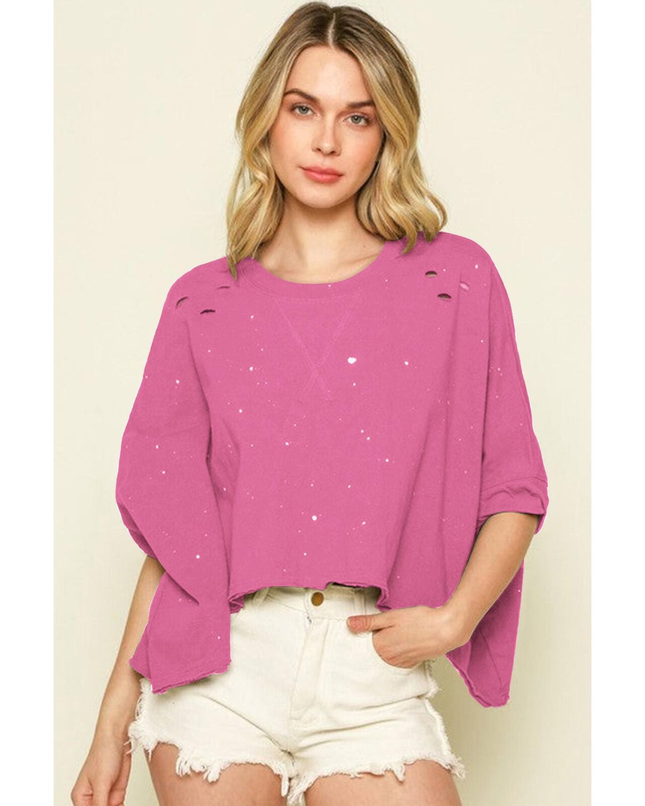 • Trendy and stylish Distressed Bleached Asymmetric Hem Short Sleeve Top