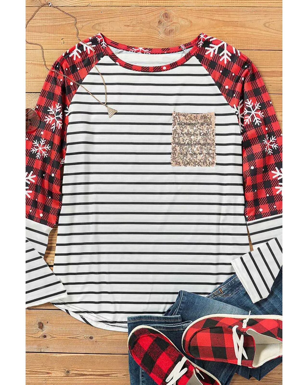 • Stylish Stripe Christmas Plaid Striped Patchwork Long Sleeve Top