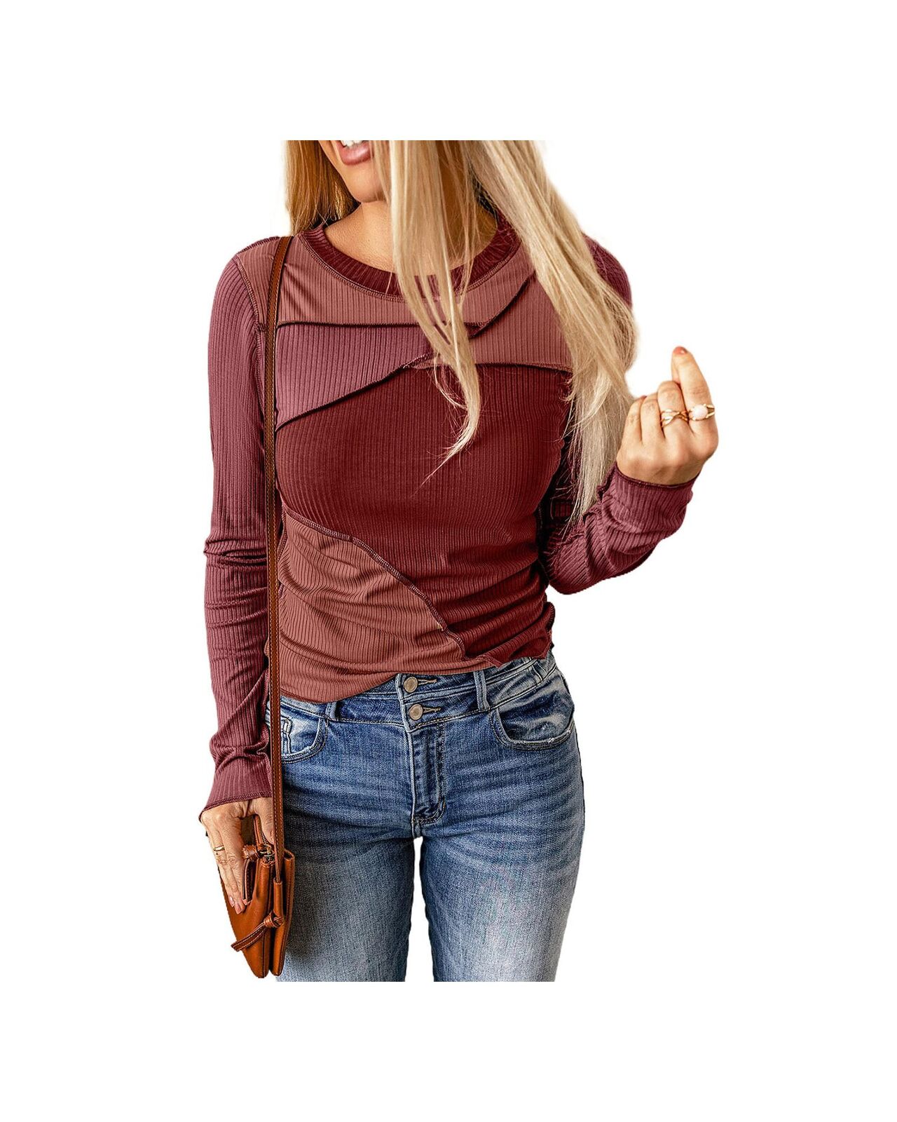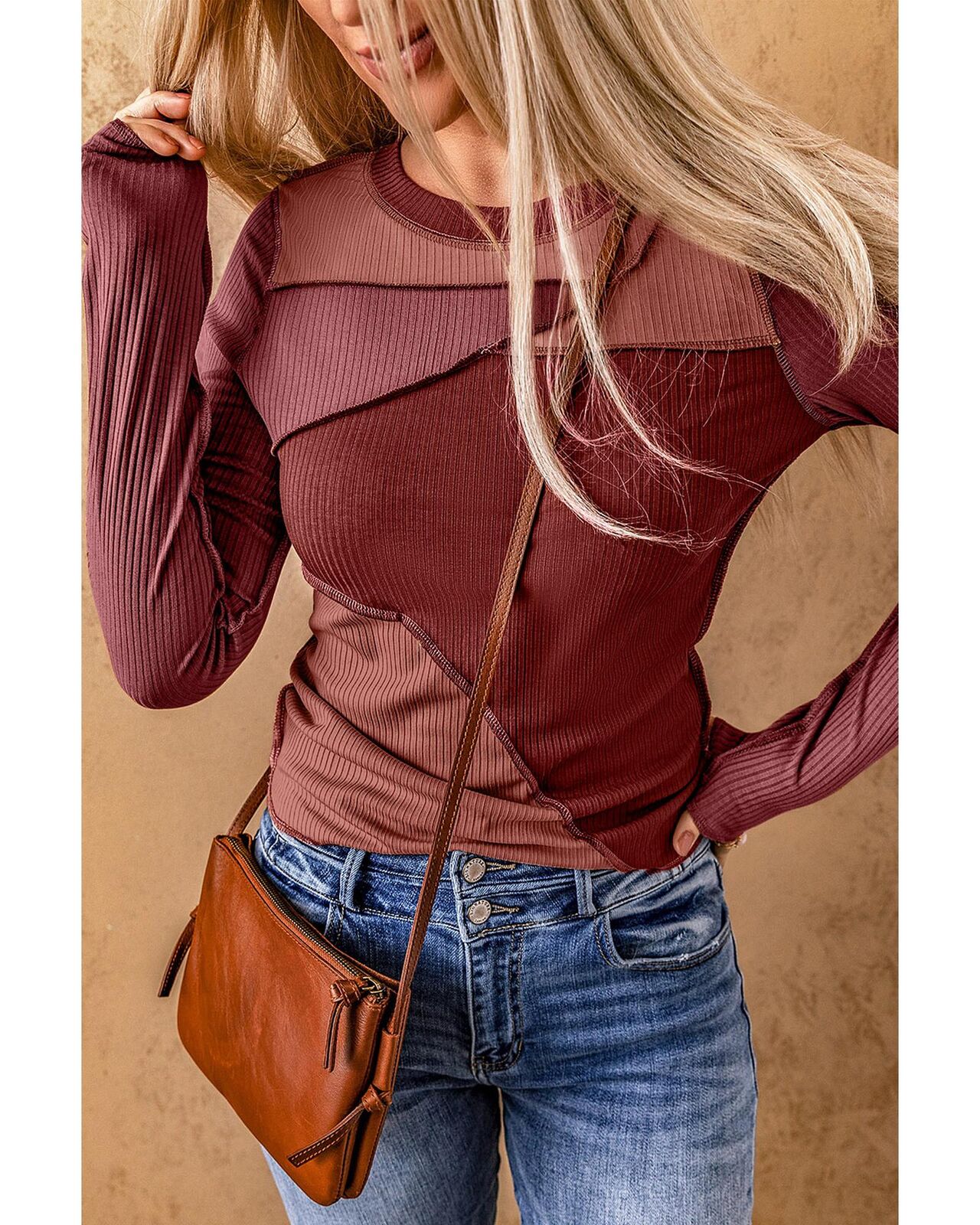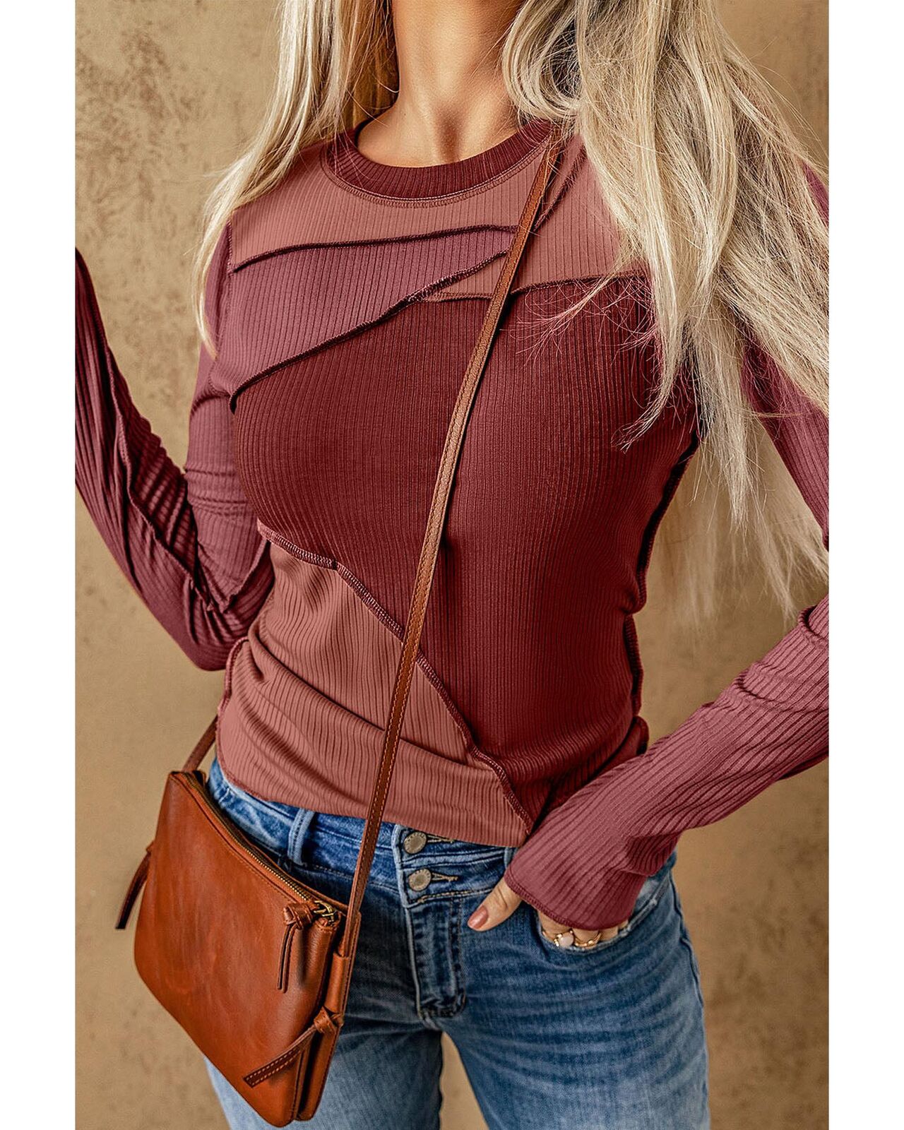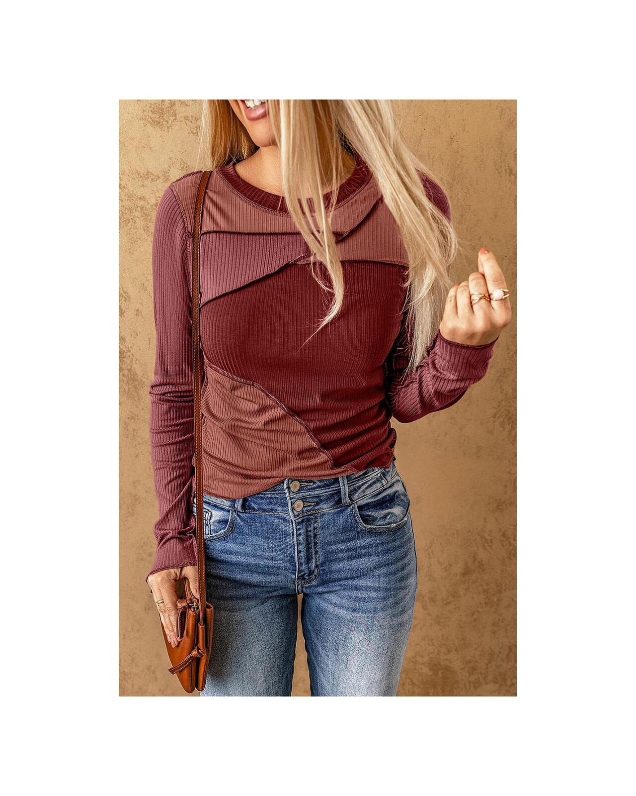 • Ribbed knit top with color blocking and exposed seams