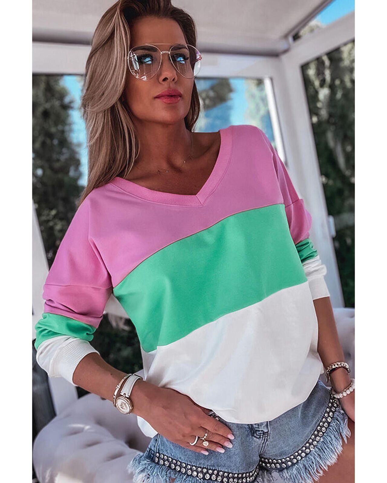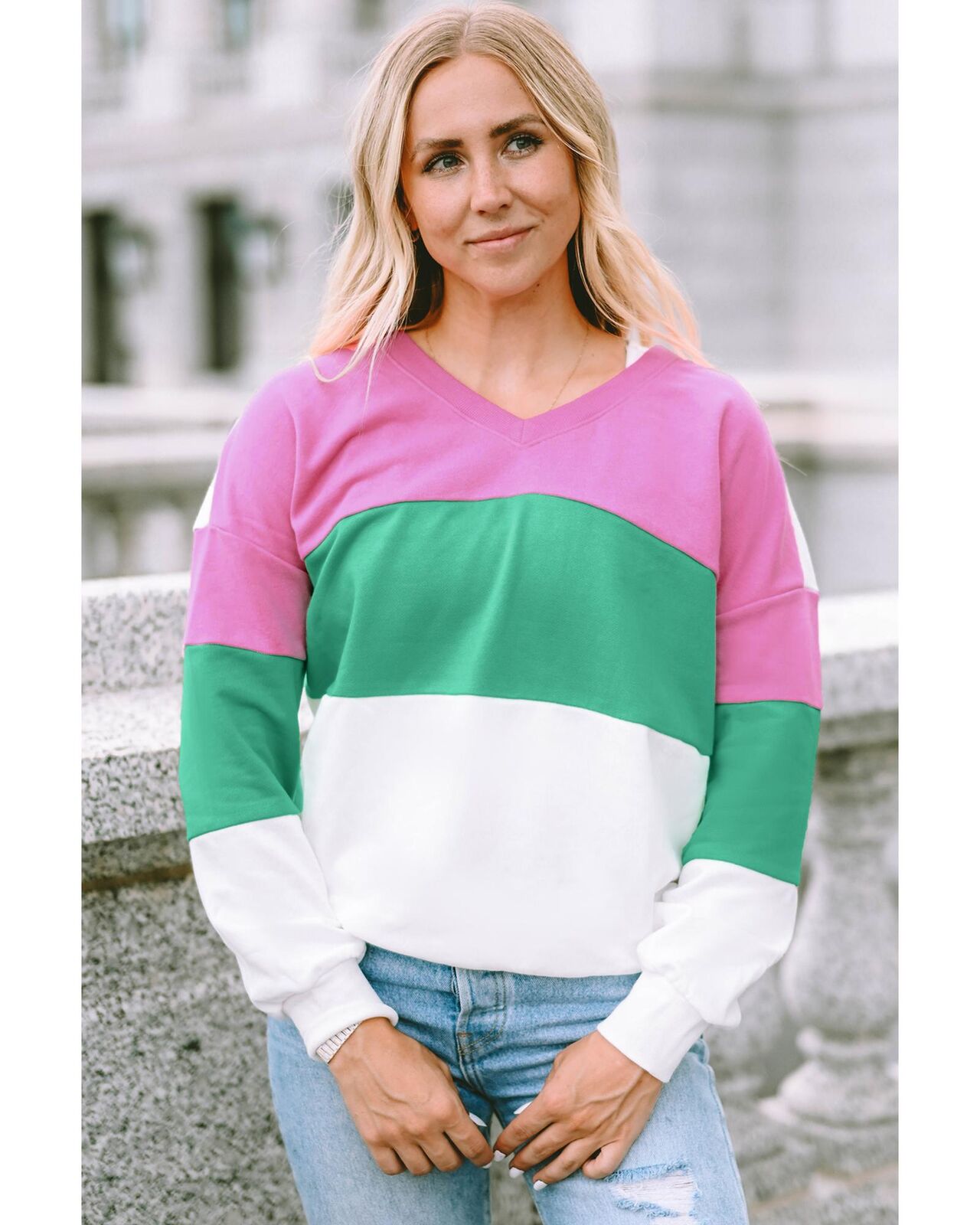 • Ribbed V Neck Color Block Patchwork Sweatshirt