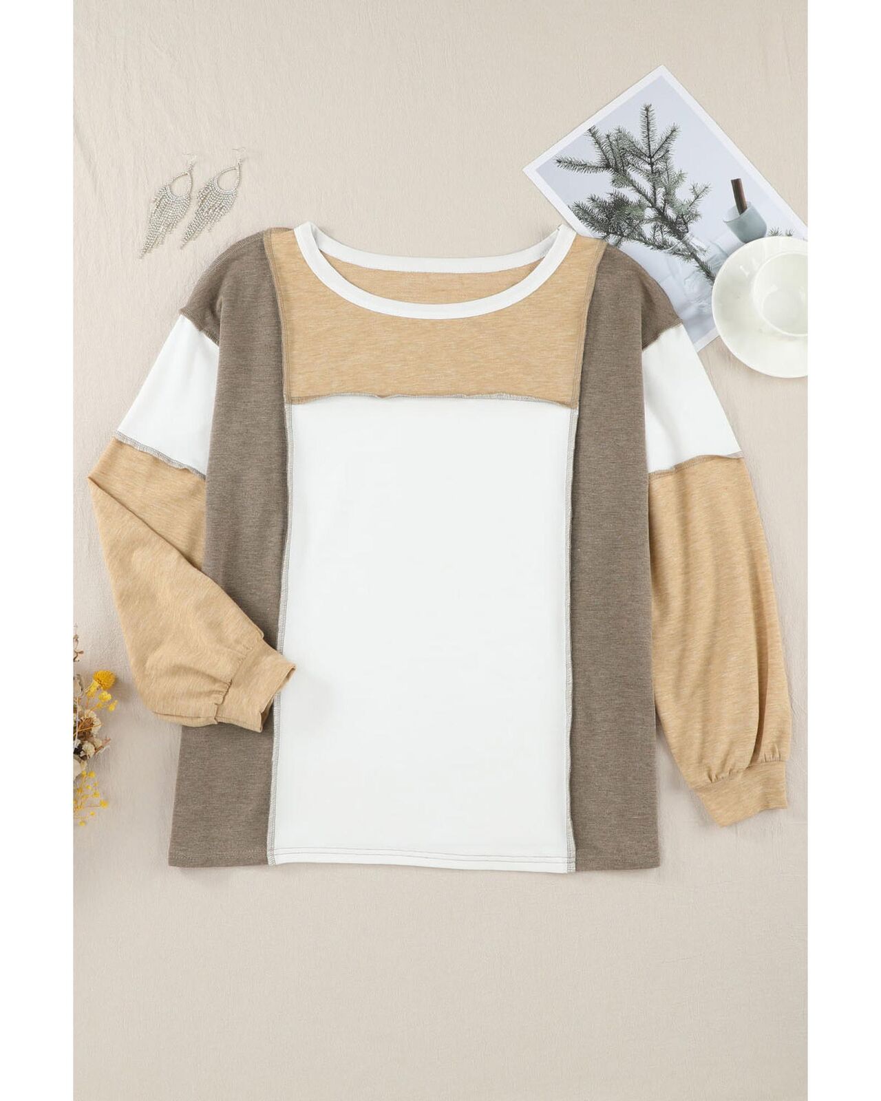 • Stylish and trendy Khaki Exposed Seam Color Block Patchwork Top