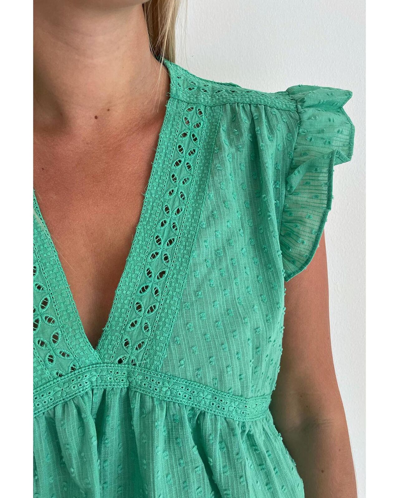 • Elegant Eyelet V Neckline Ruffle Swiss Dot Top