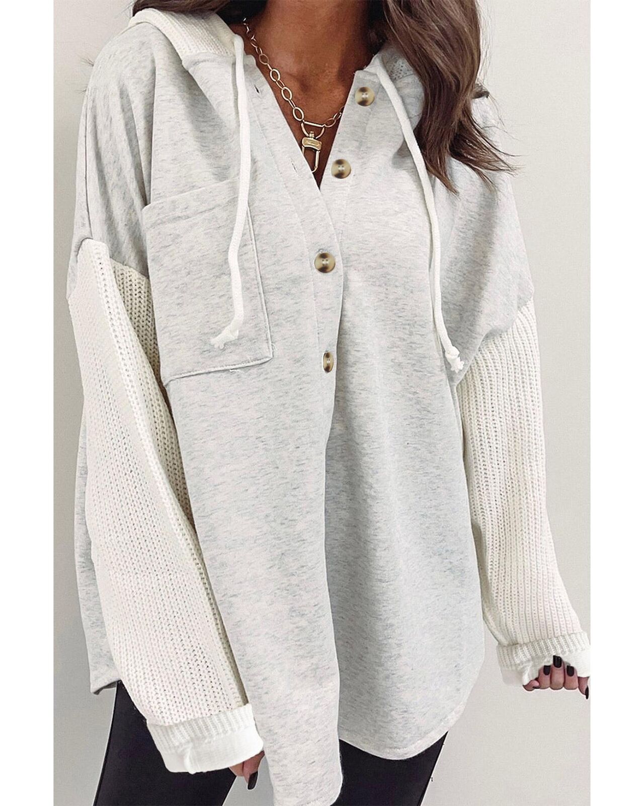 • Stay cozy and stylish with our Gray Button Up Contrast Knitted Sleeves Hooded Jacket