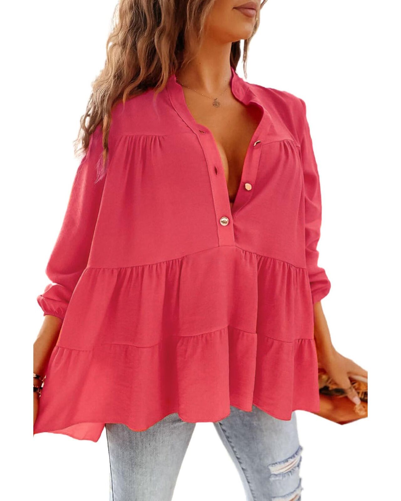 • Stylish and elegant Rose Half Buttoned Ruffle Tiered Long Sleeve Blouse