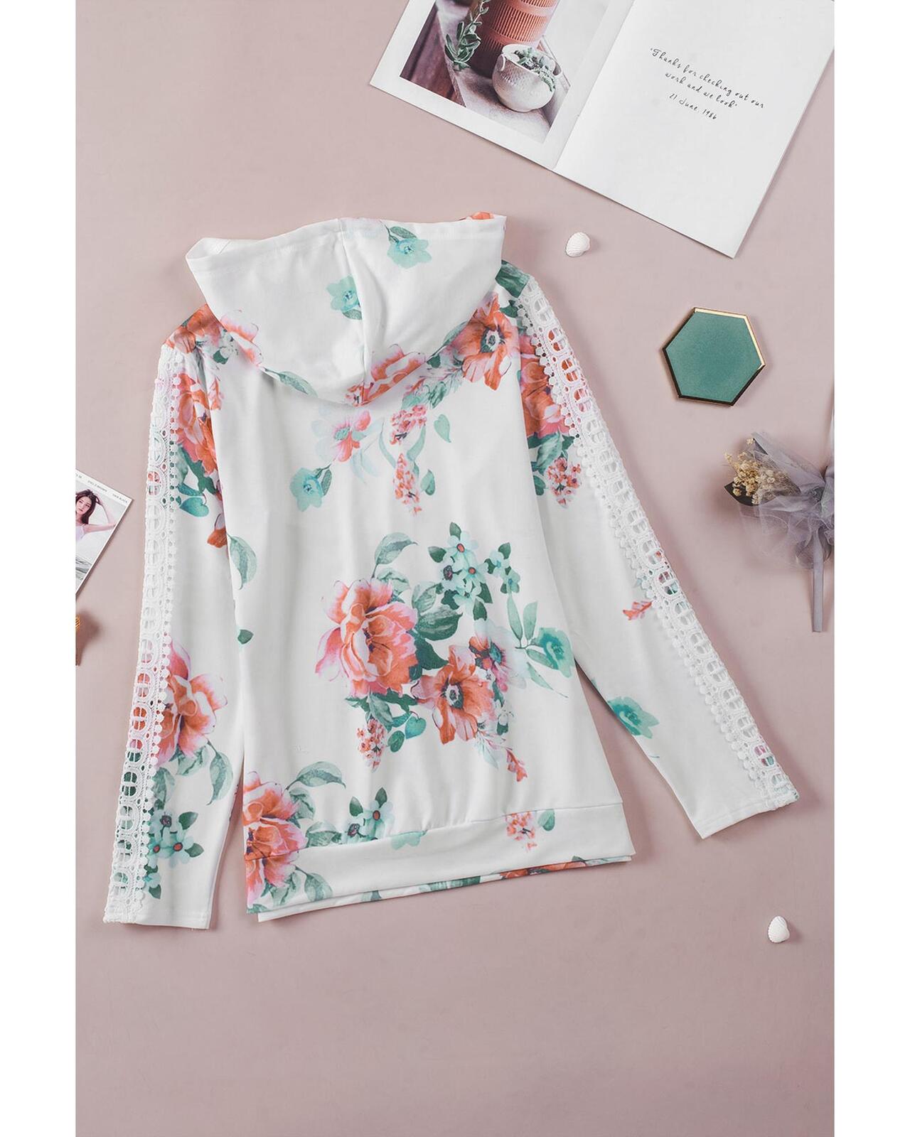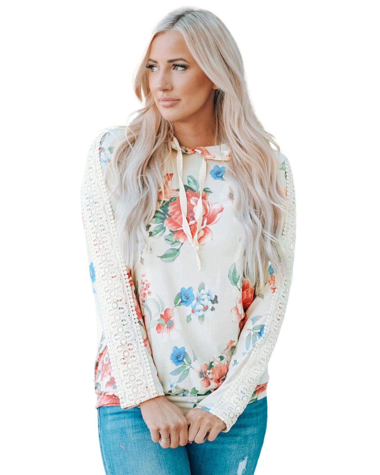 • Stylish and feminine Floral Print Lace Contrast Long Sleeve Hoodie