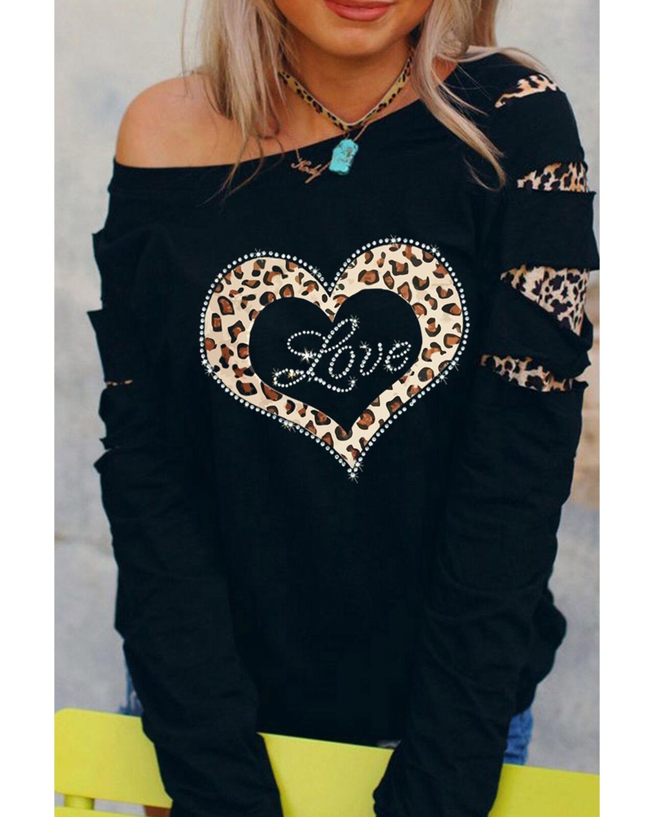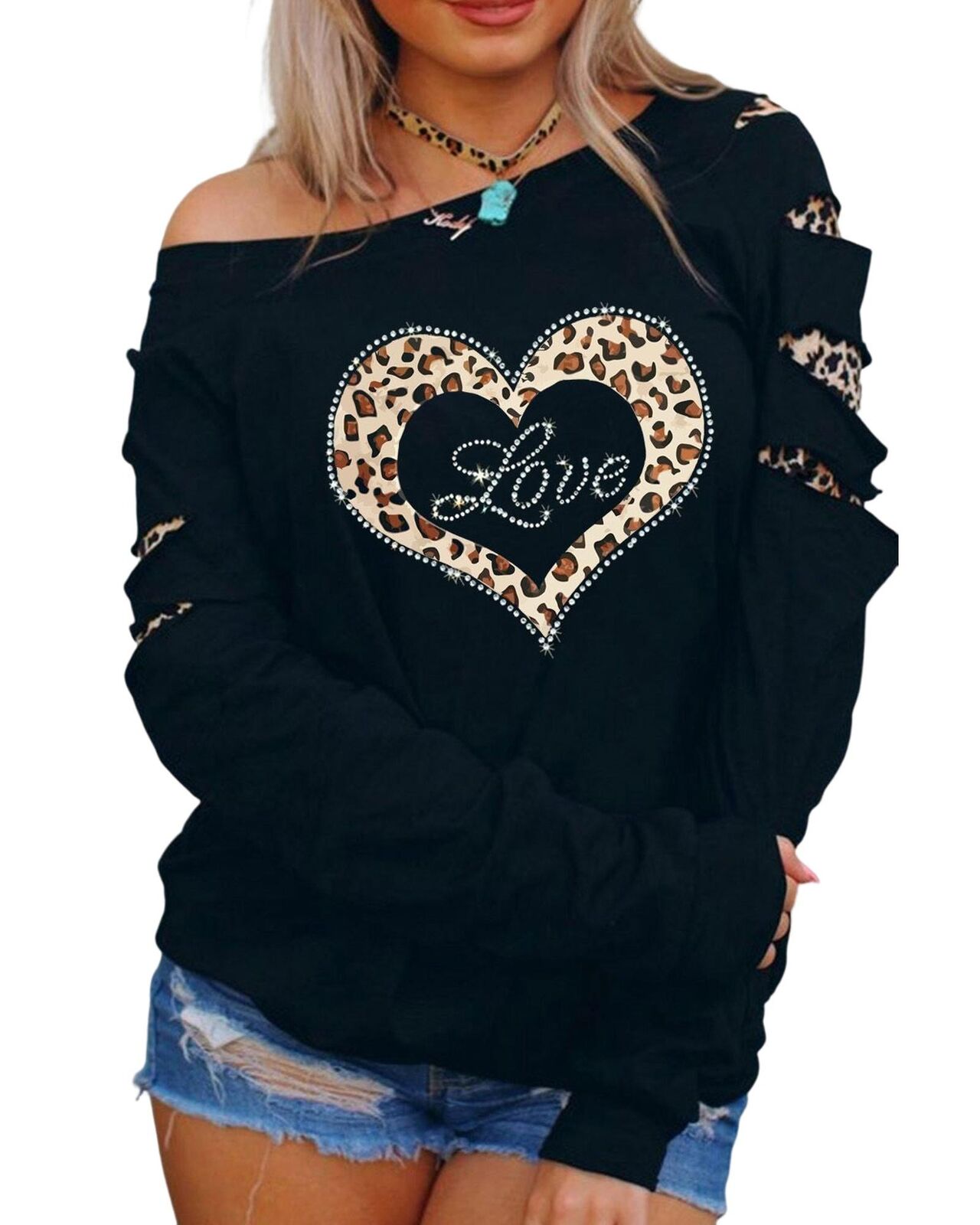 • Stylish and trendy Leopard Rhinestone Heart Graphic Slash Sleeve Sweatshirt