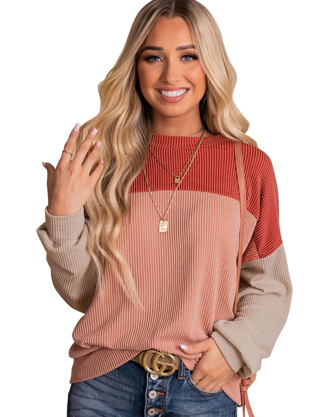 • Stylish and versatile Red Color Block Long Sleeve Ribbed Loose Top