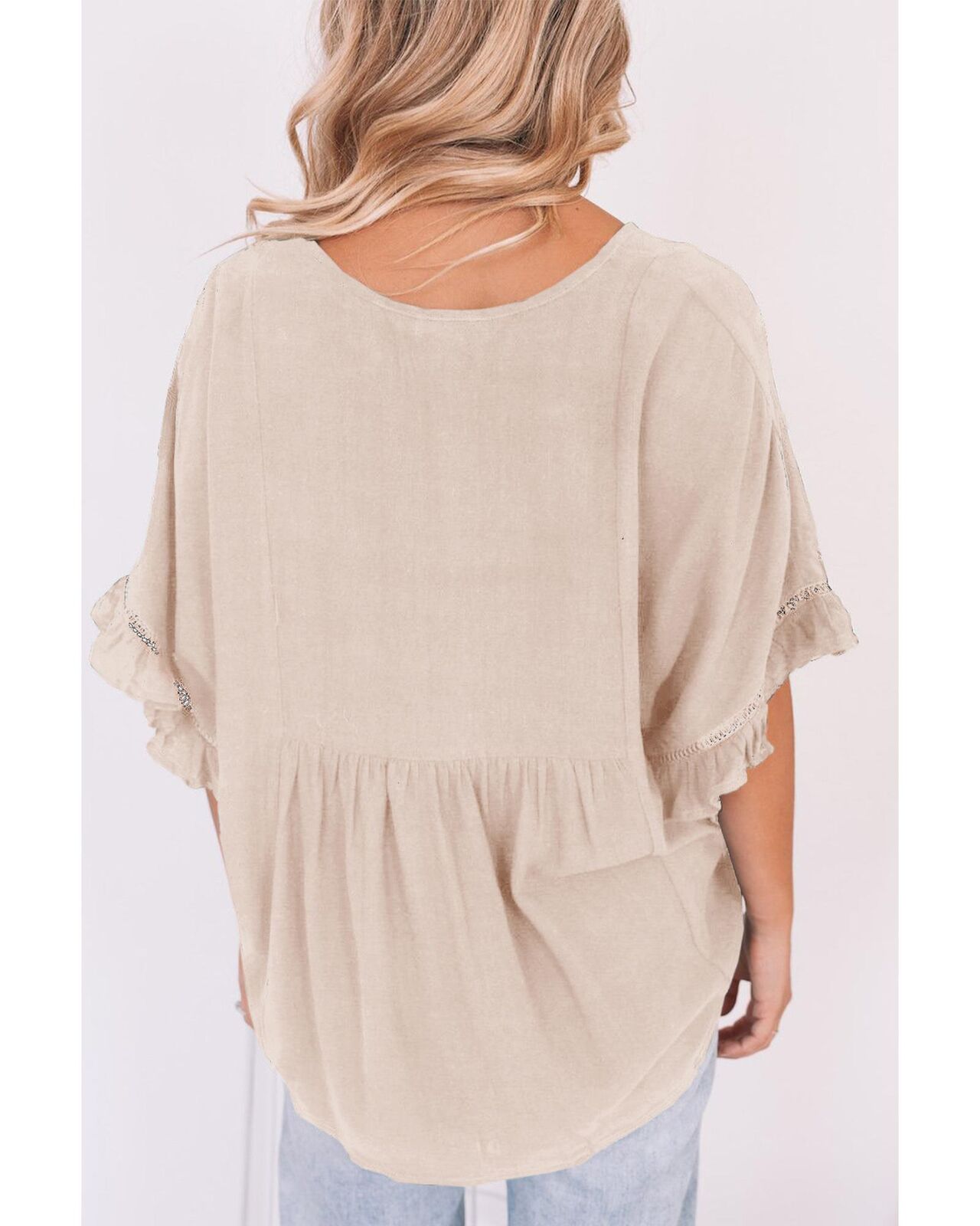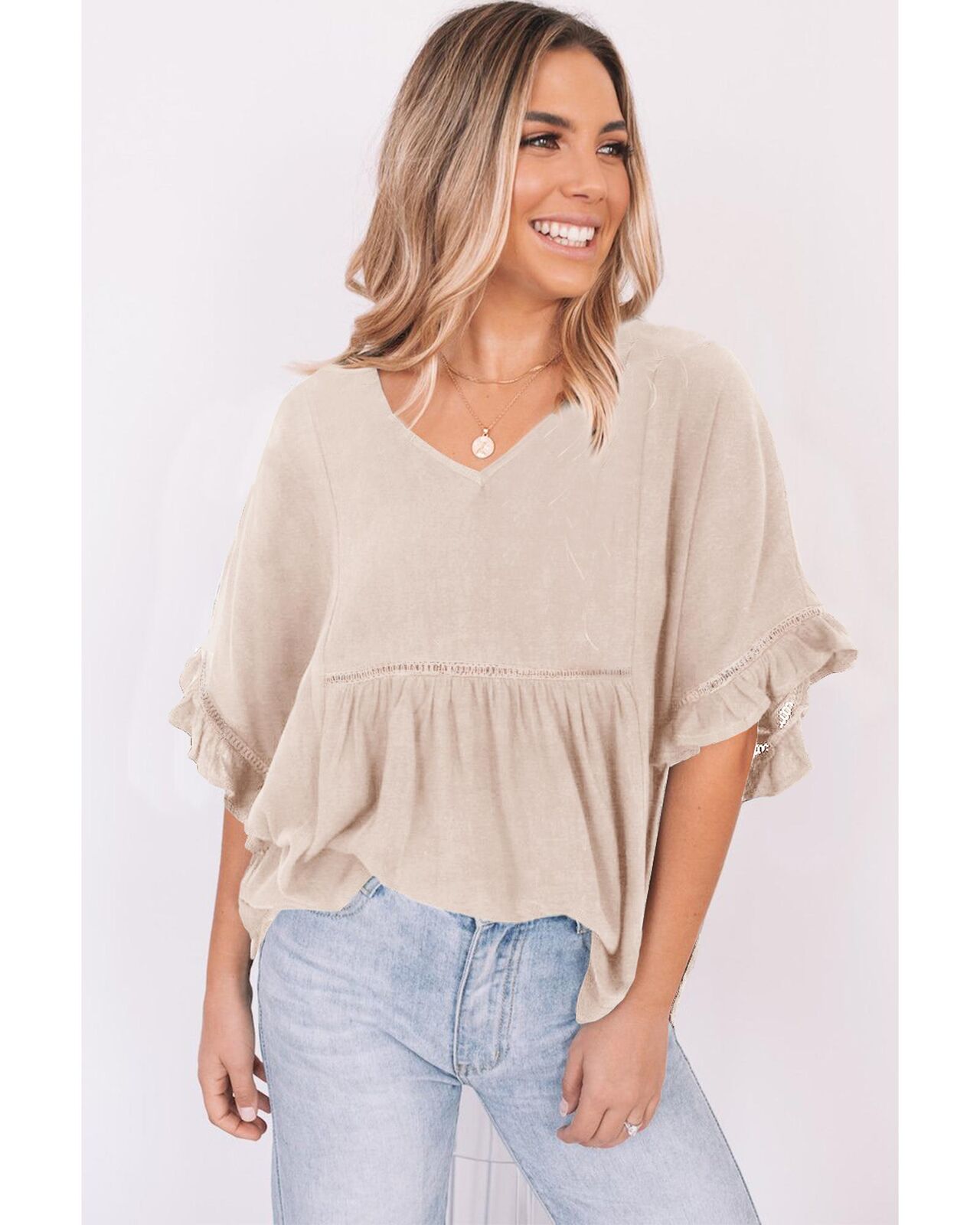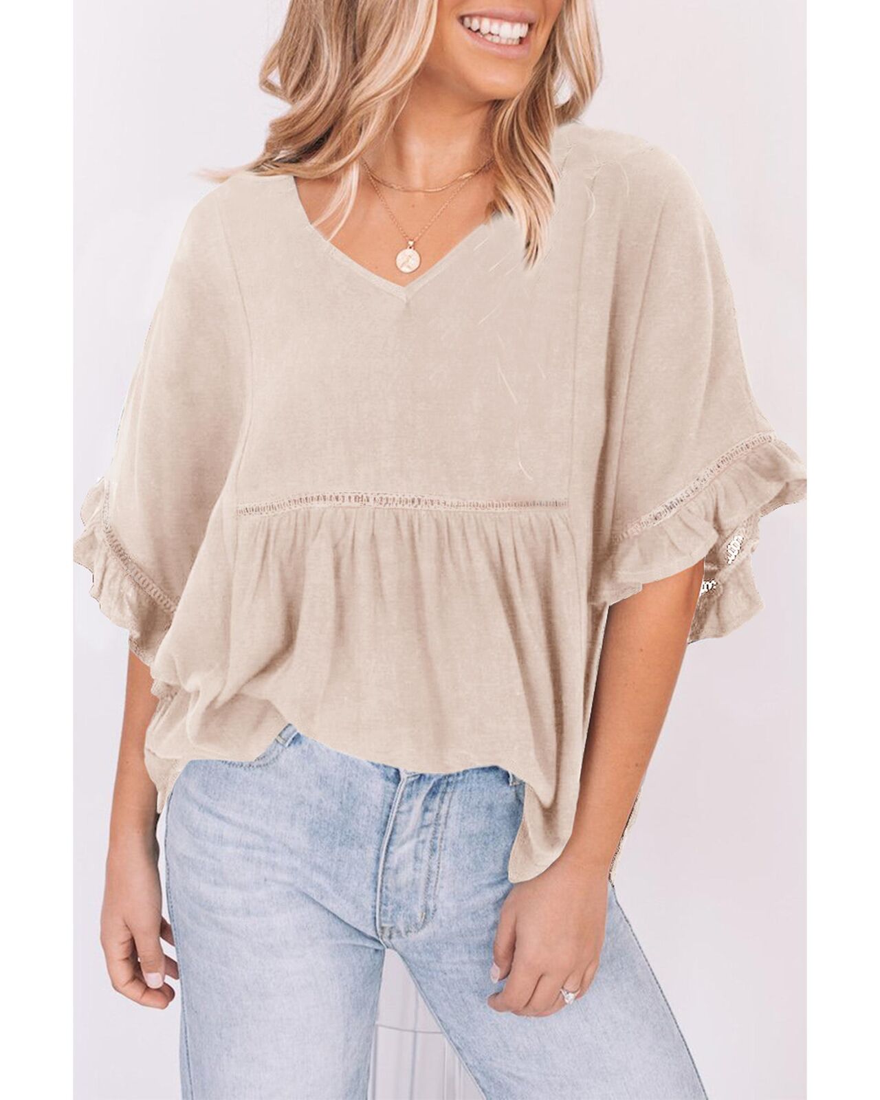 • Stylish and feminine Ruffled Lace Detail Loose V Neck Top