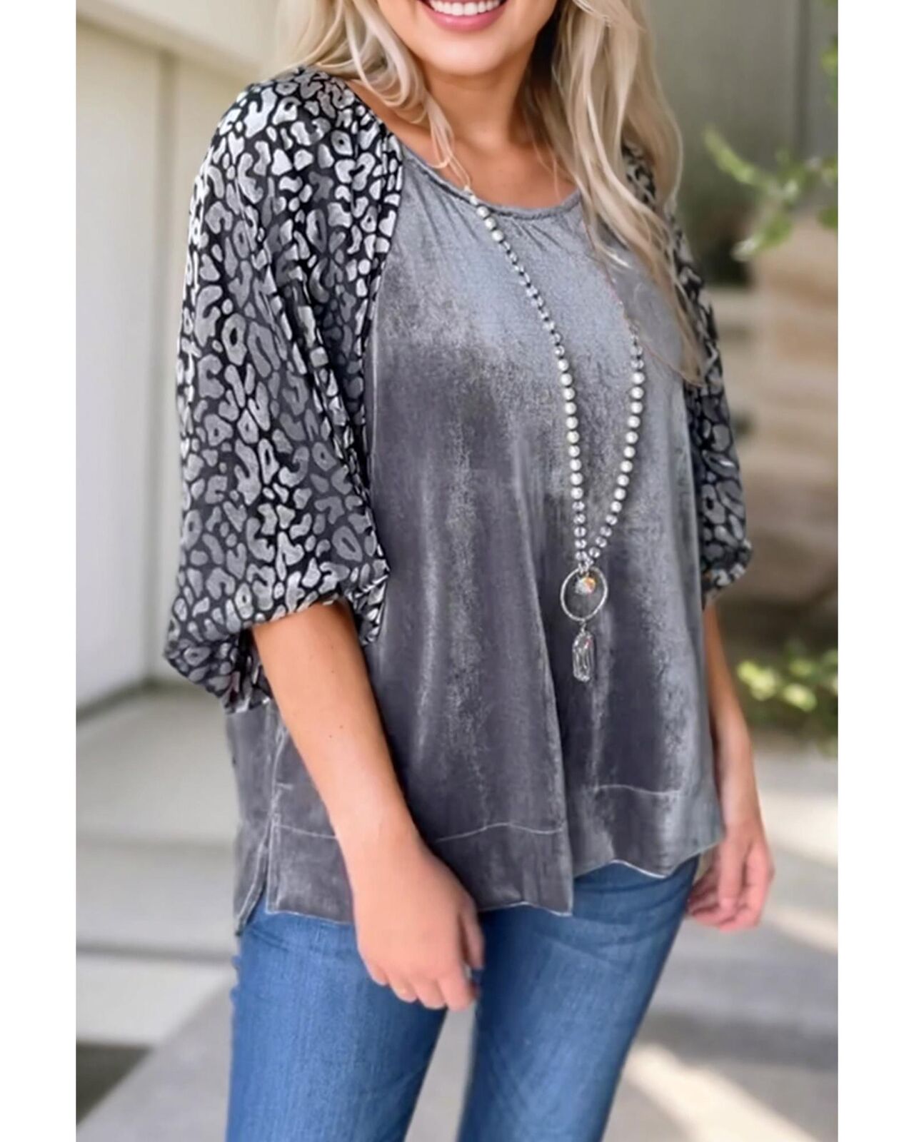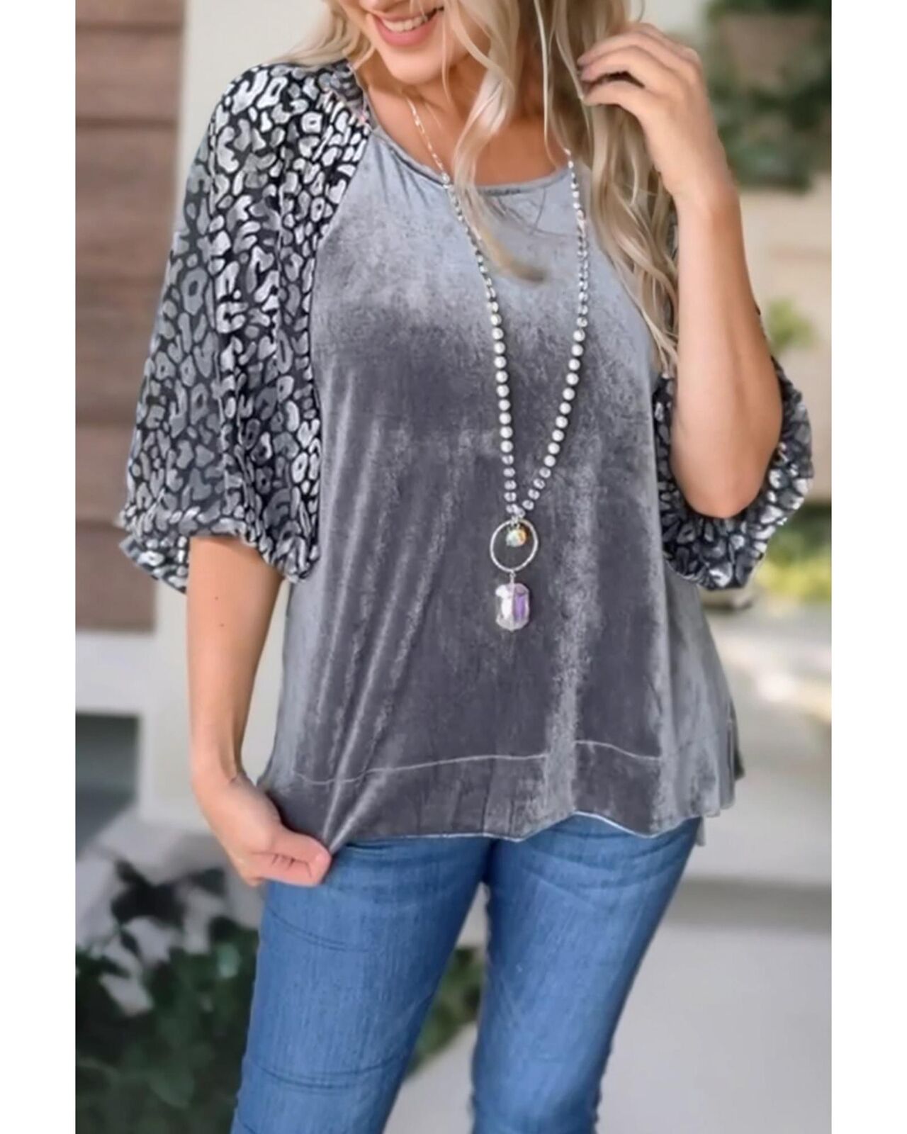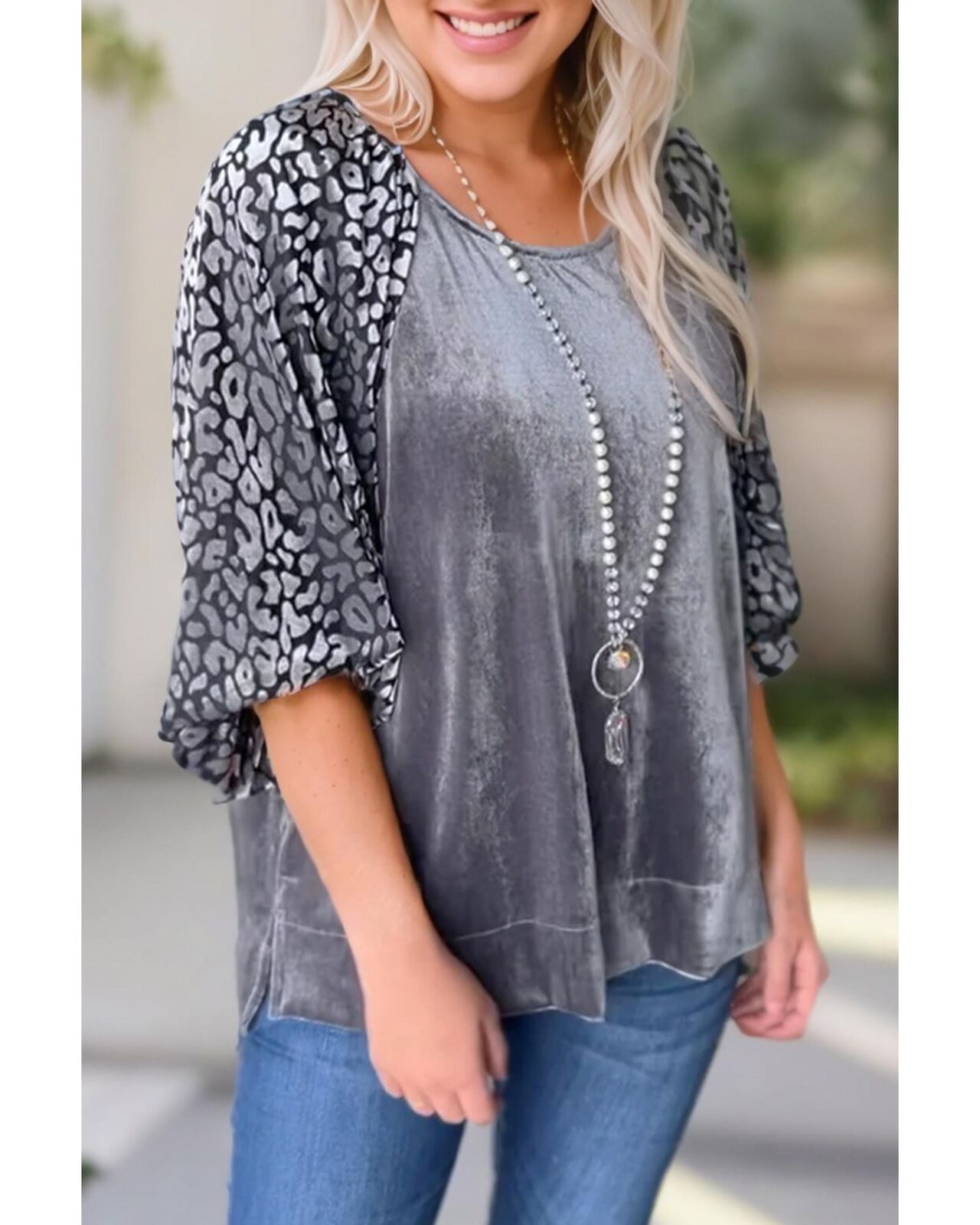 • Medium Grey Leopard Splicing Lantern Sleeve Velvet Blouse