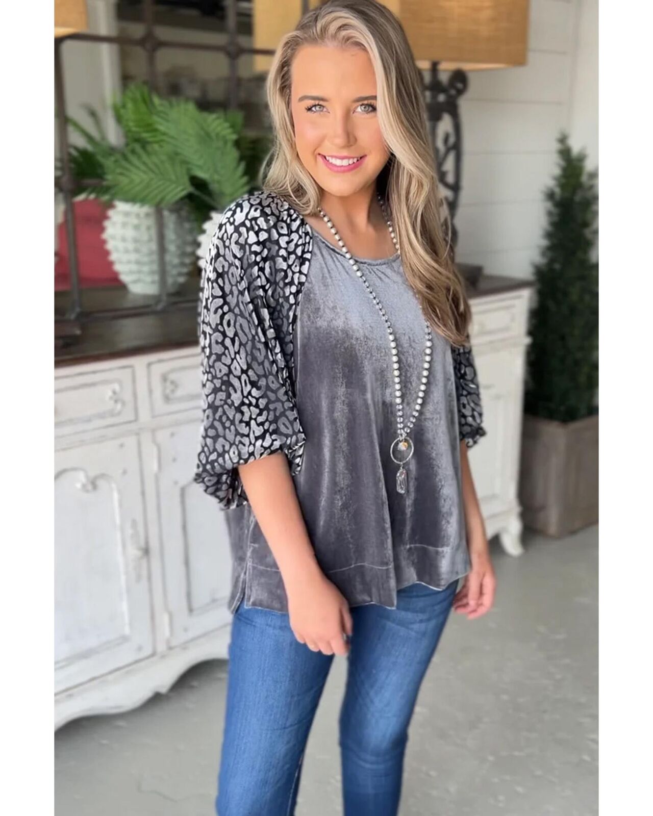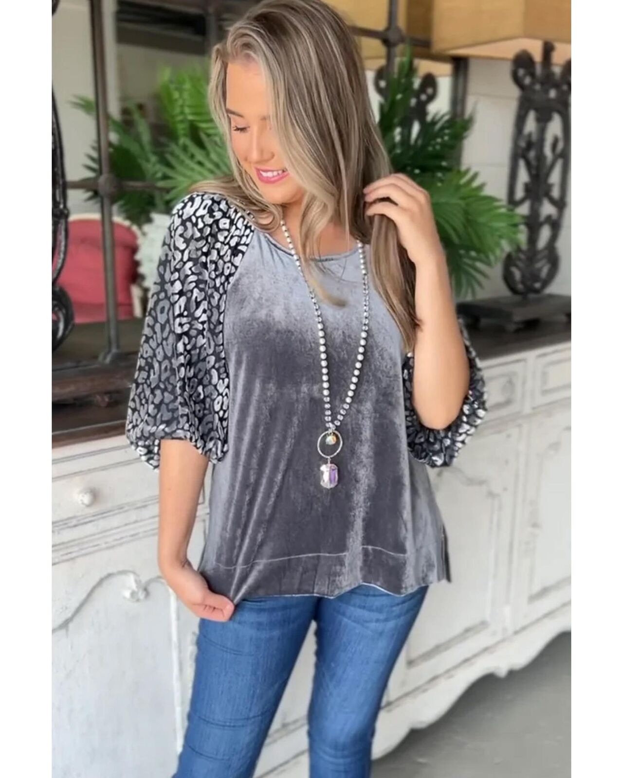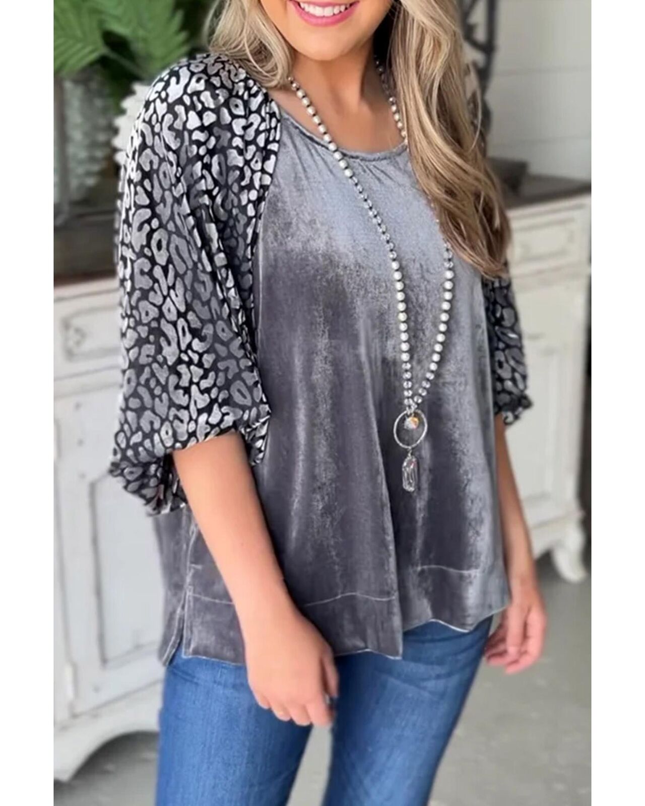 • Medium Grey Leopard Splicing Lantern Sleeve Velvet Blouse