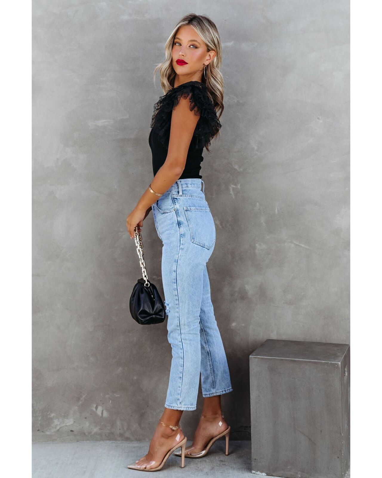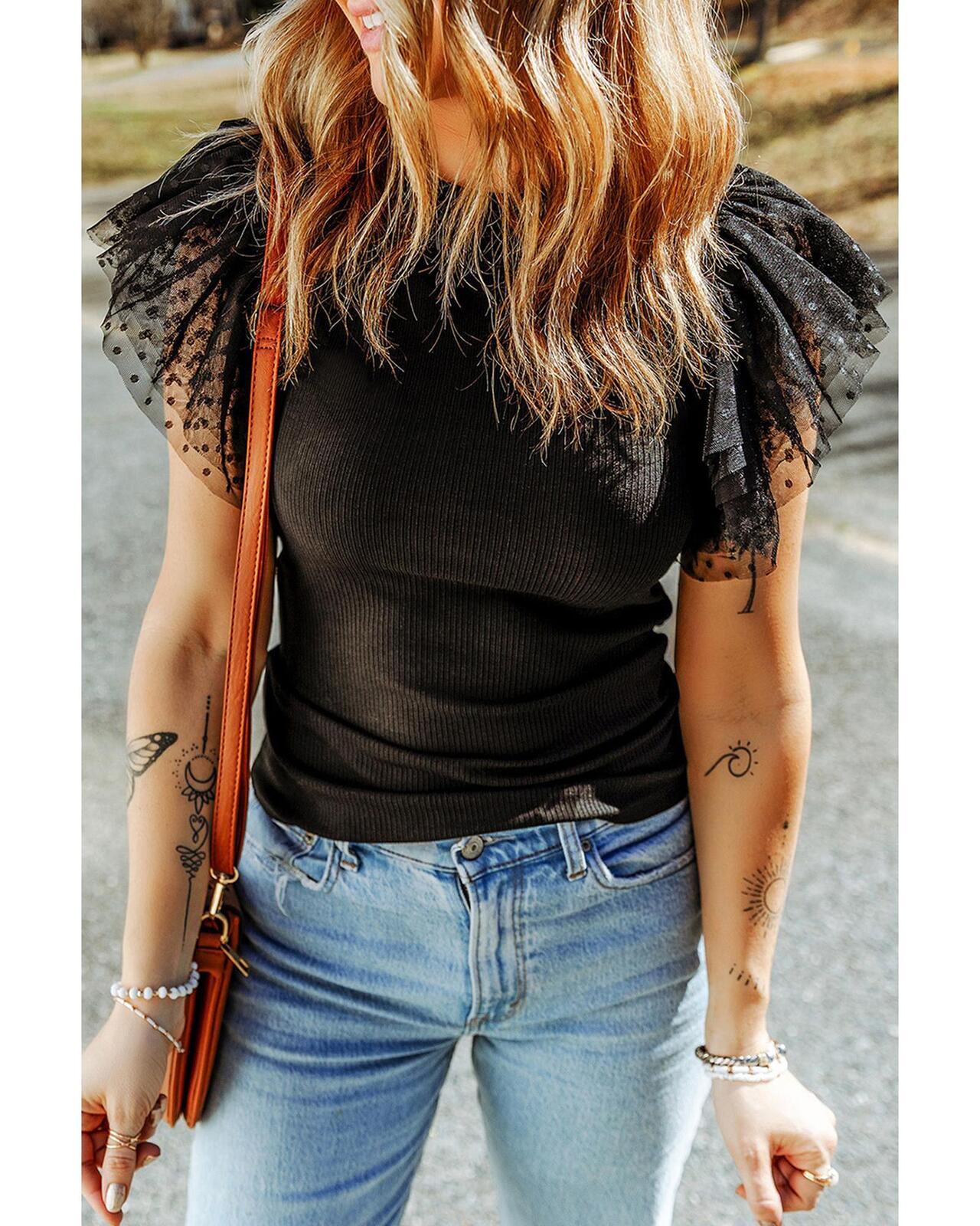 • Womens Dotty Mesh Ruffle Sleeve Ribbed Knit Top