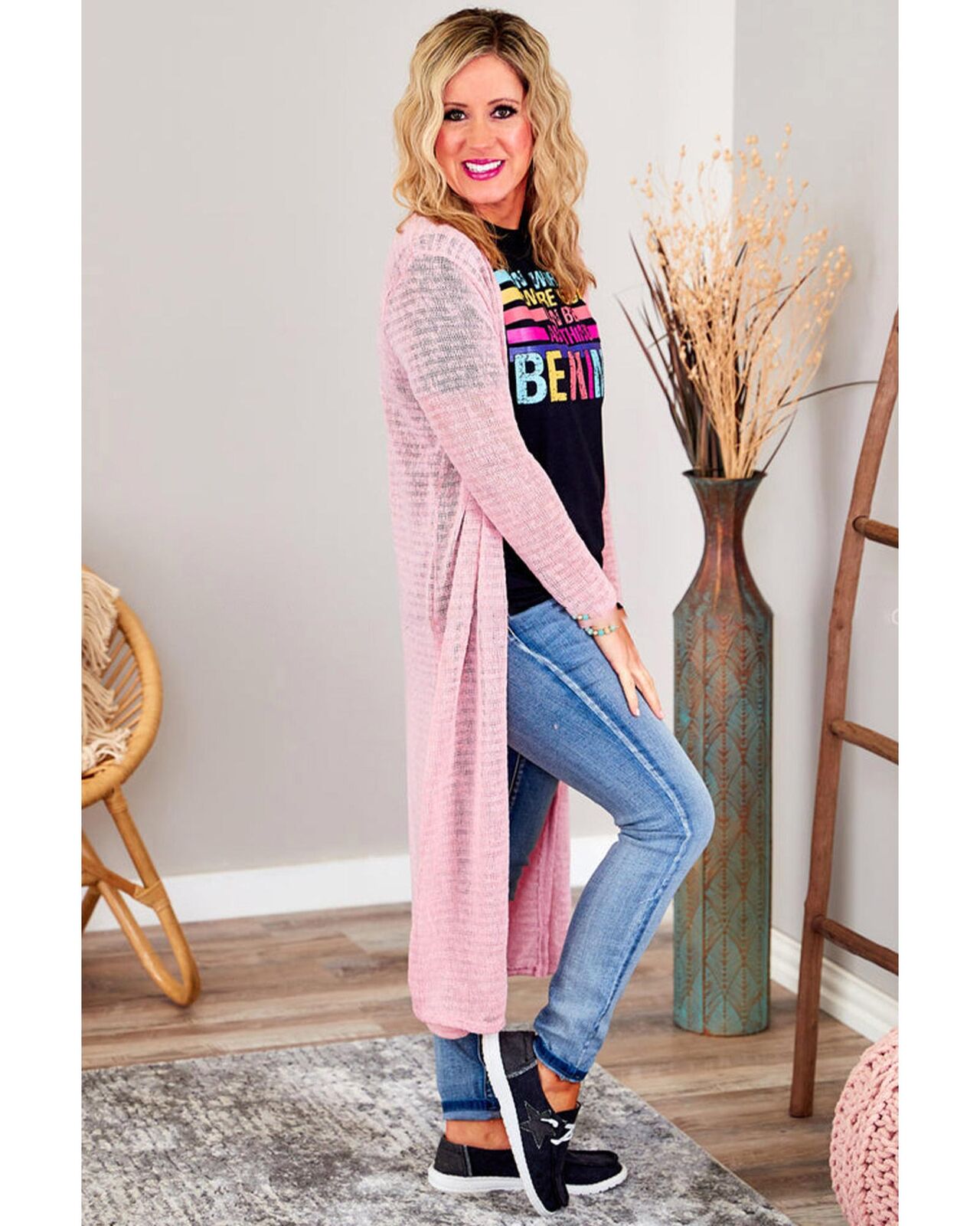 • Solid-color long cardigan with an open front Long sleeves and side splits Flowing sheer fabric for an elegant and airy feel Versatile style that pairs well with T-shirts jeans and flats Available in plus sizes for a perfect fit