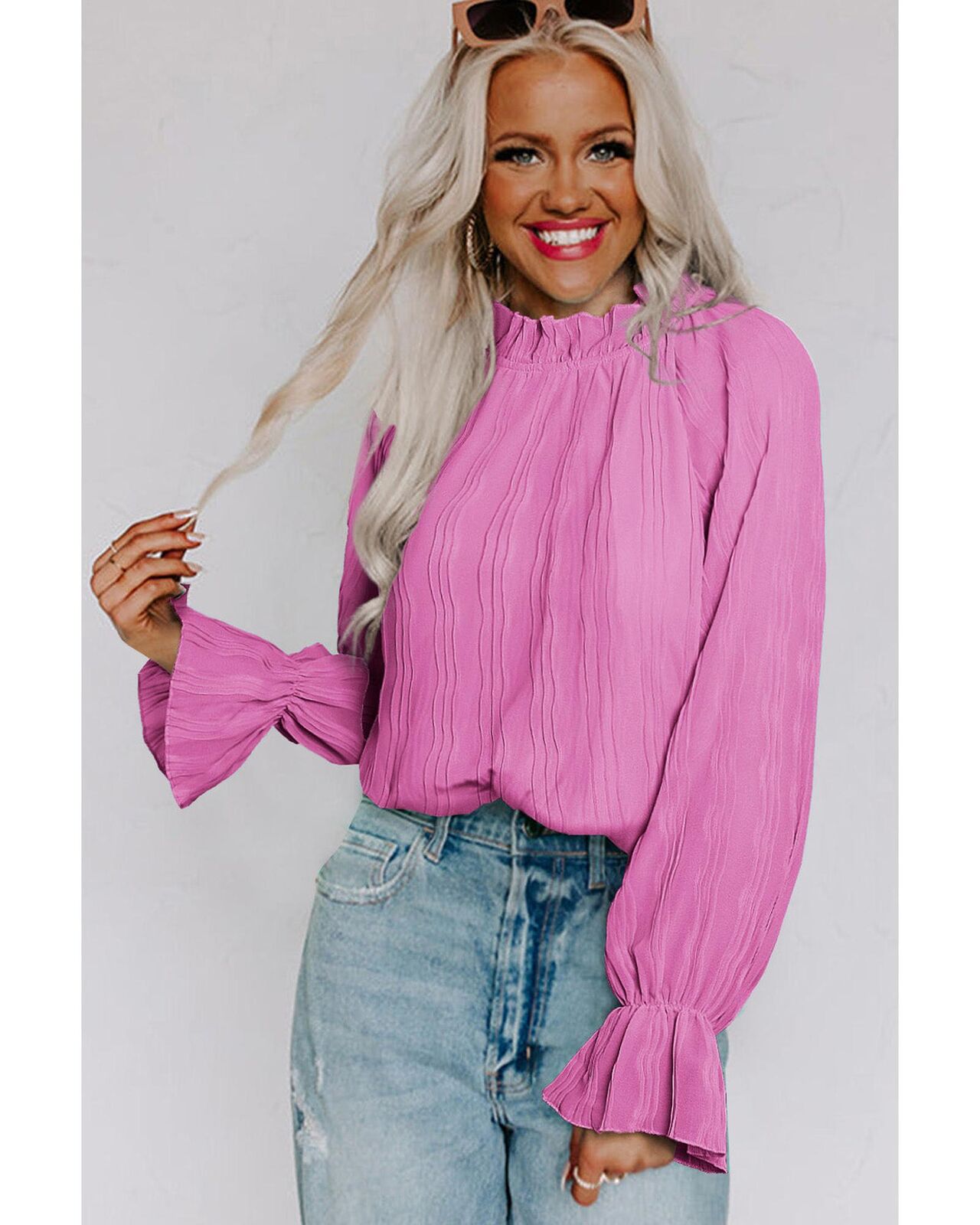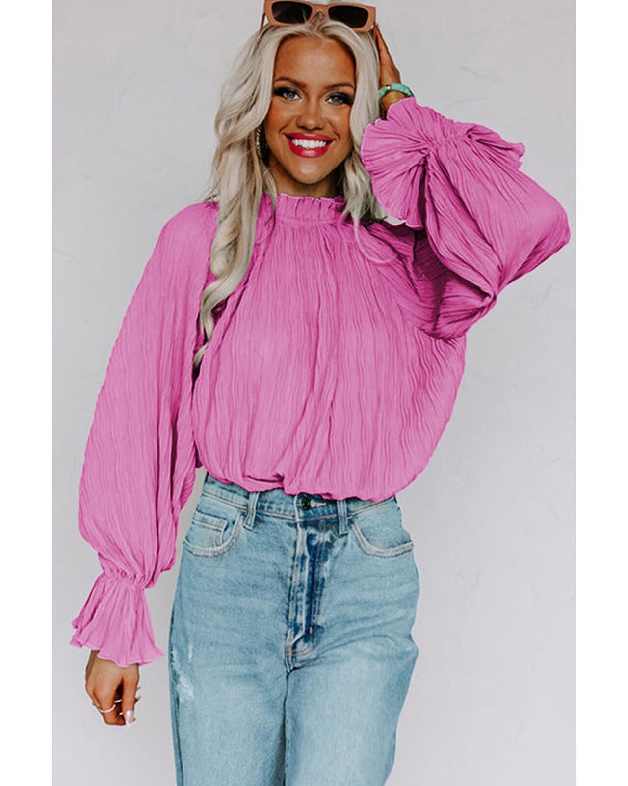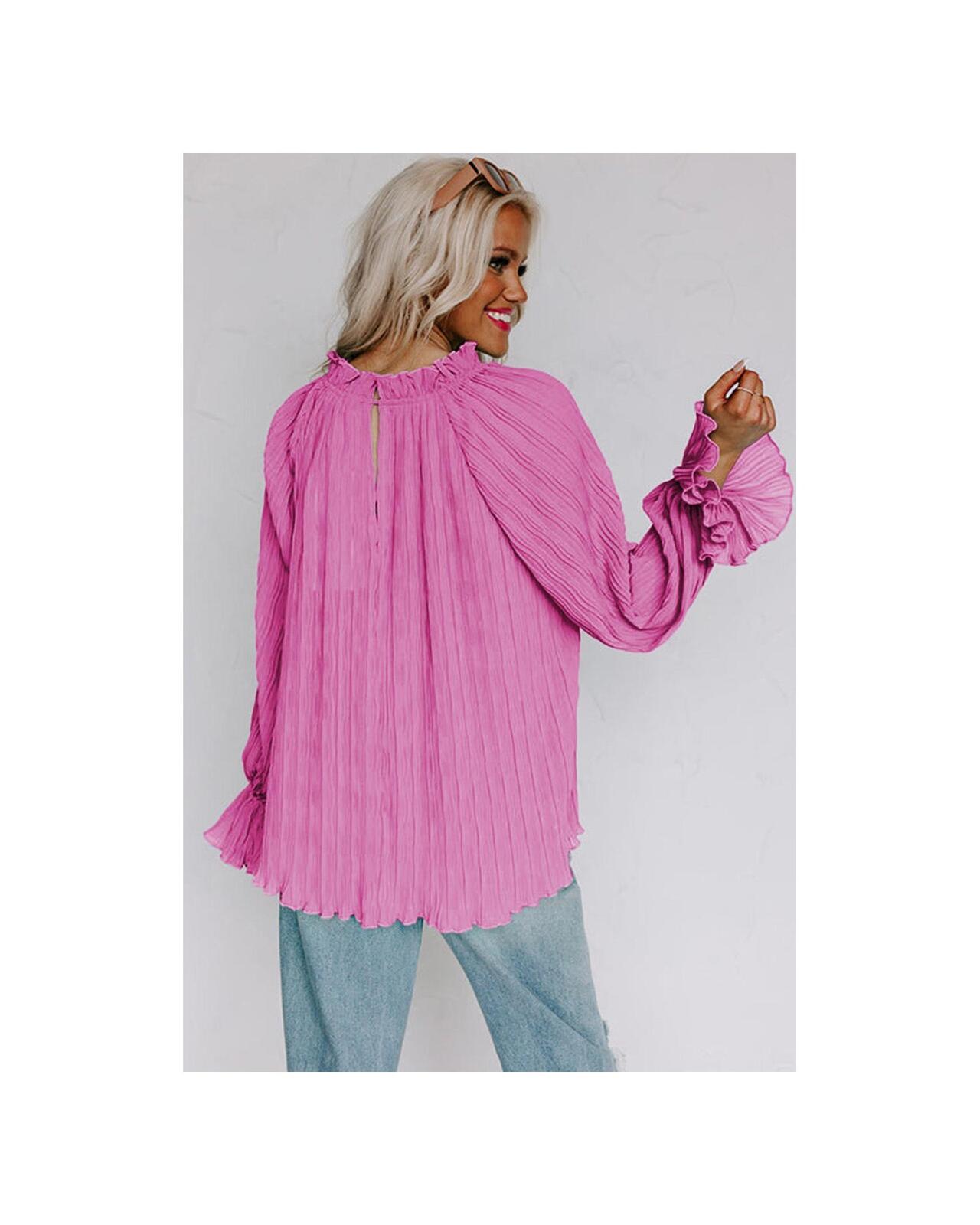 • Luxurious Pink Striking Pleated Flared Cuff Long Sleeve Blouse