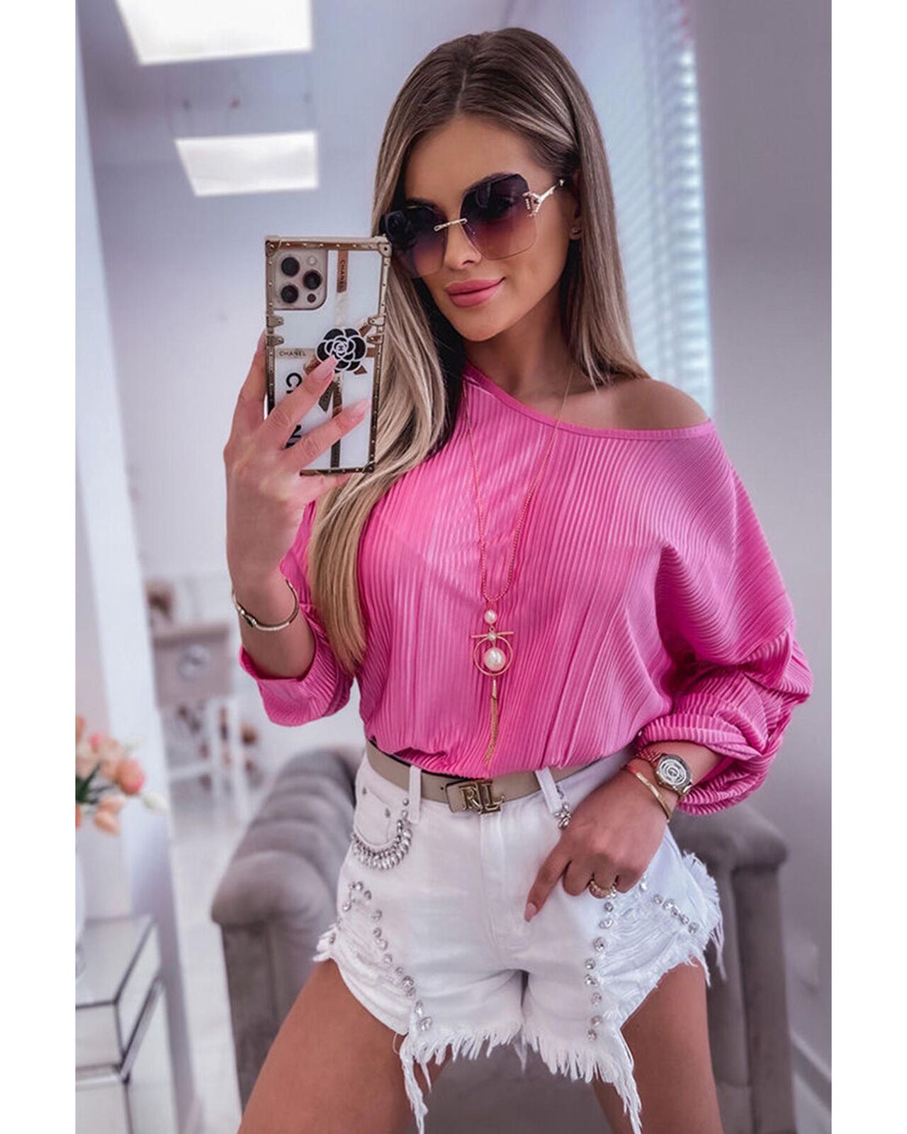 • Versatile and elegant Rose Pleated Texture Roll Tab Sleeve Blouse for women