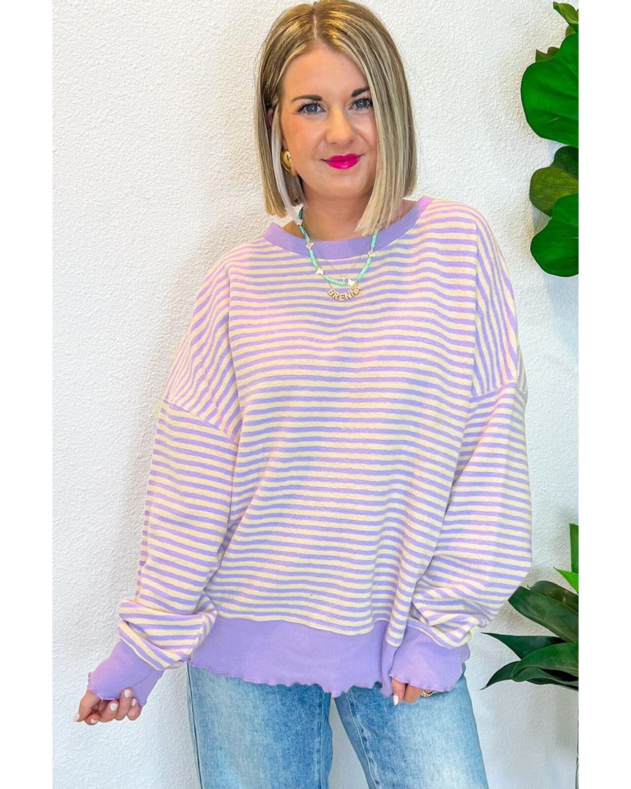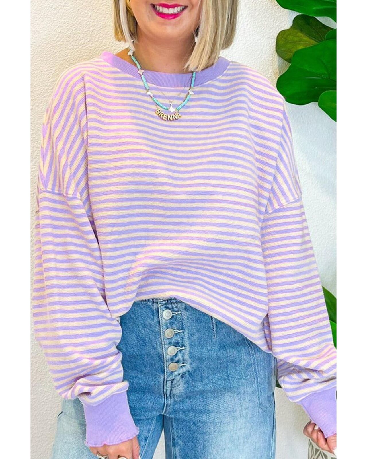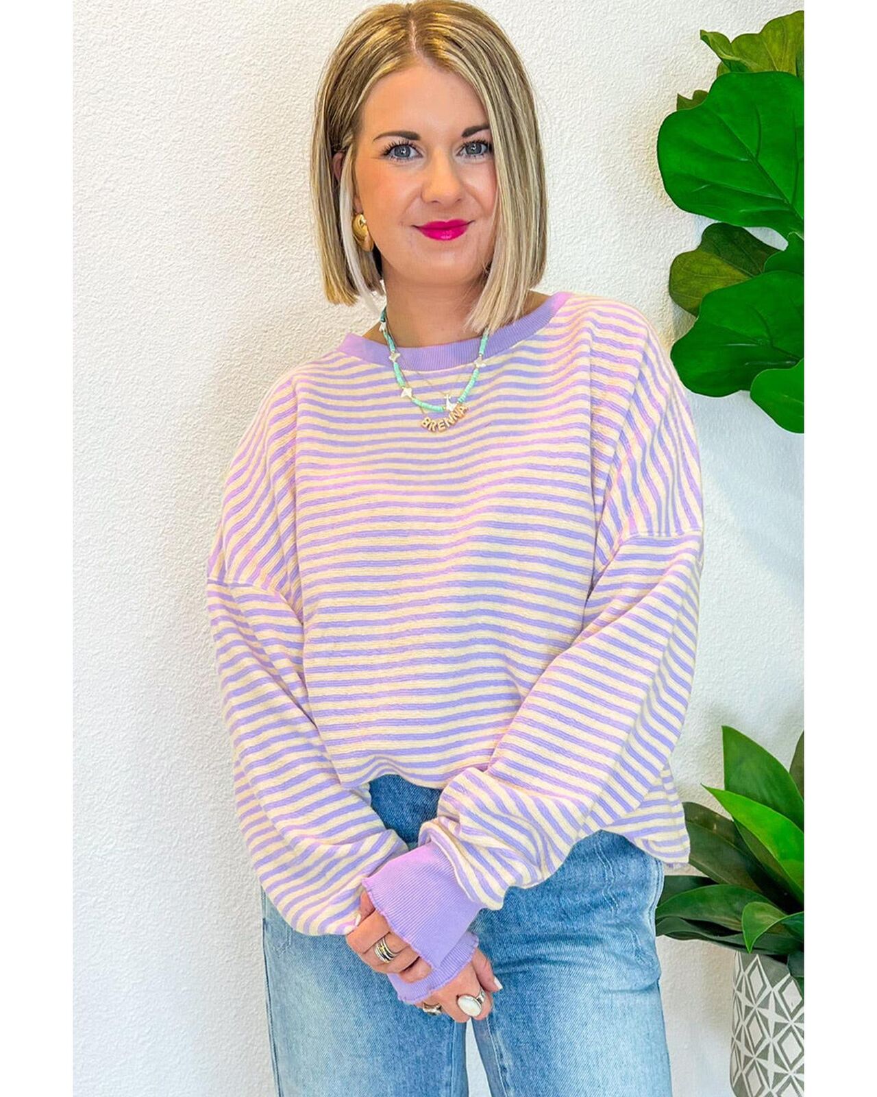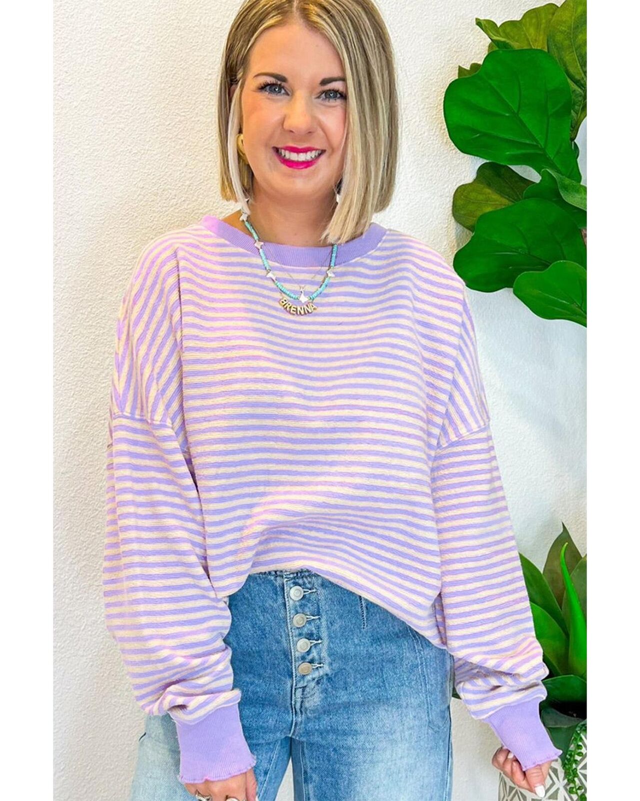 • Purple Stripe Loose Drop Shoulder Long Sleeve Top