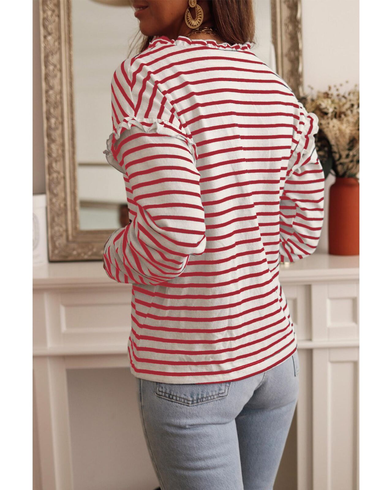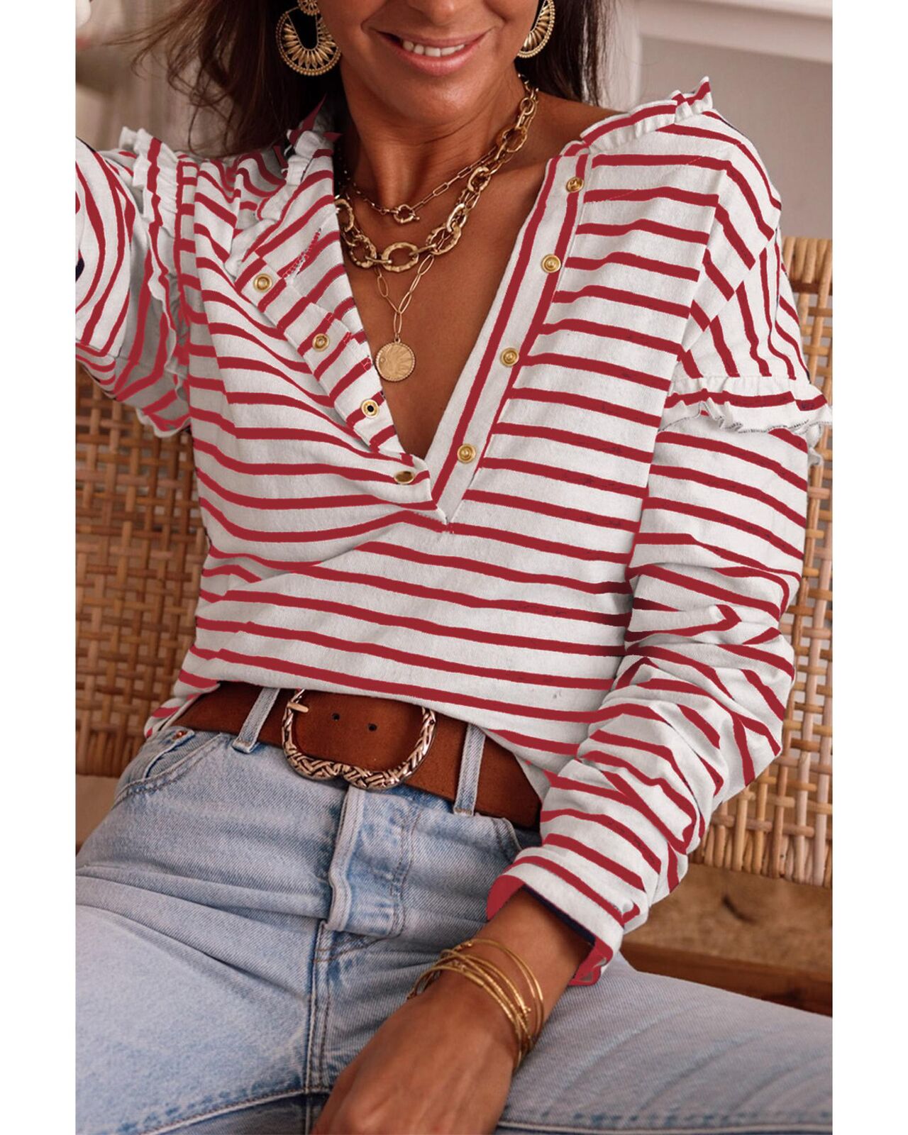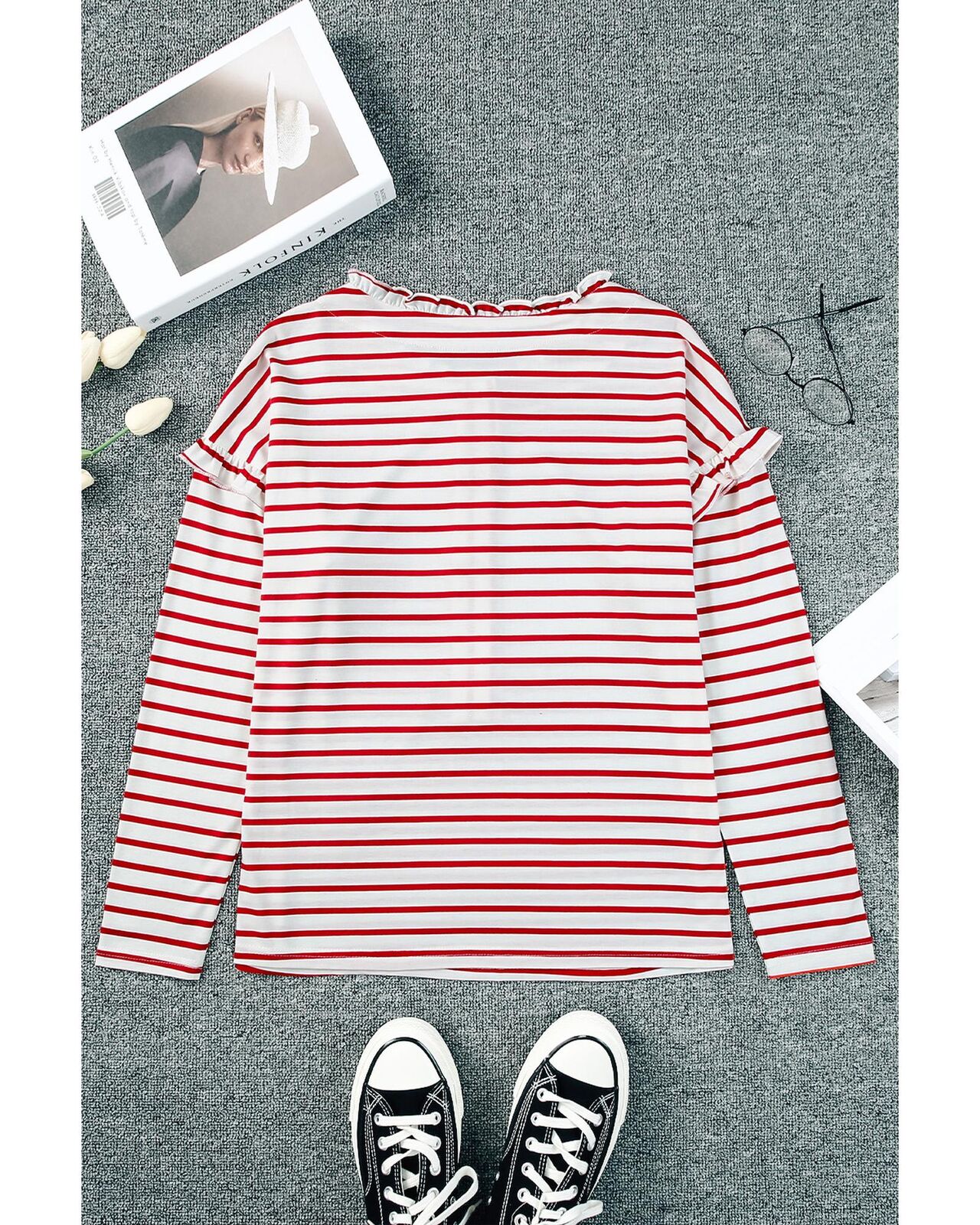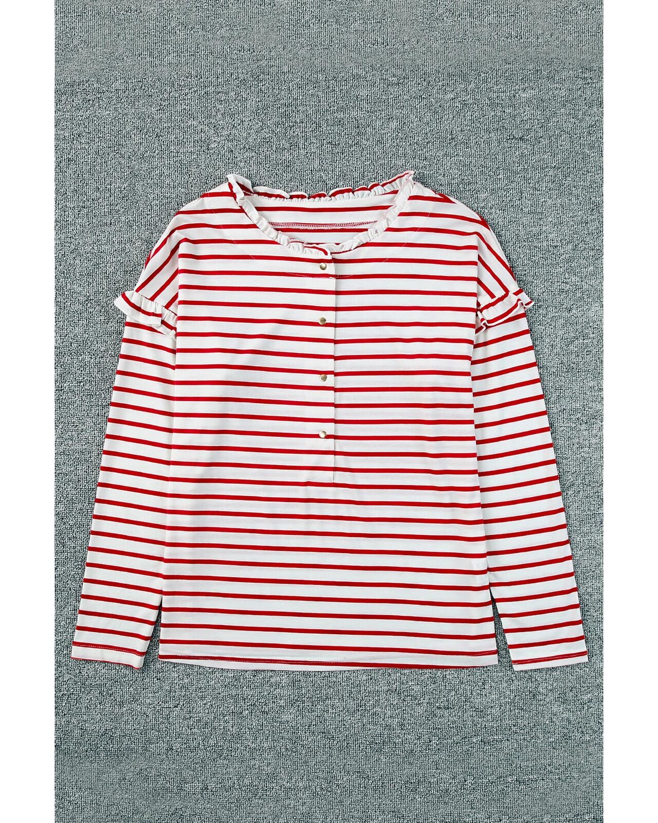 • Striped Print Ruffled Buttoned Long Sleeve Top