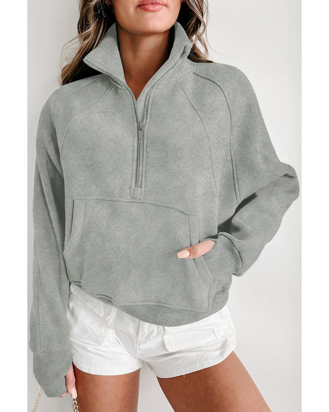 • Gray zip-up sweatshirt with stand collar