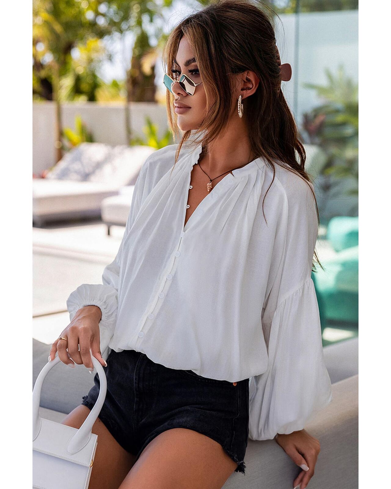 • Versatile Solid Color V Neck Balloon Sleeve Shirt