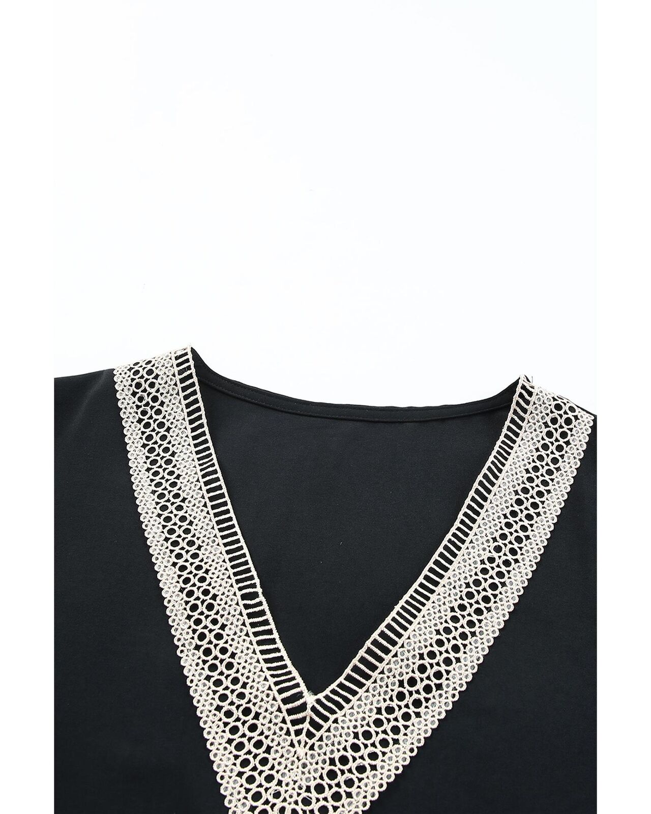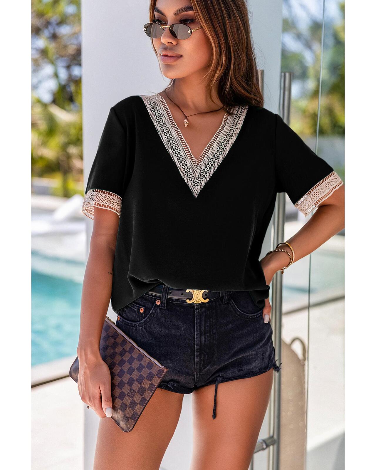 • Elegant Lace Trim V Neck Short Sleeve Blouse