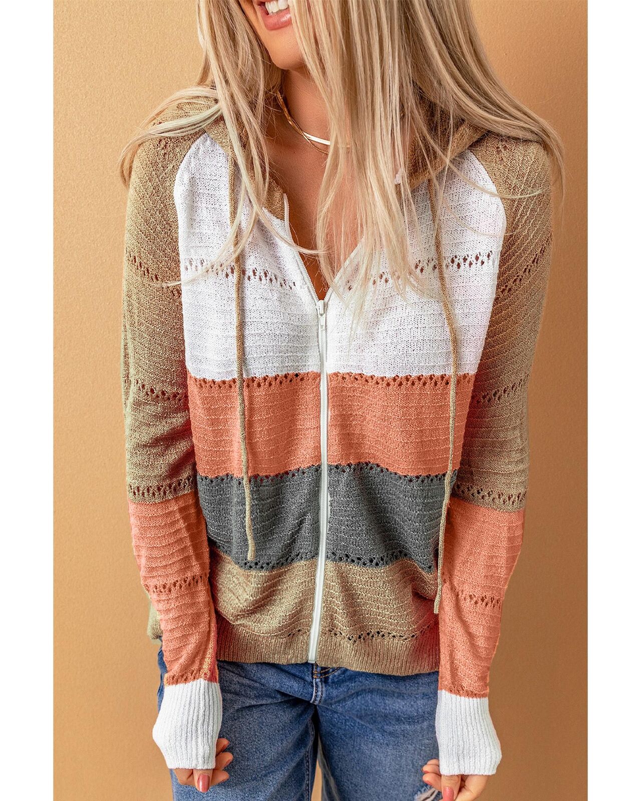 • Multicolor Zipped Front Colorblock Hollow-out Knit Hoodie