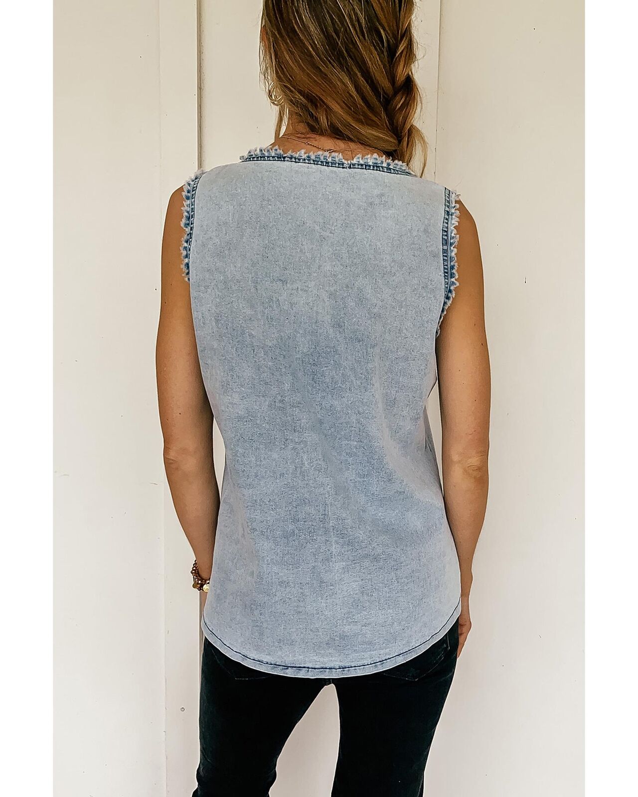 • Frayed details on neckline and arms