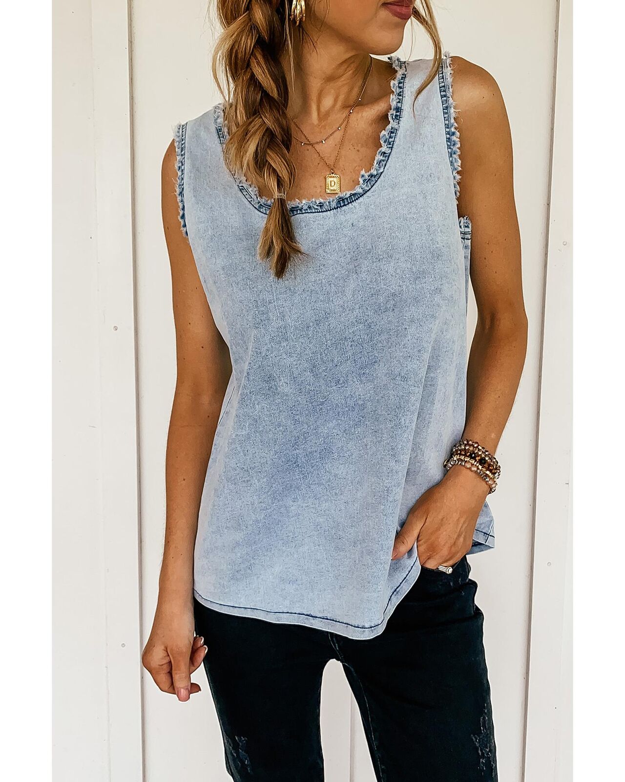 • Frayed details on neckline and arms