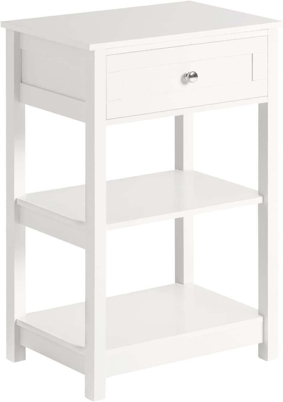 - This bedside table is the perfect addition to any bedroom or living room. It features one drawer and two shelves, providing ample storage space for books, magazines, and other items. The sleek design and sturdy construction make it a great choice for any home.