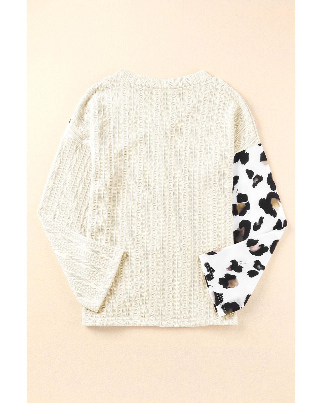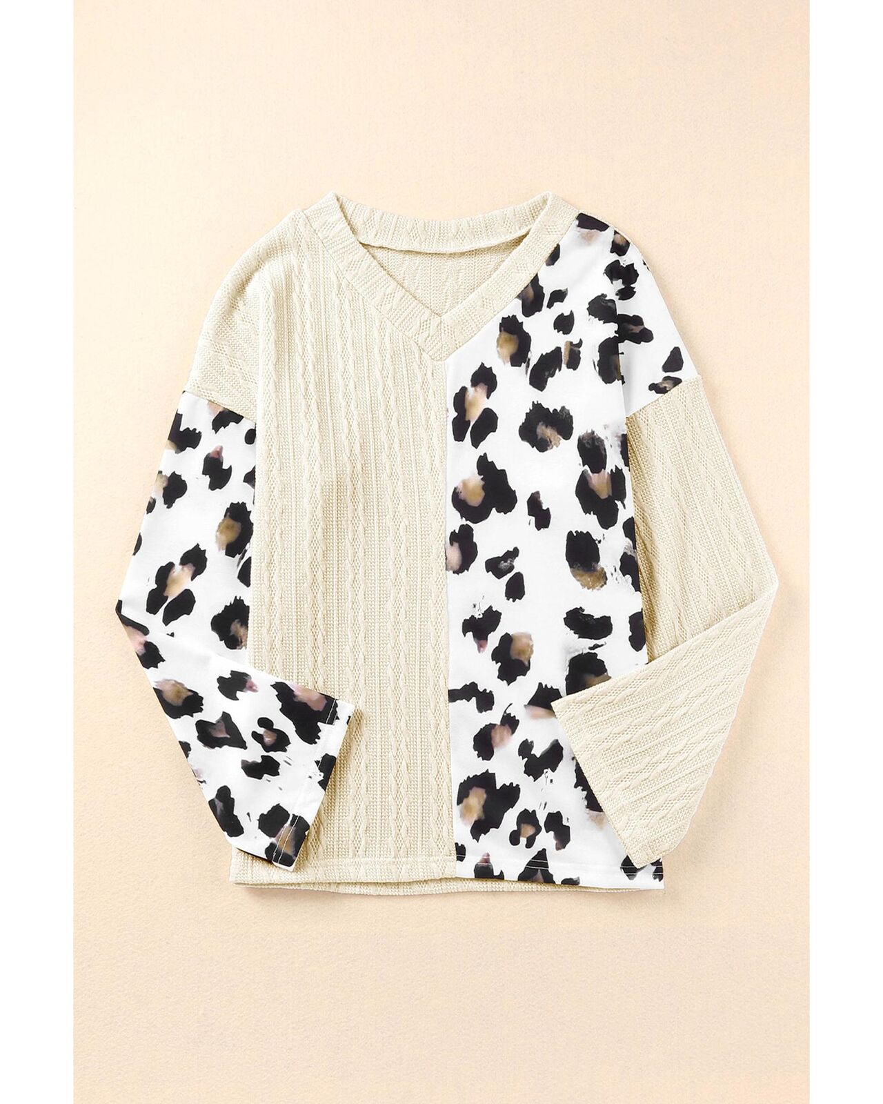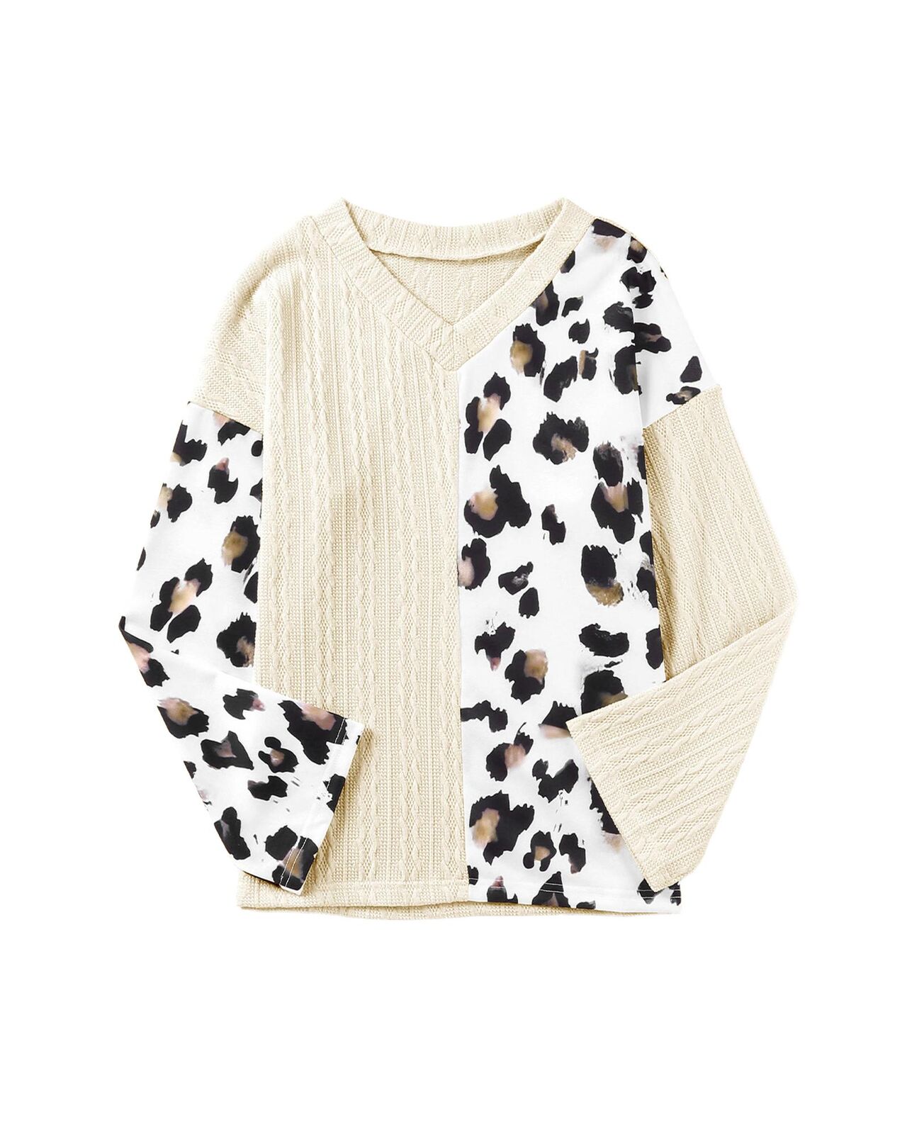 • Luxurious and stylish Beige Asymmetric Leopard Patchwork Wide Sleeve V Neck Sweater