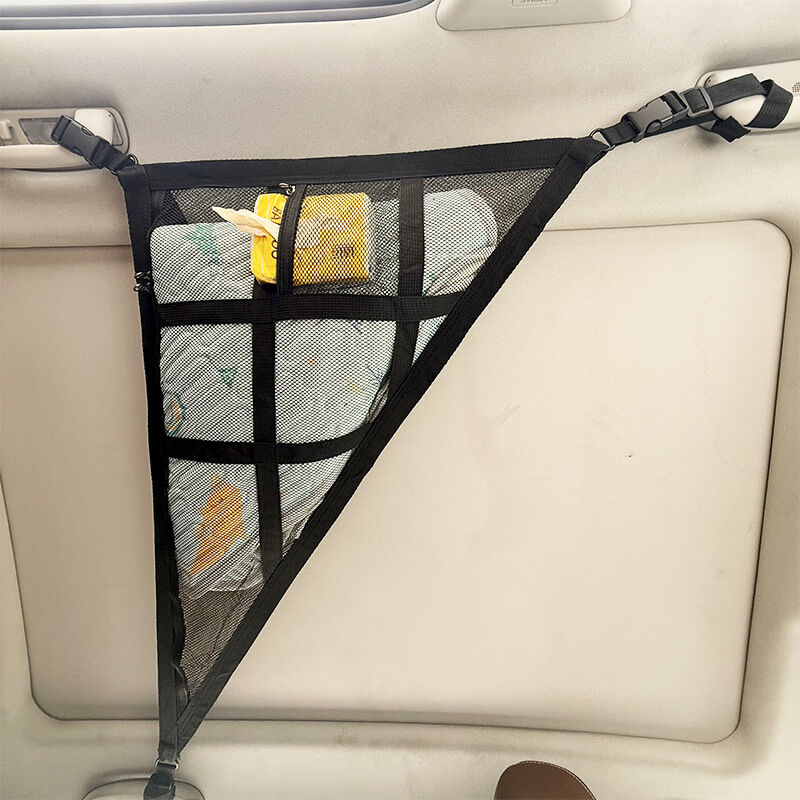 Maximize your car's storage space with this innovative triangular storage net. Perfect for organizing lightweight items, this ceiling-mounted storage net is designed for convenience and easy access while driving. With its adjustable straps and reinforced mesh pockets, it is a must-have for road trips, daily commutes, and keeping your car clutter-free.