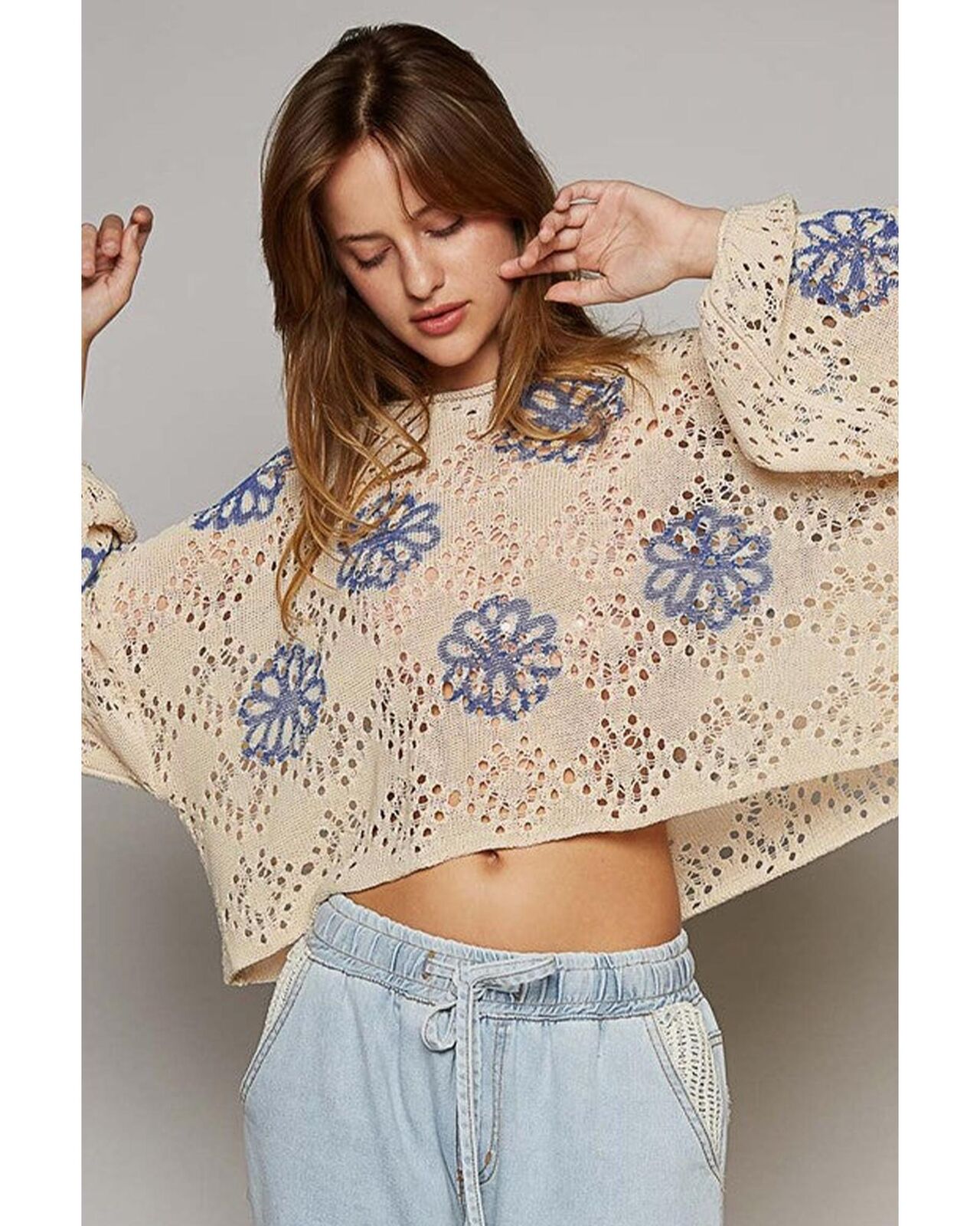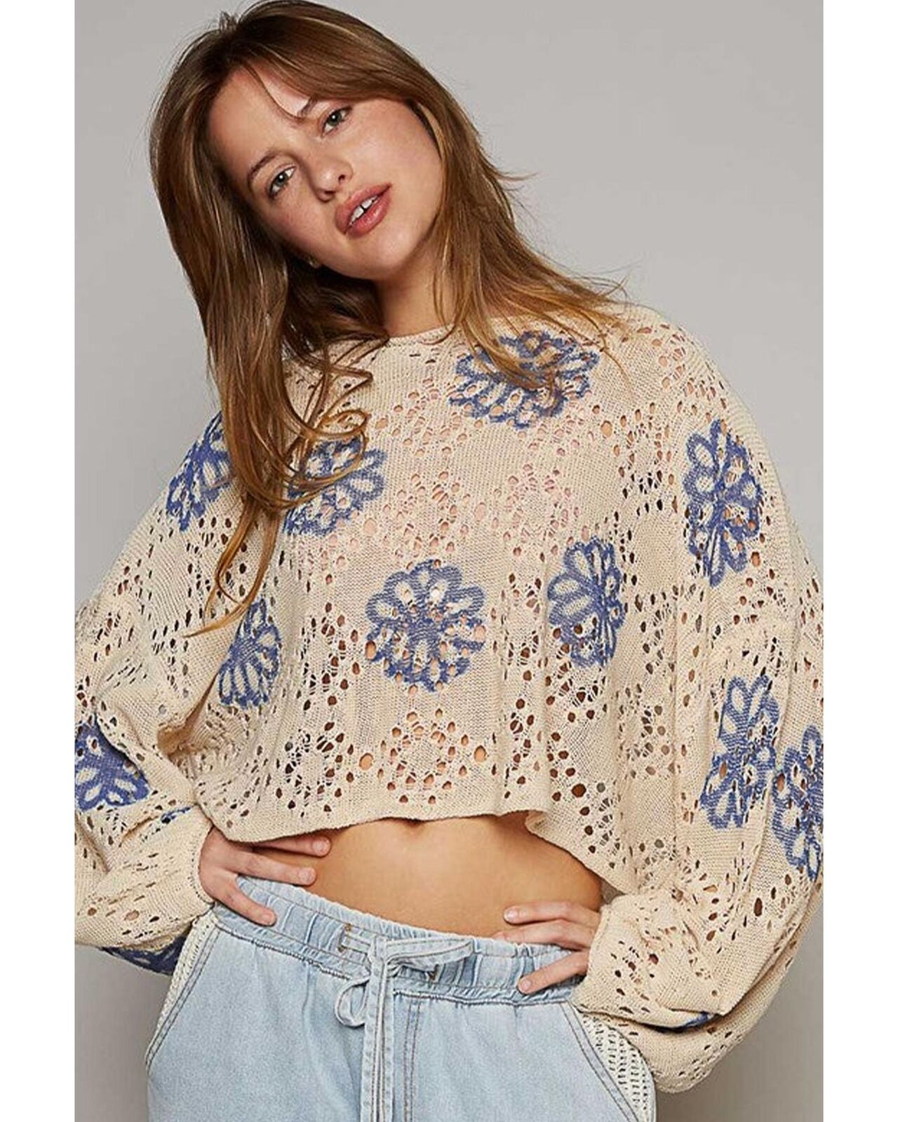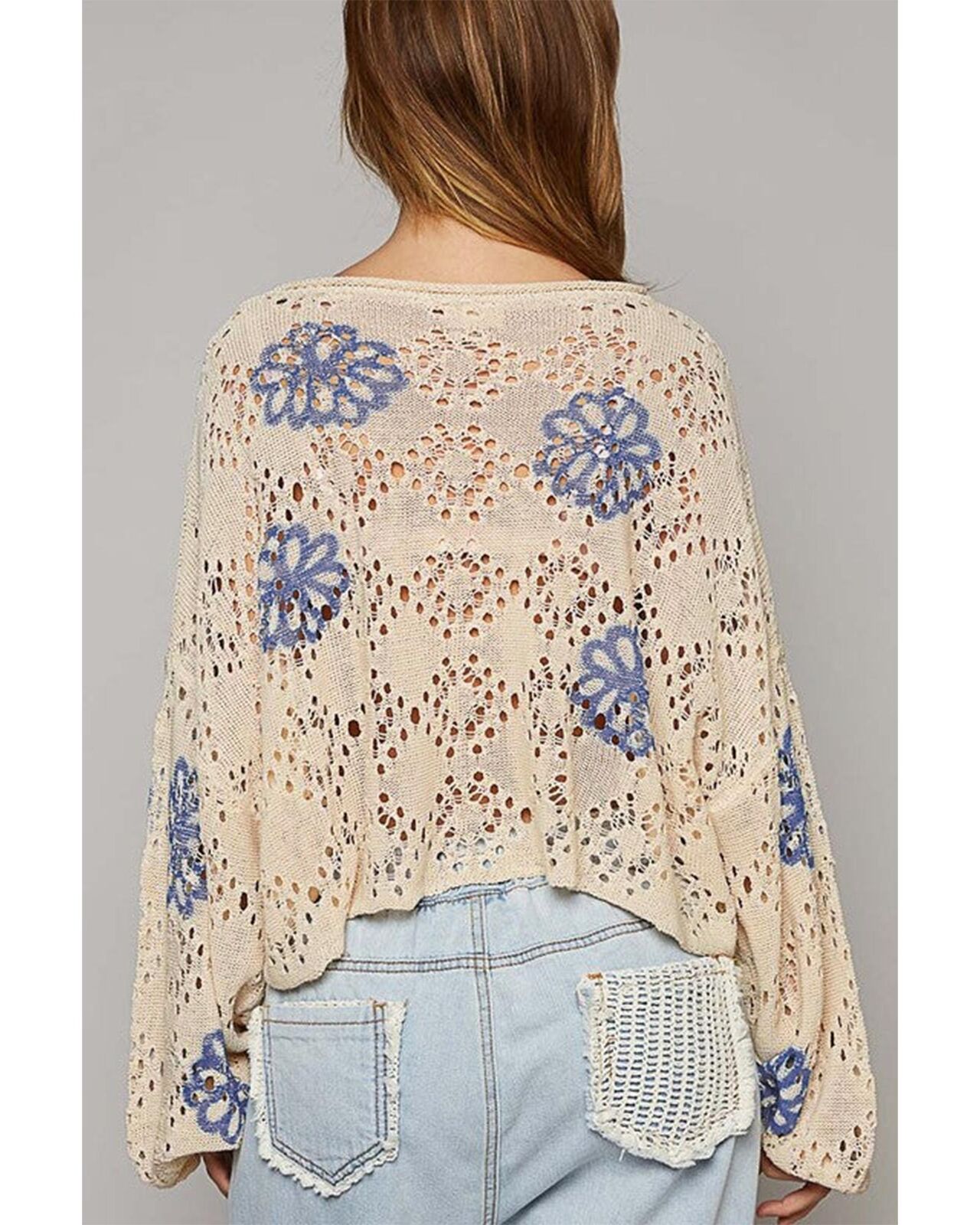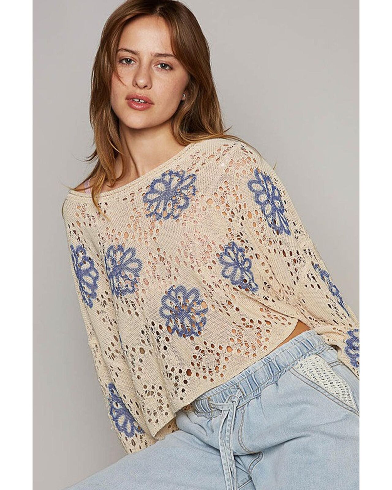 • Beige Contrast Flower Print Eyelet Drop Shoulder Sweater