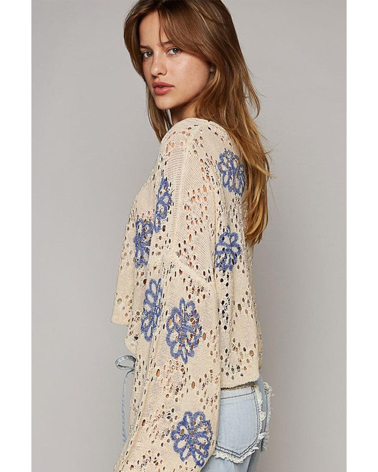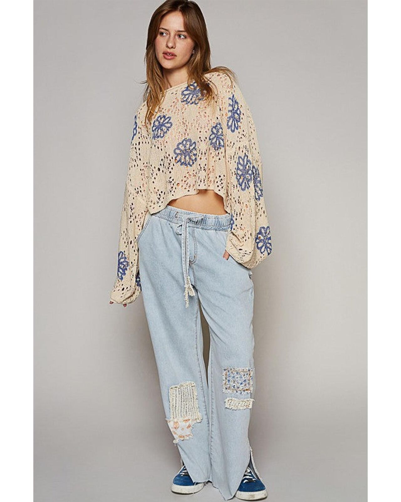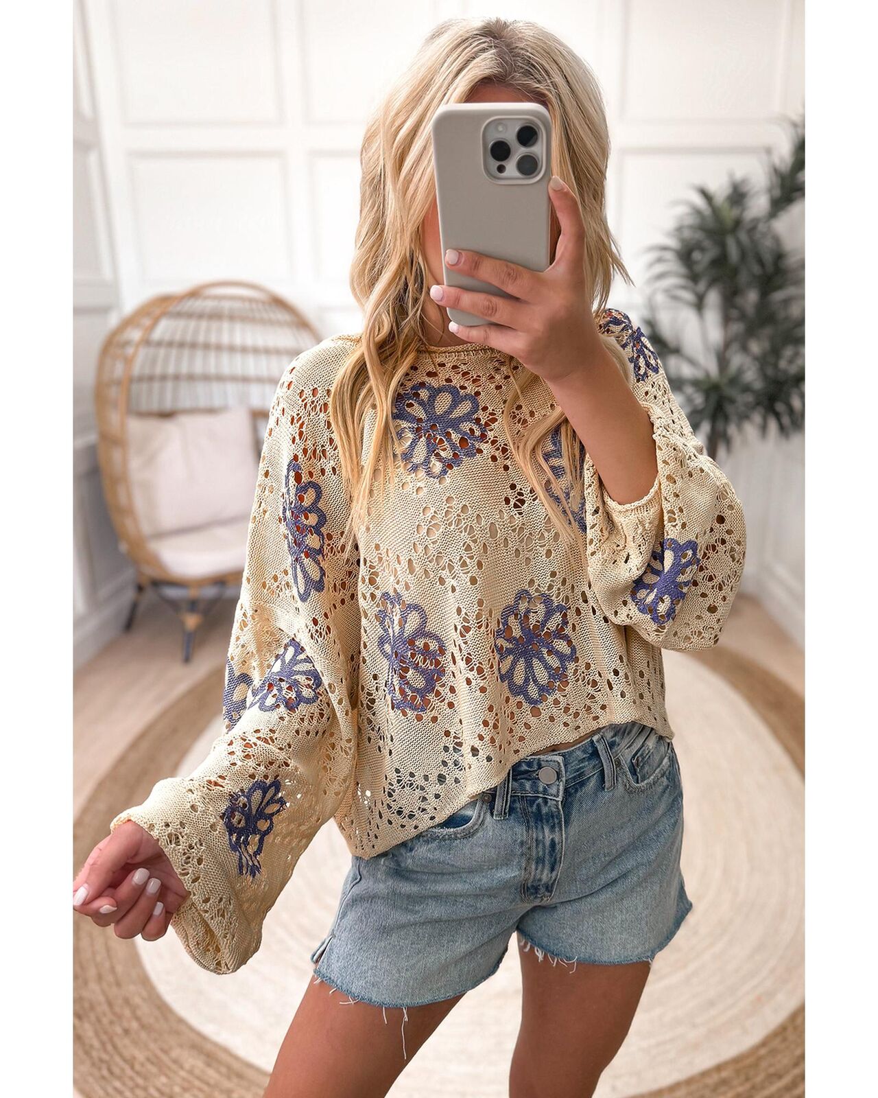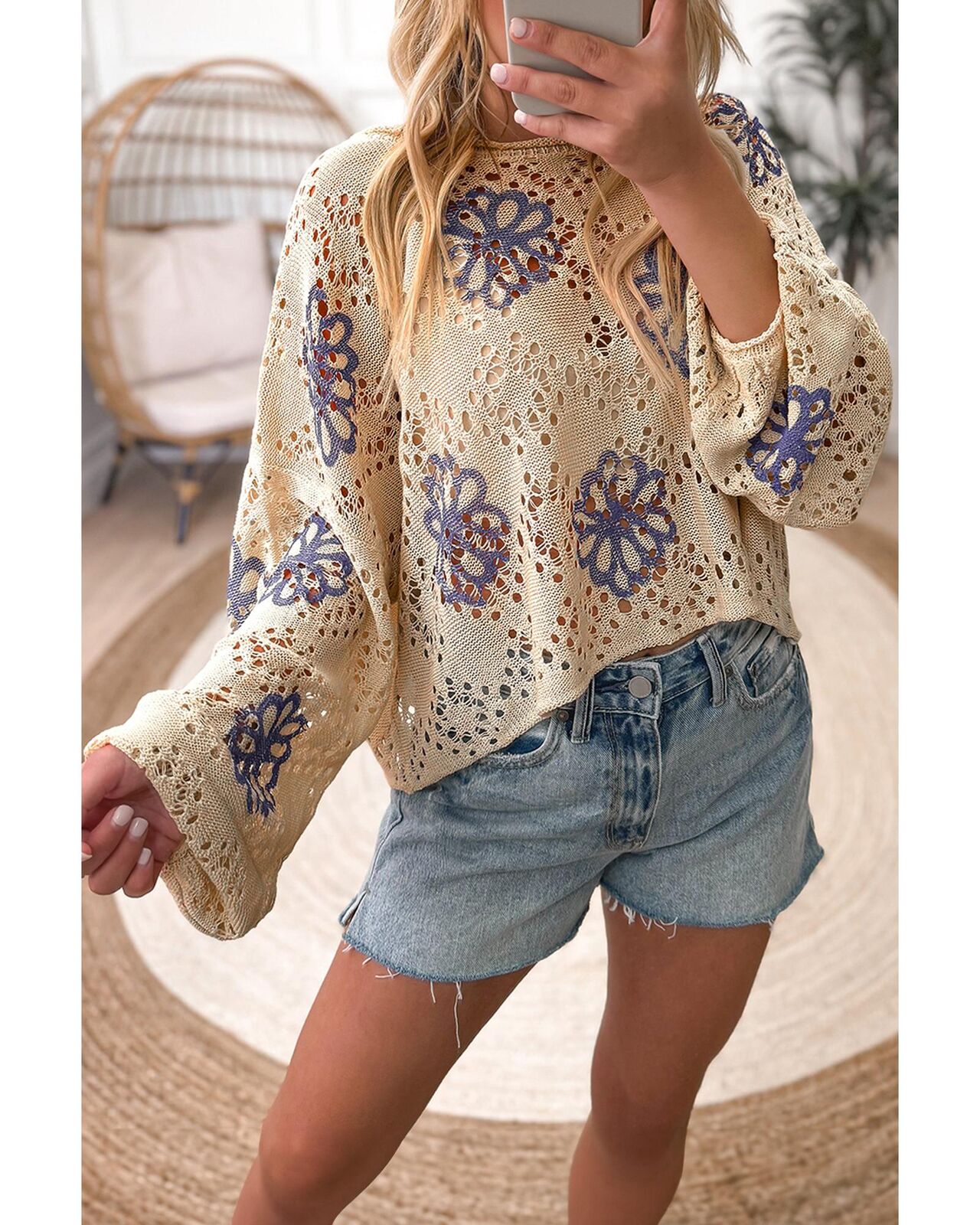 • Beige Contrast Flower Print Eyelet Drop Shoulder Sweater