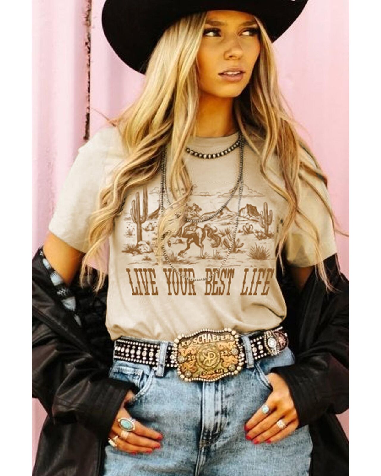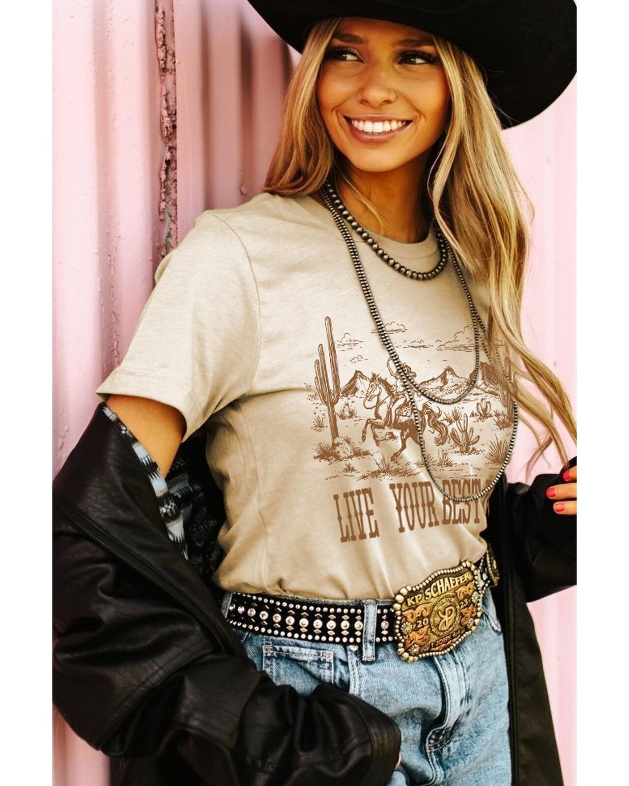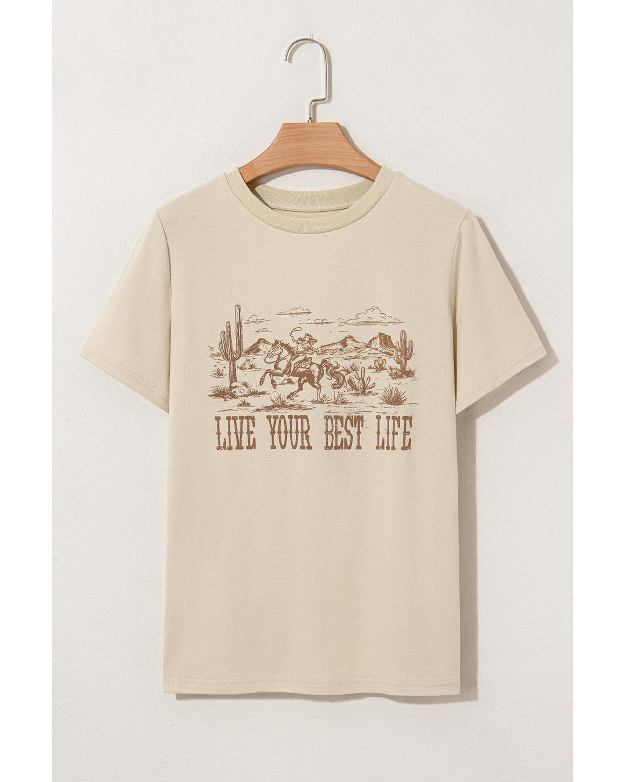 • Beige LIVE YOUR BEST LIFE Crew Neck Western Graphic Tee