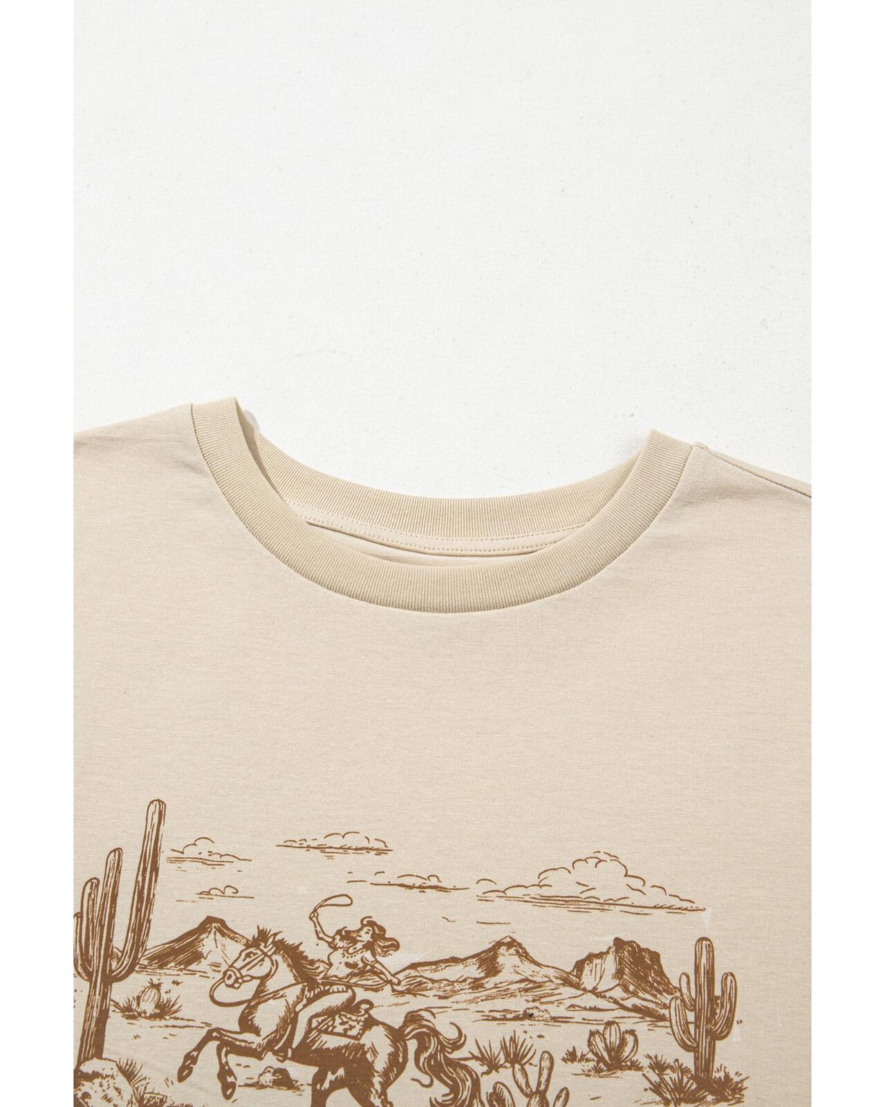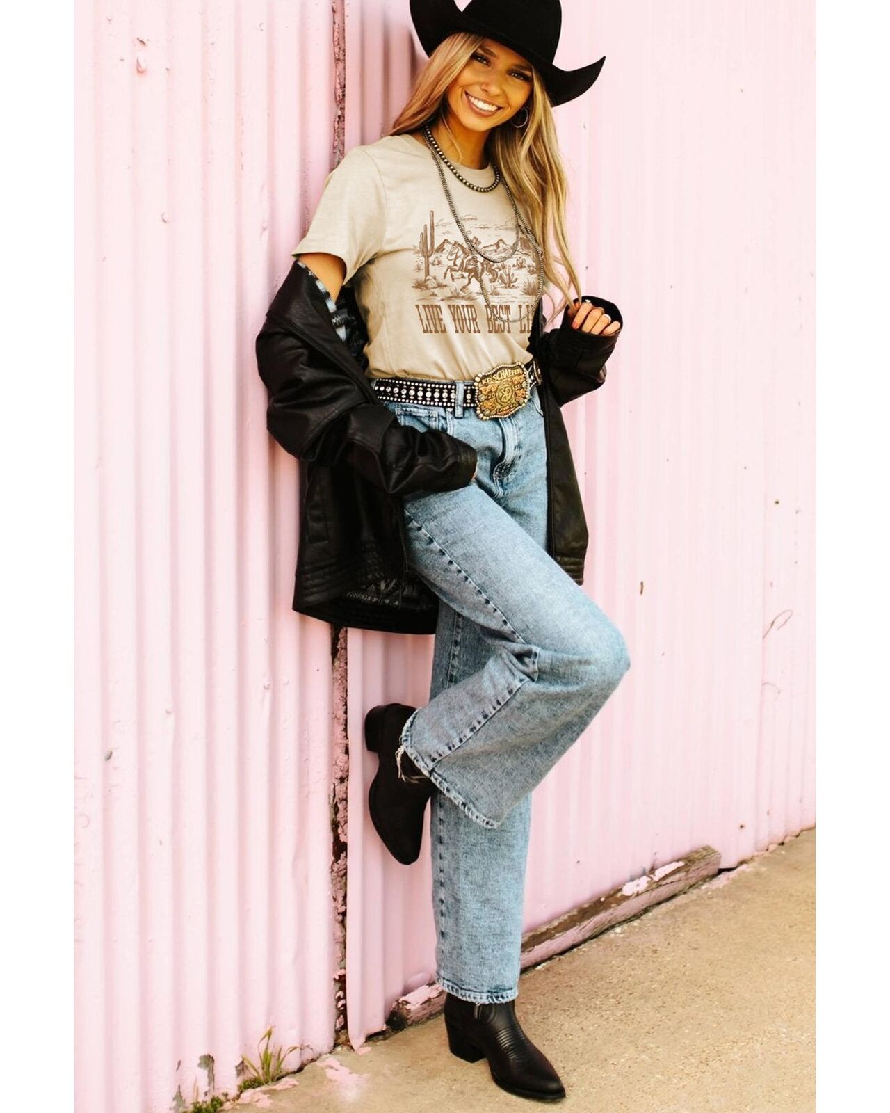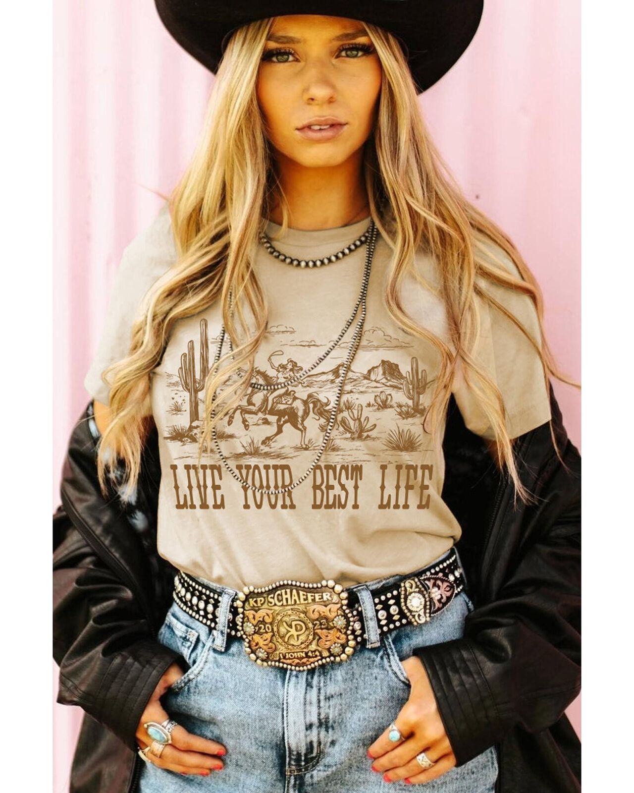 • Beige LIVE YOUR BEST LIFE Crew Neck Western Graphic Tee