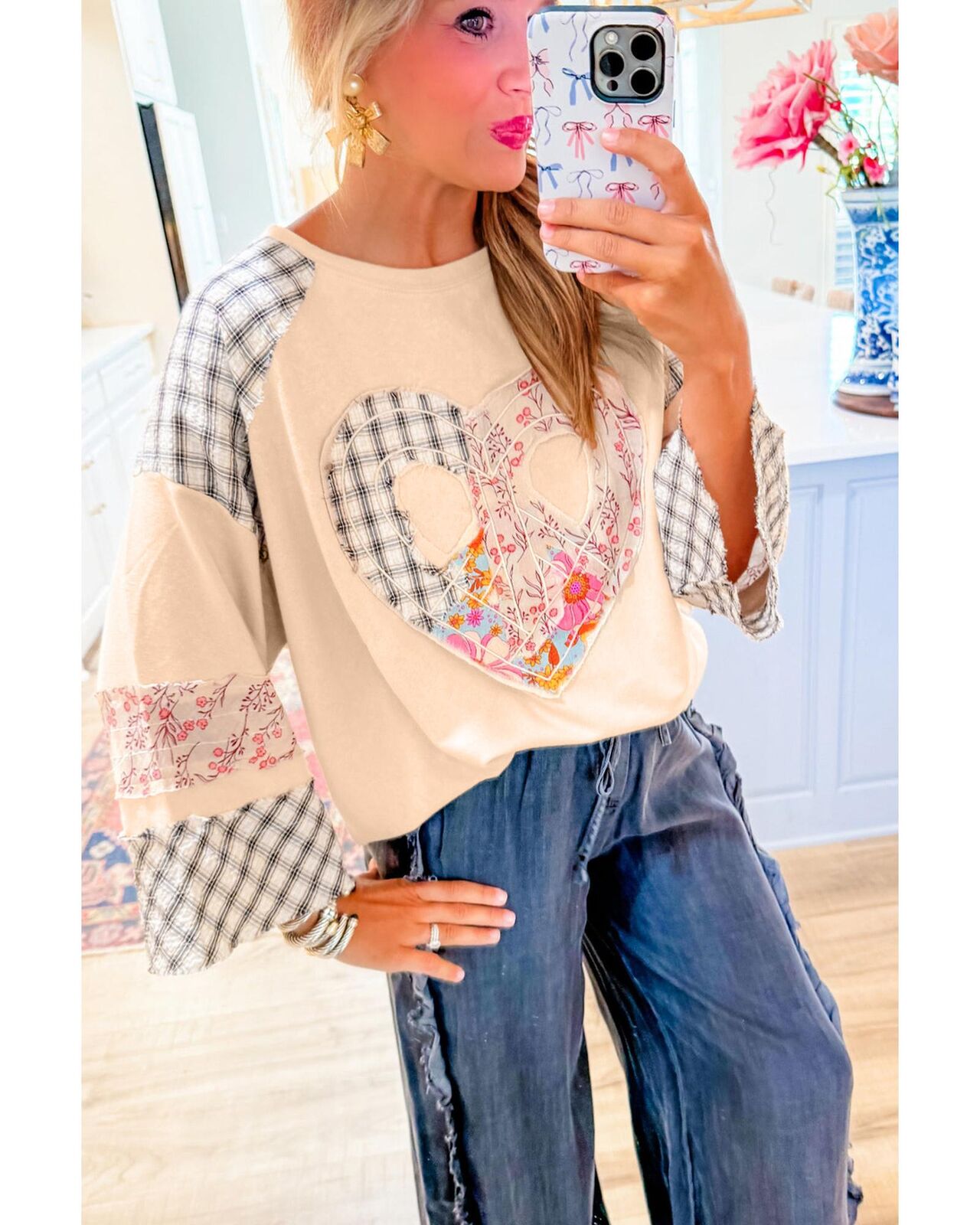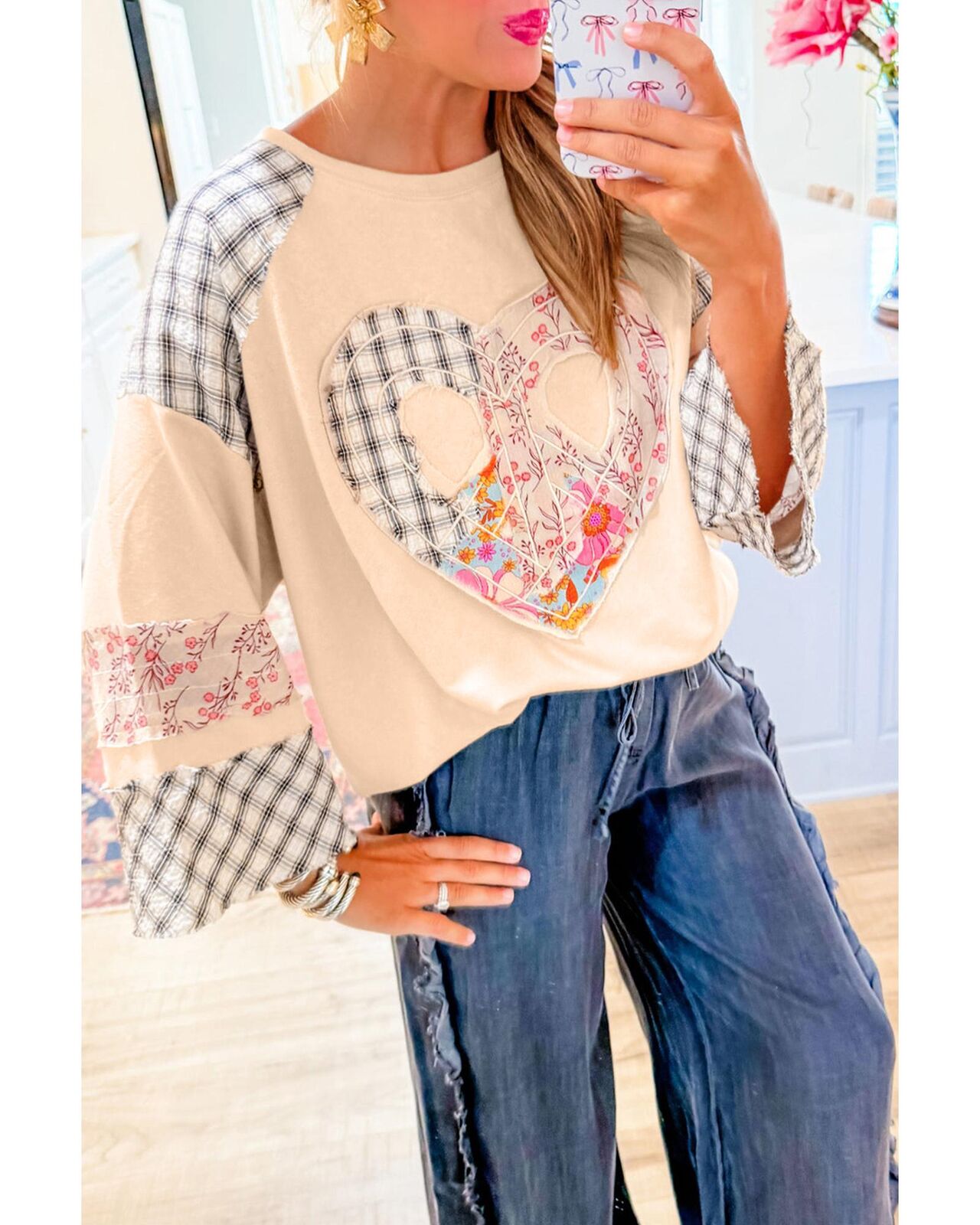• Beige plaid floral peace heart graphic top