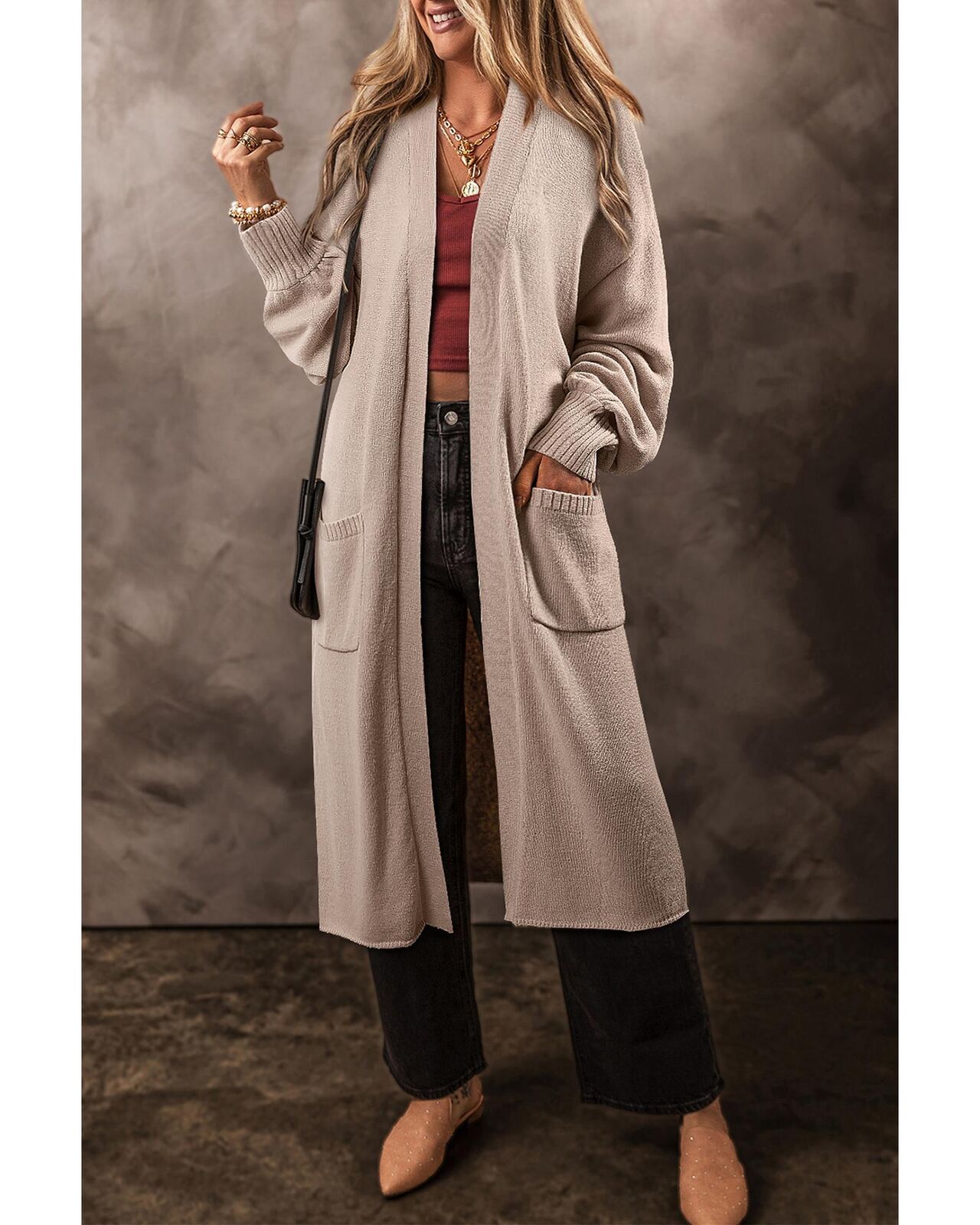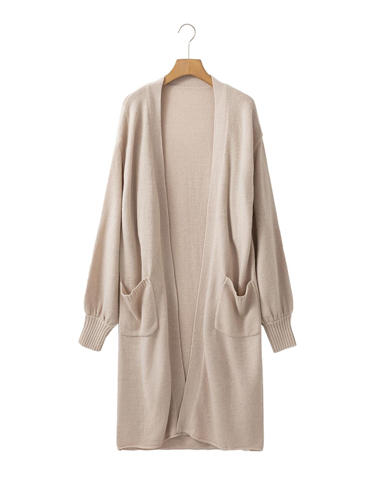 • Beige Side Pockets Open Front Long Knitted Cardigan