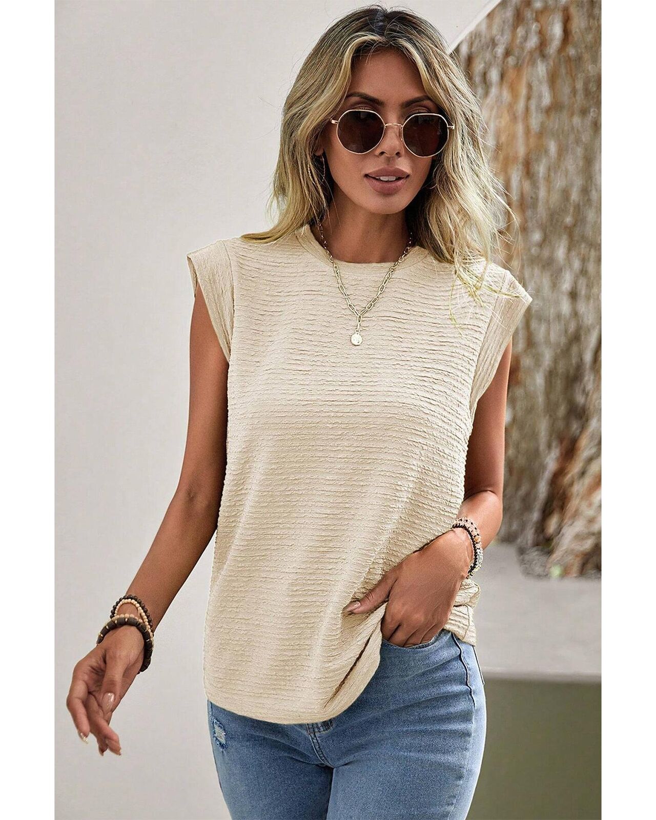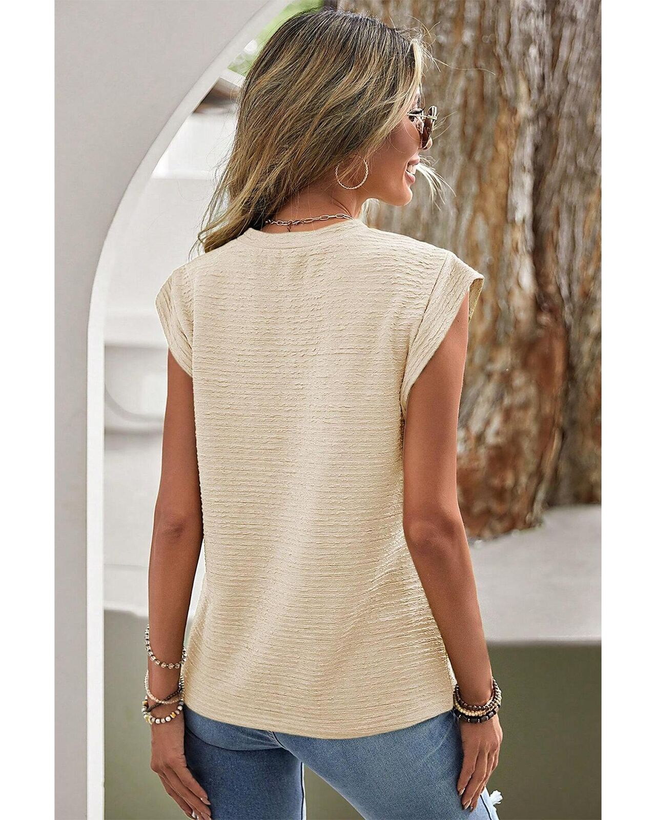 • Beige solid textured batwing sleeve crew neck t