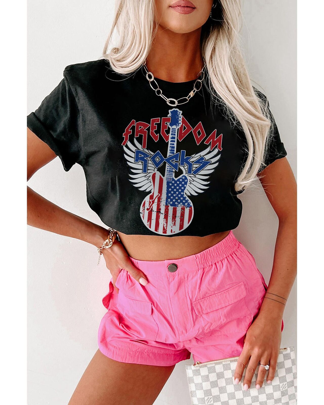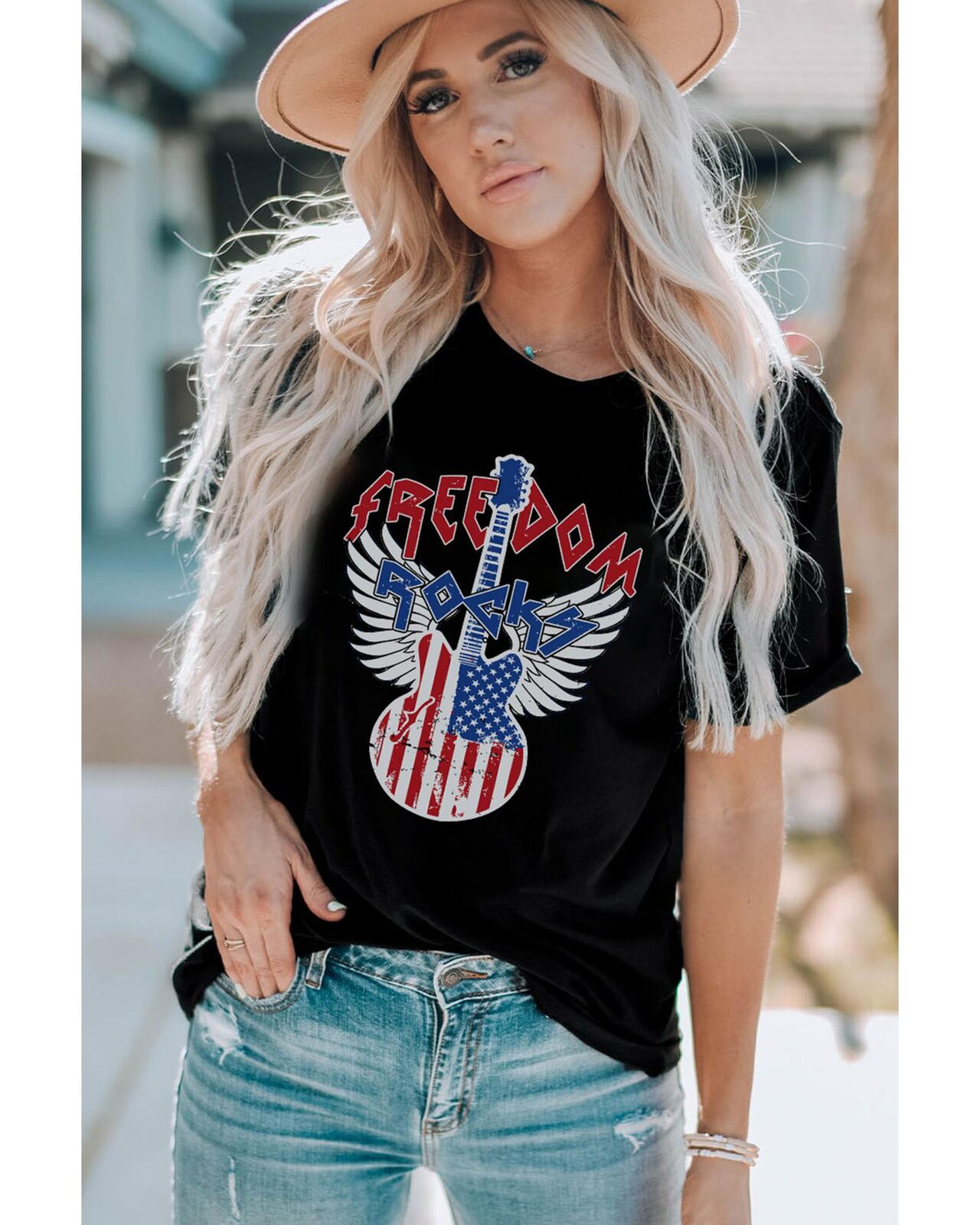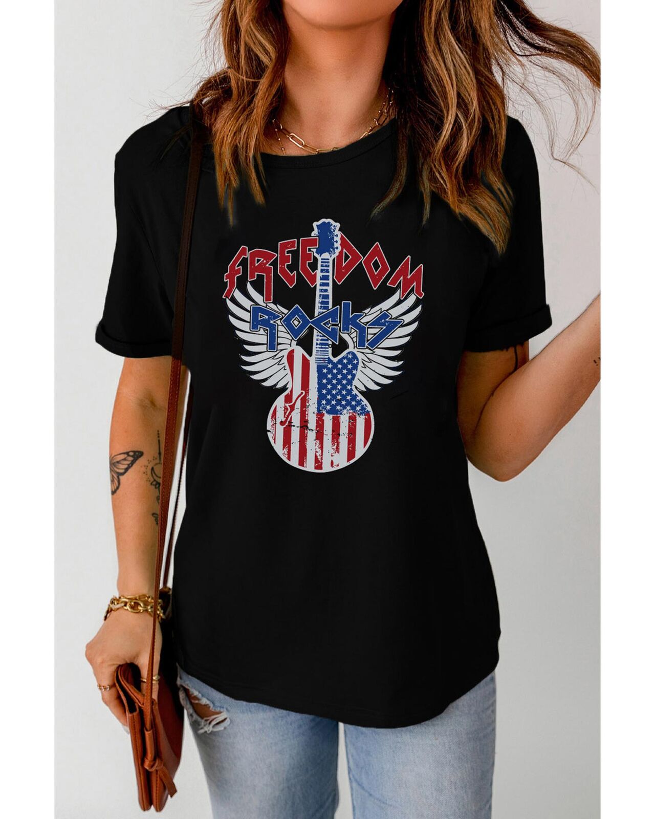 • Our styles are designed with a trendy fitted look in mind following an international size standard. For the best fit we suggest choosing one size up from your usual. Be sure to check our sizing chart to find your perfect match! Stylish Black American Flag Guitar Print Crew Neck Tee Graphic print of an American flag with a guitar Made from high