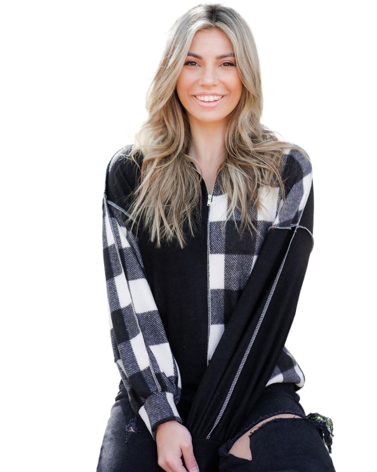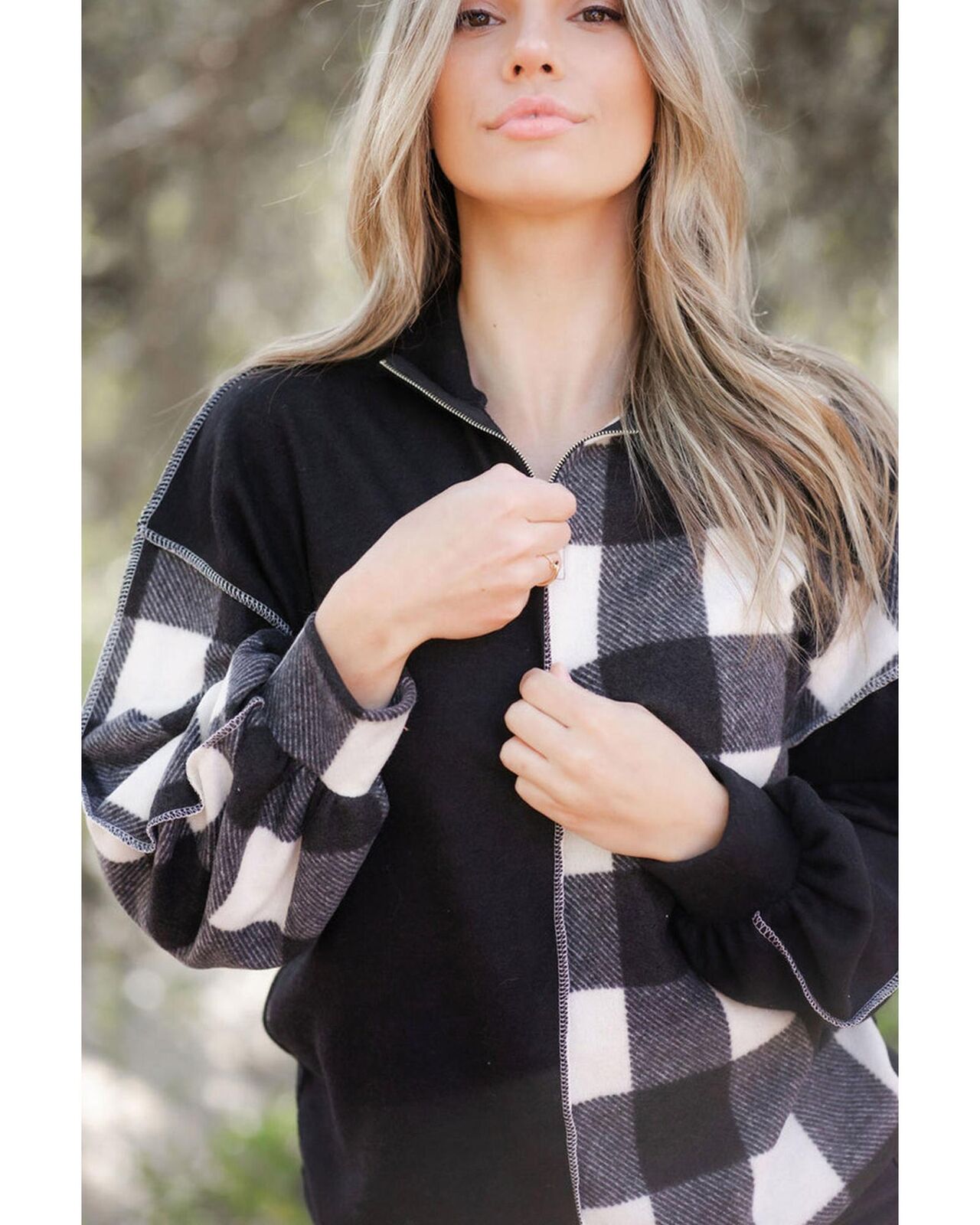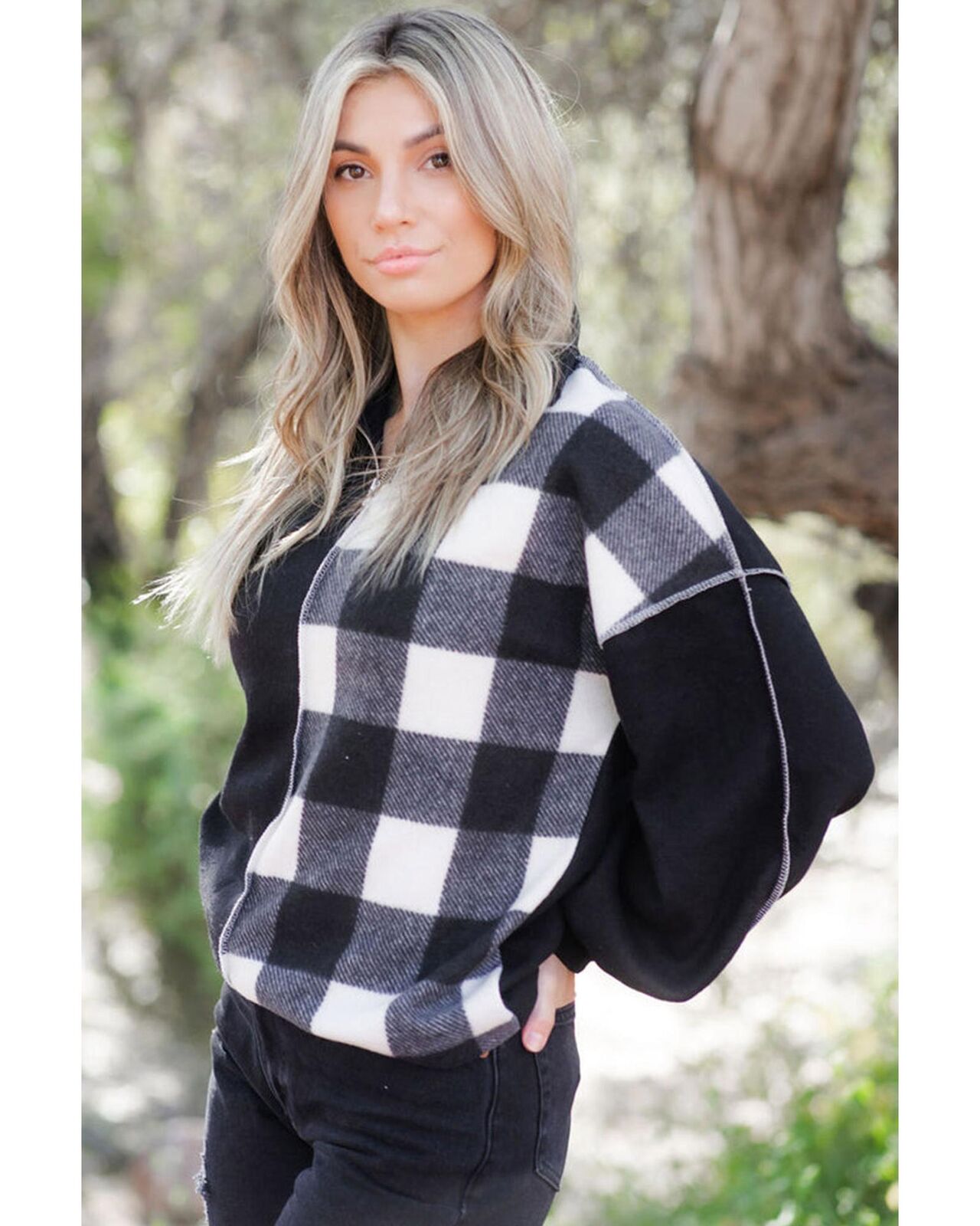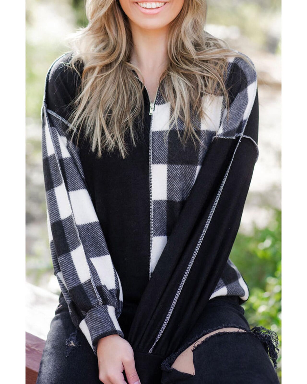 • Unisex Black Checkboard Patchwork Exposed Stitching Collared Top