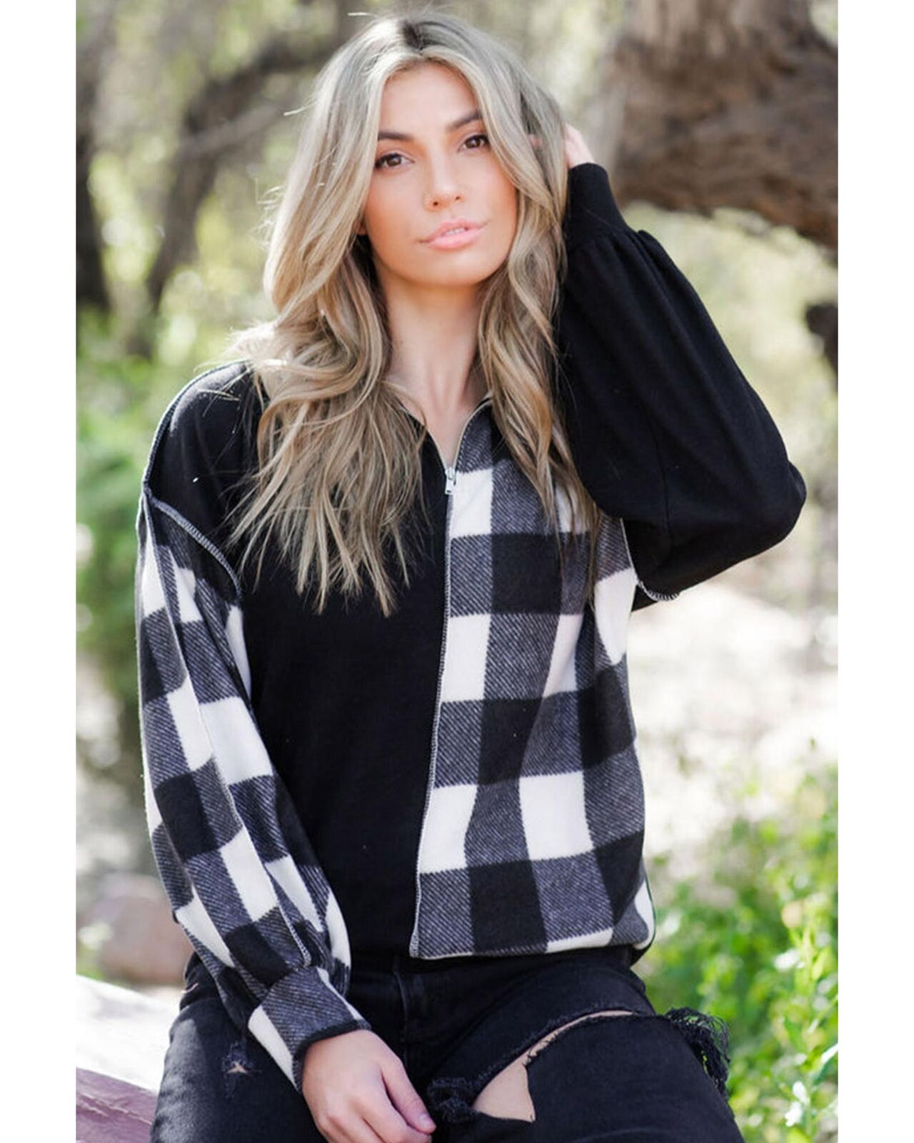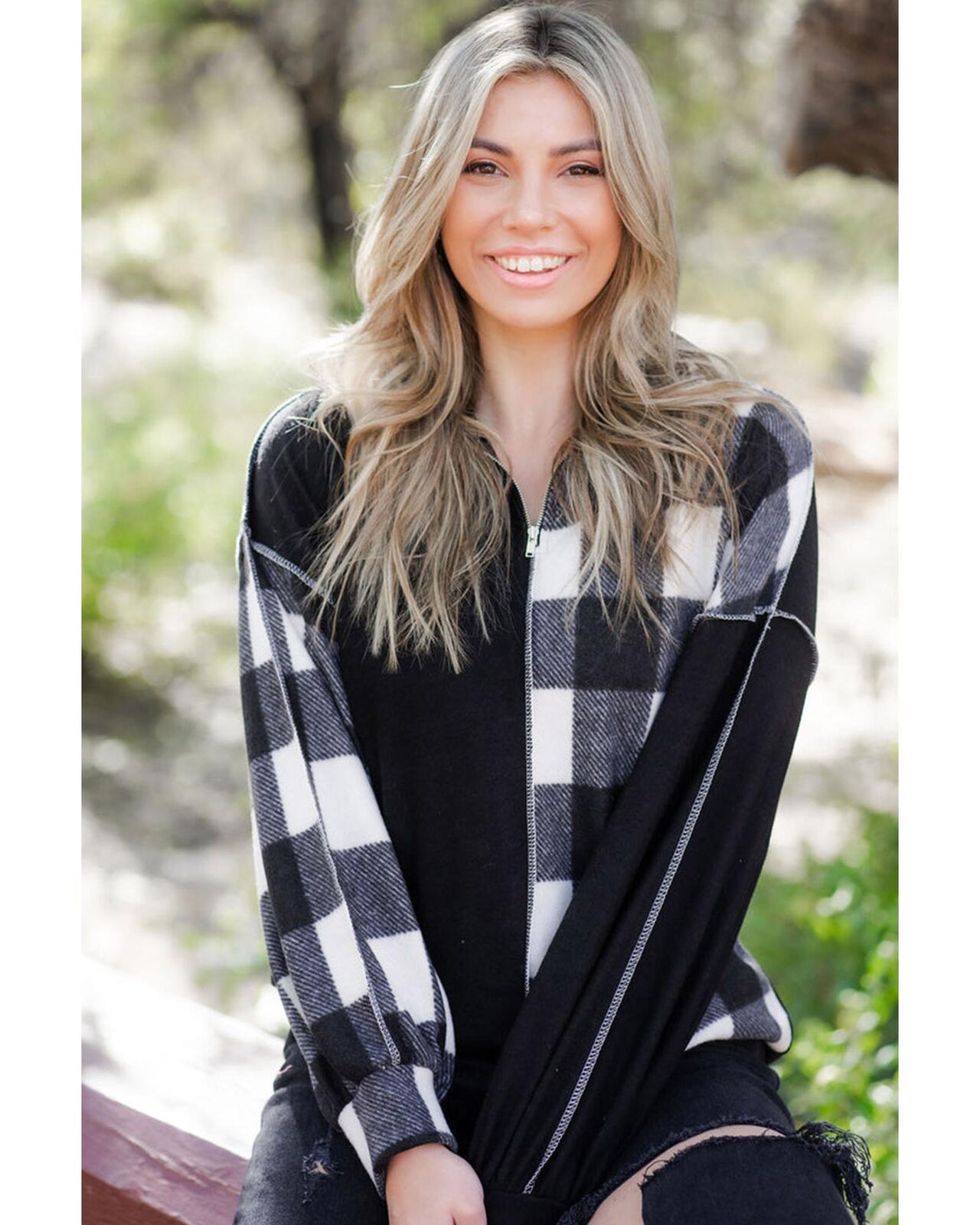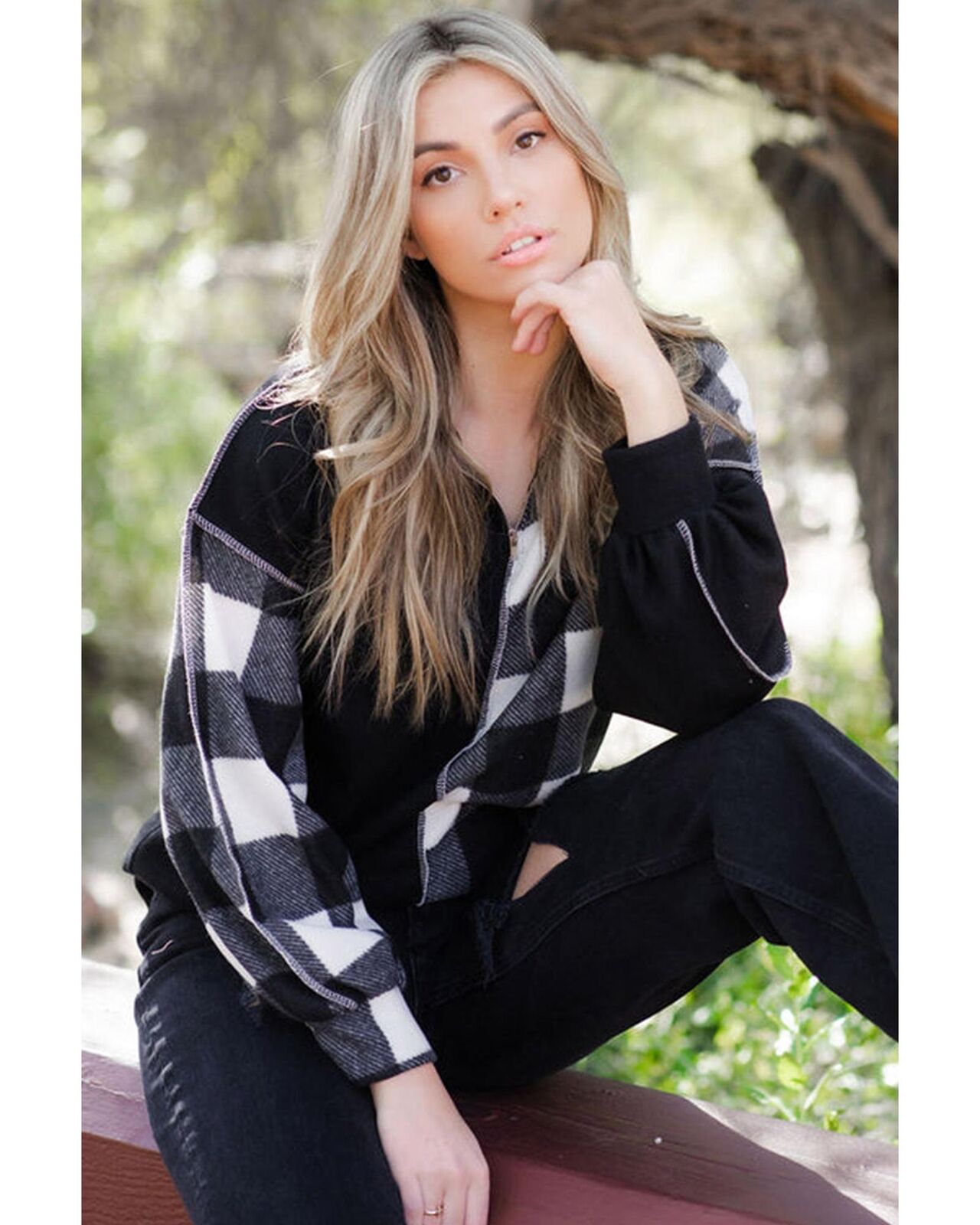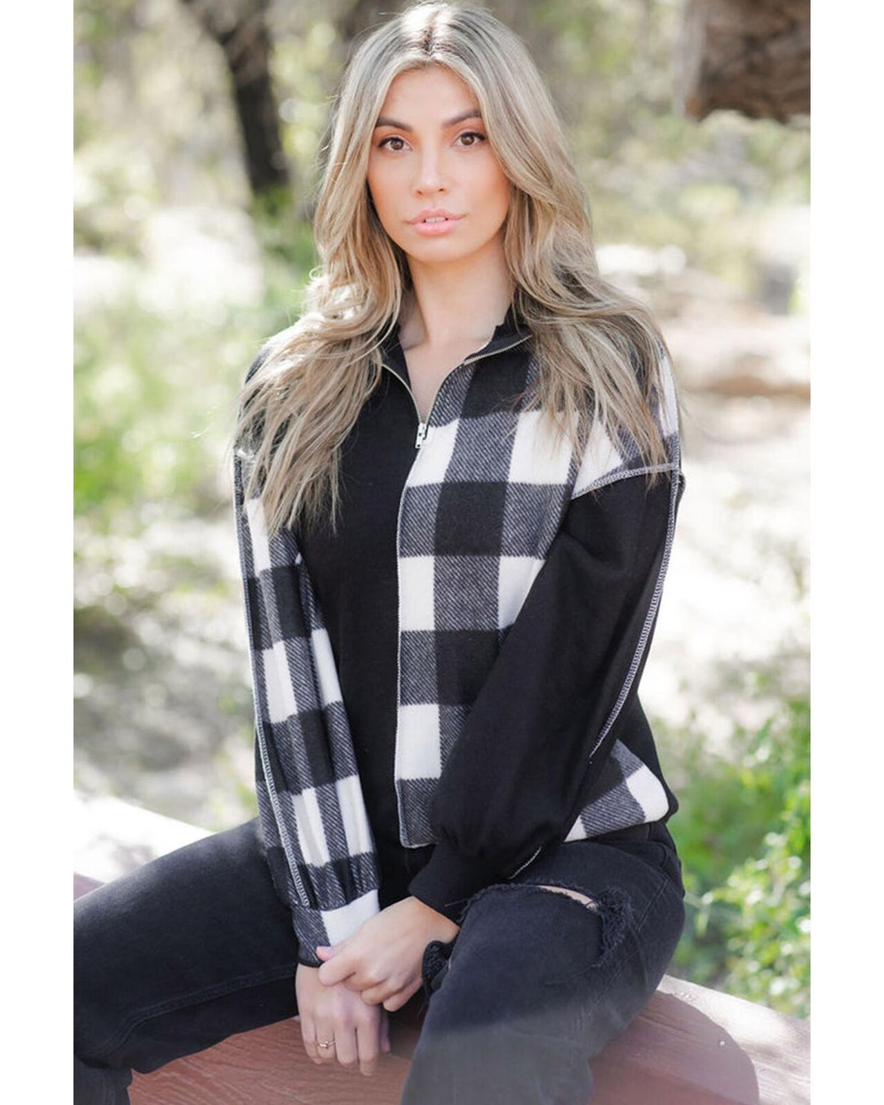 • Unisex Black Checkboard Patchwork Exposed Stitching Collared Top